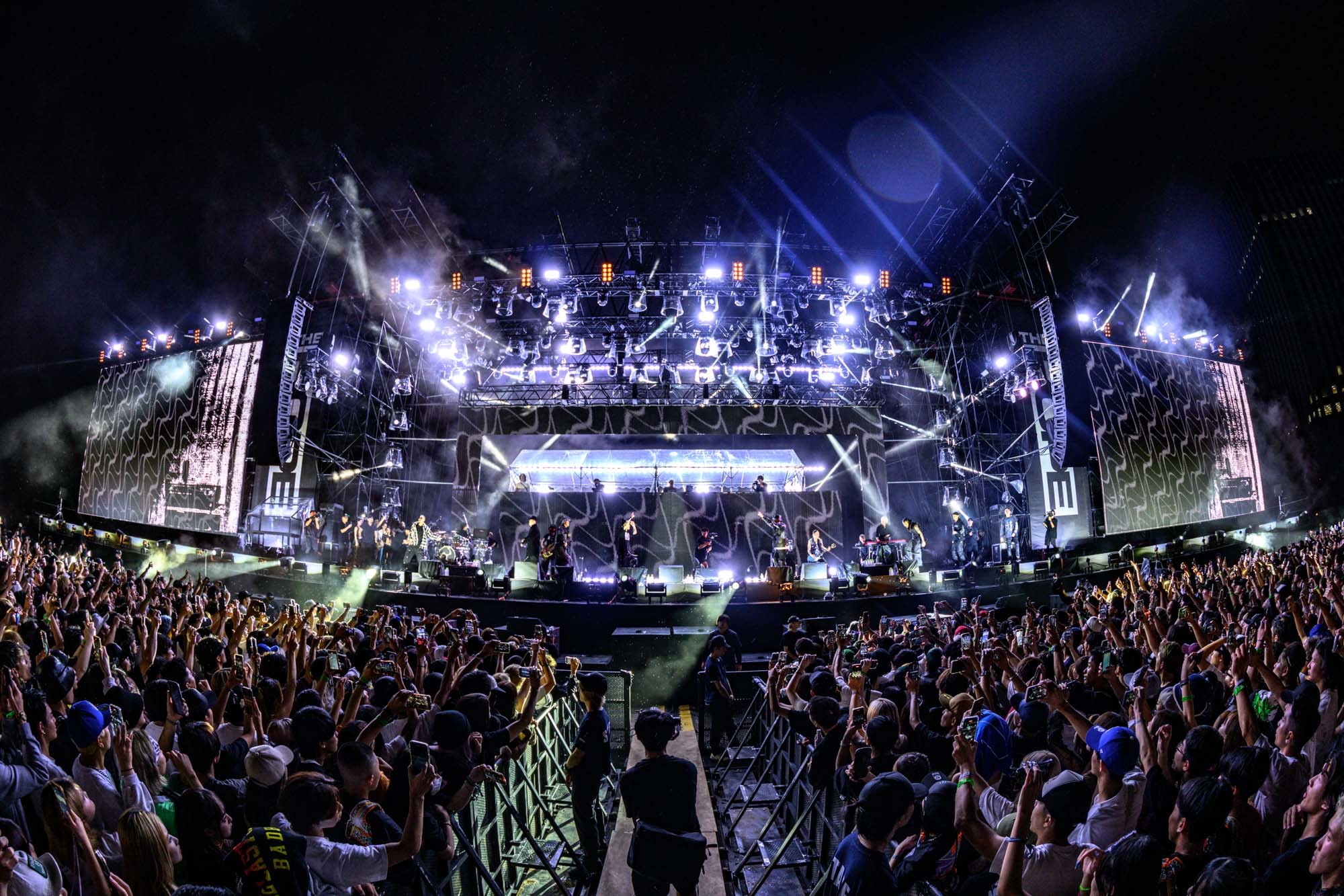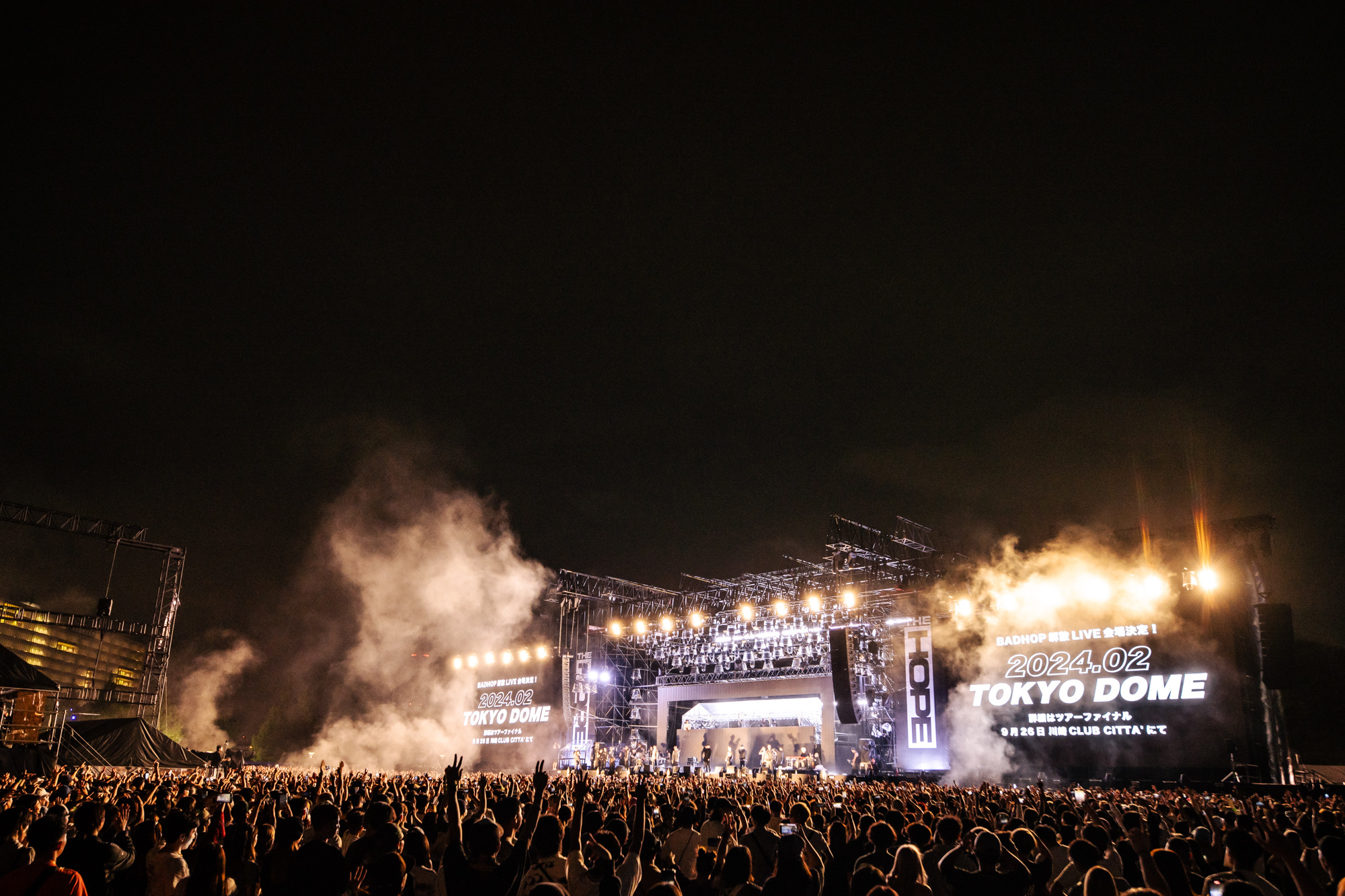さあ、ついにここまで来た。3万人の大観衆が8時間以上待ち続けた今日のファイナルアクト、BAD HOPの登場だ。ご存知の通り、来春にクルー解散を発表している彼らにとって、一回一回のステージはまさにメモリアル。バンドを従えての特別編成で、1曲目「Kawasaki Drift」からとんでもないパワーで一気に飛ばす。しかもメンバーは金子ノブアキ(Dr)、Kenken(B)、masasucks(G)、伊澤一葉(Key)という、夏のフジロックフェスティバルを再現する最強メンツだ。体にぶつかって来る音の感触はヒップホップでありながらラウドロックに近く、うねりのある重たいグルーヴの上で8MCが個性あふれるラップをぶつけあう。「Friends」「High Land」などイントロから大歓声、フックに至るまでオーディンエンス全員が歌いまくる光景が現出し、ラップをJ-POPやロックと同じレベルで聴き取って盛り上がれる層がついに根付いたことを、目と耳でしっかりと実感する。まさしく80年代から続く日本語ラップの歴史のここが最先端。「解散ライブ、2024年2月、東京ドームでやります」と、T-Pablowのアナウンスに応えて湧きあがった怒号のような大歓声が、今も耳を離れない。