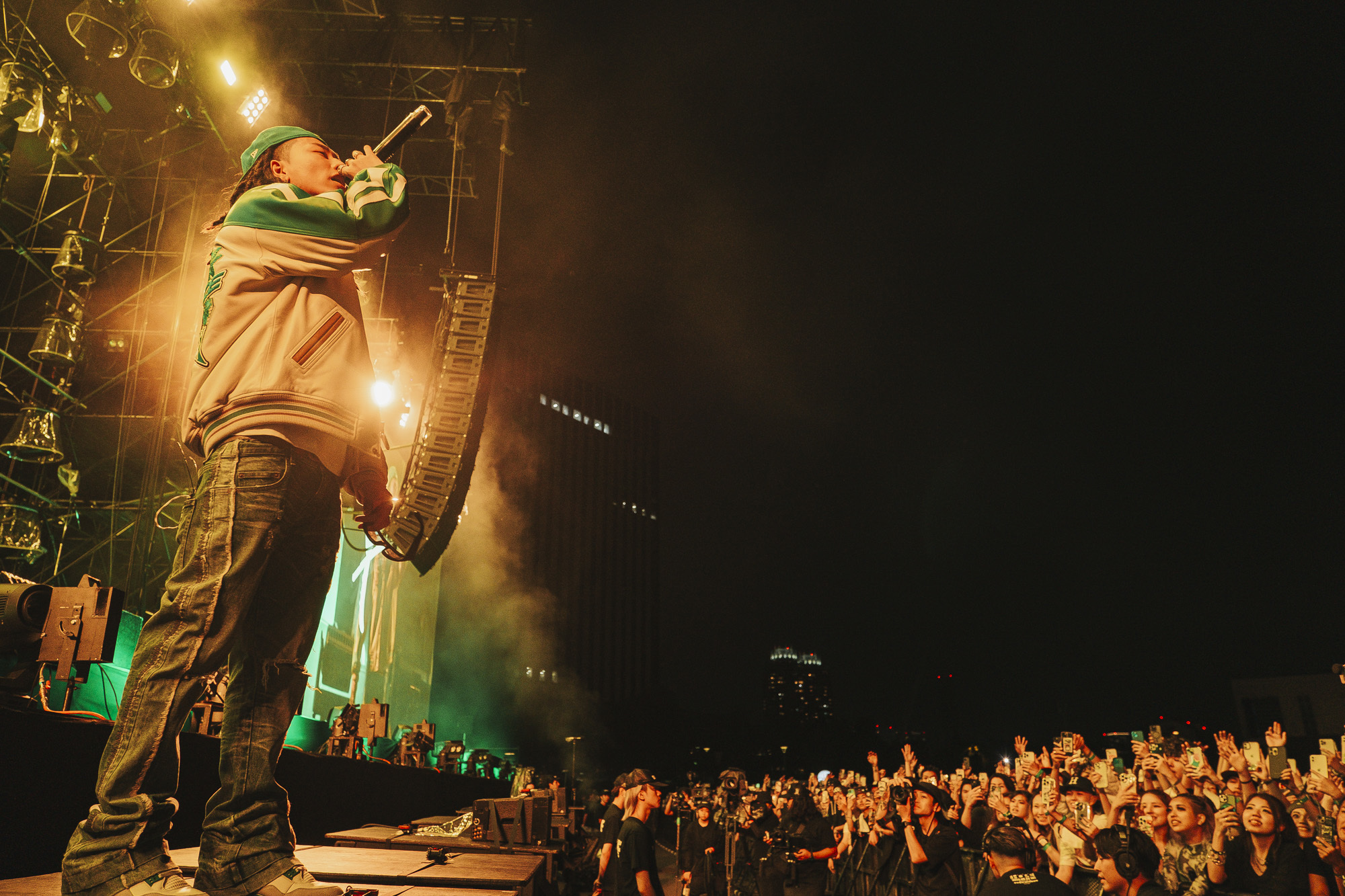 イベントもそろそろ中盤だ。Eric.B.Jrが「本当のヒップホップを教えてやるよ」というかっこいいセリフを吐き、ジャパニーズマゲニーズがイリーガルな際どいMCで会場を沸かせる。それぞれが信じるヒップホップを体現する中、コールされた瞬間に3万人を一斉に立ち上がらせたのは舐達麻だ。プロフィールを見てもヤバいことしか書いてない、筋金入りのストリート出身者が3万人のヘッズたちに歓迎される理由は、曲が響くからの一点に尽きる。壮絶な経験を歌っているのに現代詩のように聴こえるリリシズム。賽 a.k.a. BADSAIKUSH、G-PLANTS、DELTA9KIDの三者三様の飛びぬけた個性。「ANGELA」ではANARCHYと、「OUTLAW」では突如現れたAwichと共に熱狂の渦を巻き起こす。人気と実力が完全にかみ合った、圧巻のパフォーマンス。
