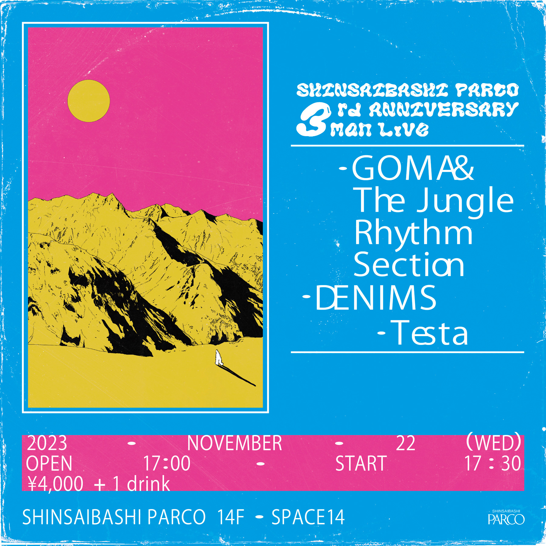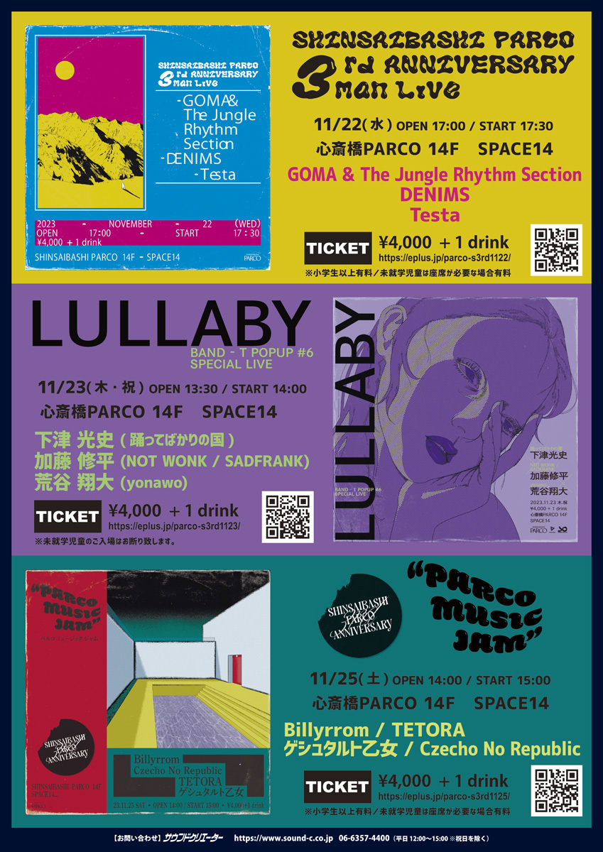 この3周年記念イベントは、心斎橋PARCOの14F・SPACE14にて開催され、11月22日(水)は『心斎橋PARCO 3rd ANNIVERSARY 3man LIVE』と題して、GOMA & The Jungle Rhythm Section、DENIMS、Testaが登場。