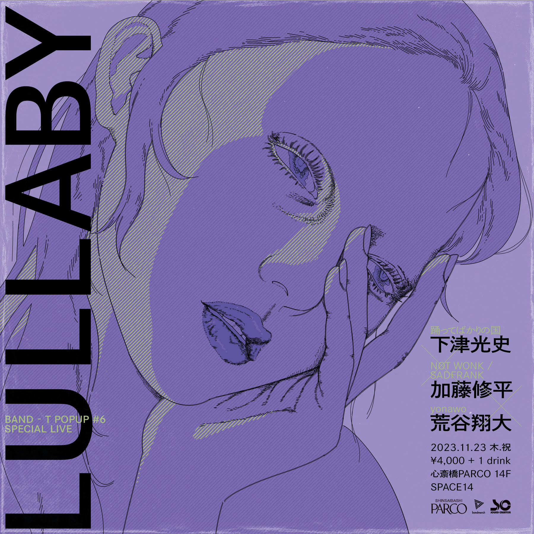 11月23日(木祝)は、バンドTシャツを専門で取り扱う・Bandmerchと関西のイベンター・サウンドクリエーターが企画する『Lullaby -BAND-T POPUP #6 SPECIAL LIVE -』に、下津光史(踊ってばかりの国)、加藤修平(NOT WONK/ SADFRANK)、荒谷翔大(yonawo)が出演。