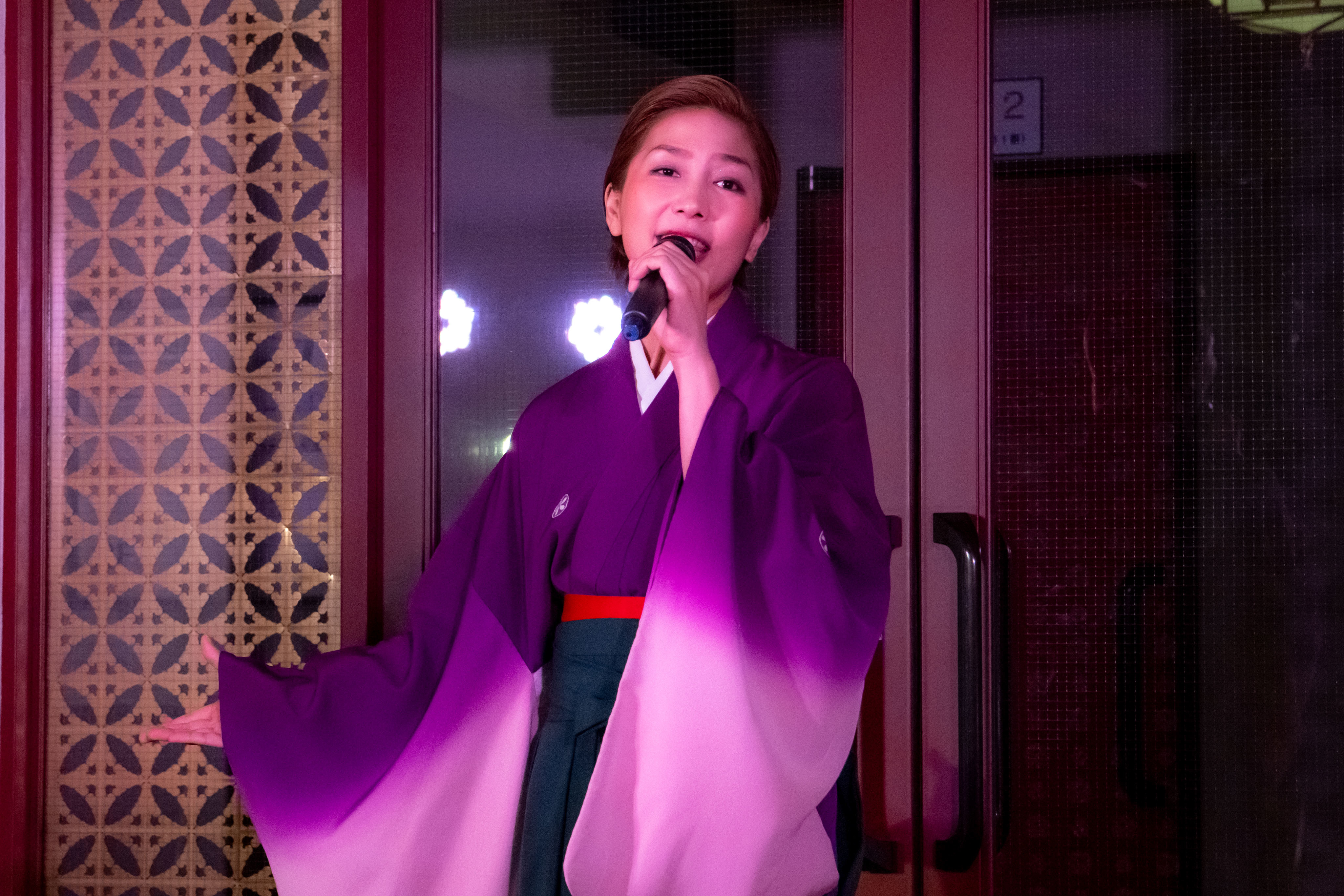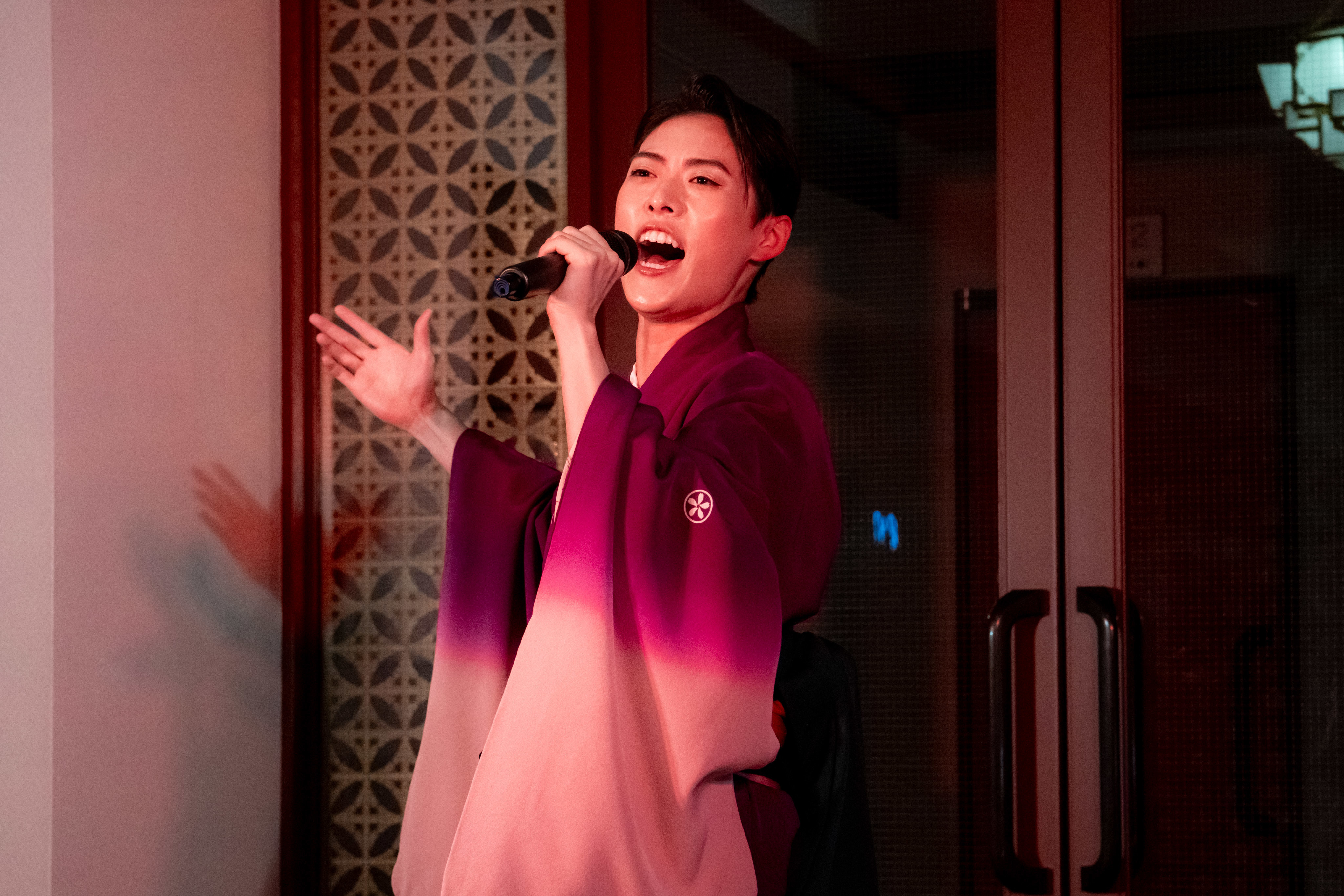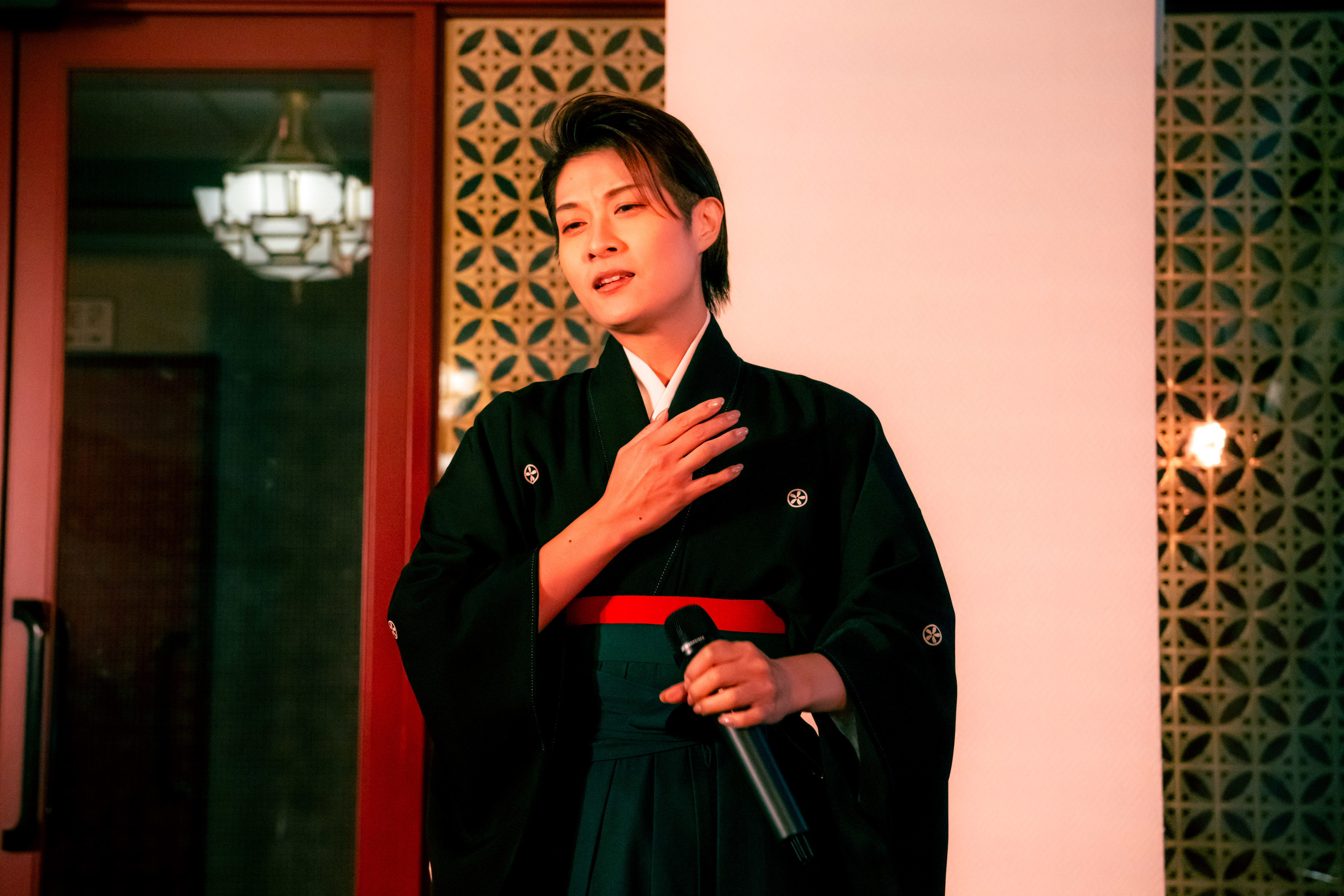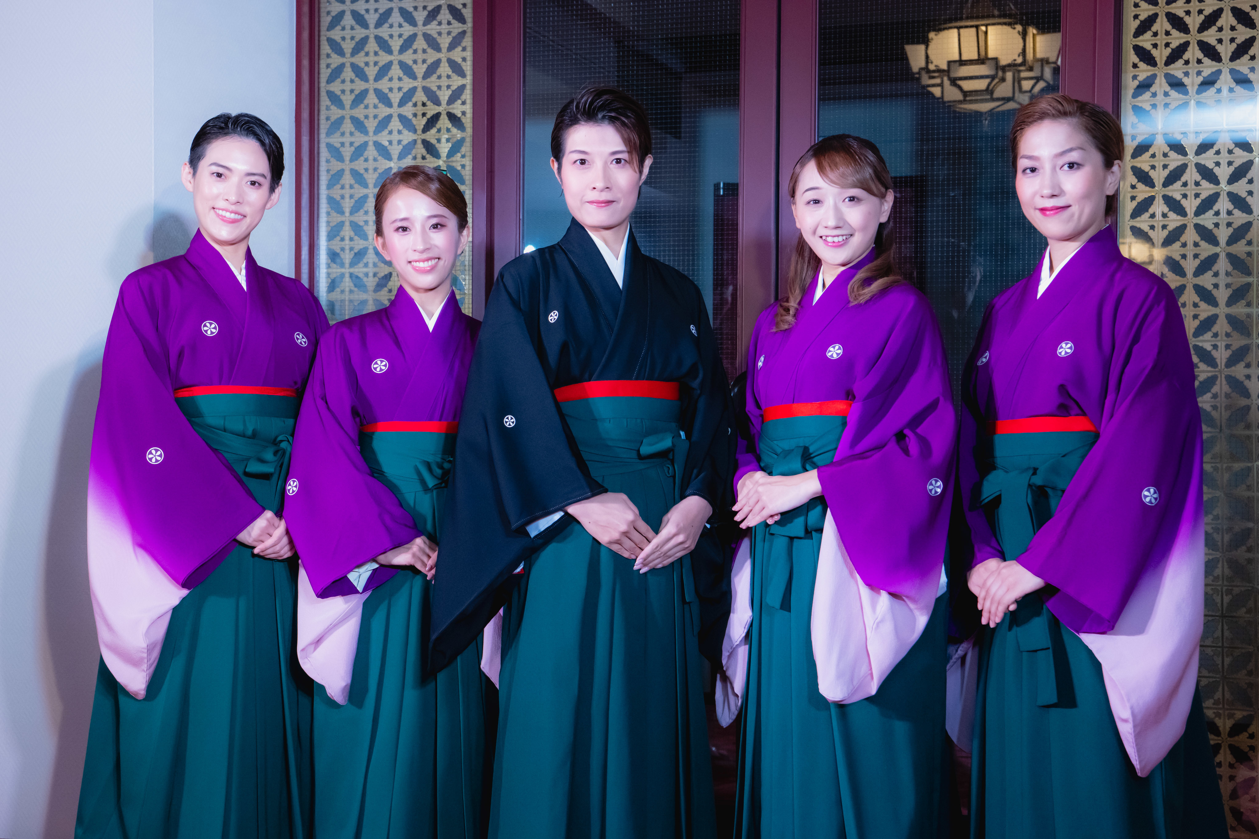 普段は観客たちで賑わう、南座2階のロビー。上演向けのスペースでもなく、しかも微妙に狭い。本当にここが会場なのか? こんな所で楽曲を披露しても、あのOSKの華やかさは伝わらないのでは? などと、始まる前は正直考えた。しかし蓋を空けてみると、彼女たちは見事に歌声だけで、その場に居合わせた人々を非日常へといざなってくれた。よく考えたら、OSKのスターたちが袴姿&ほぼ素顔で歌うというのは、貴重な機会かもしれない。