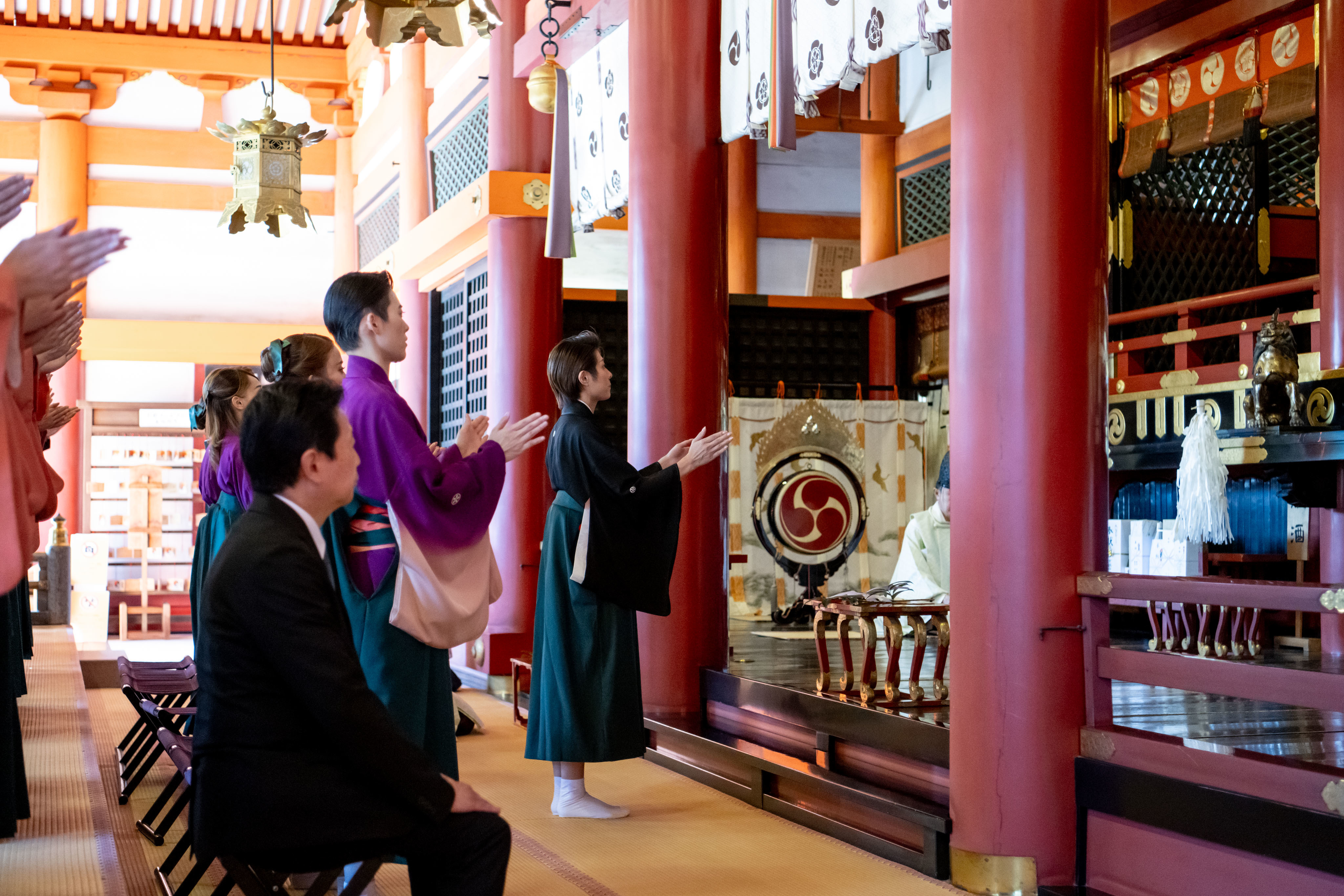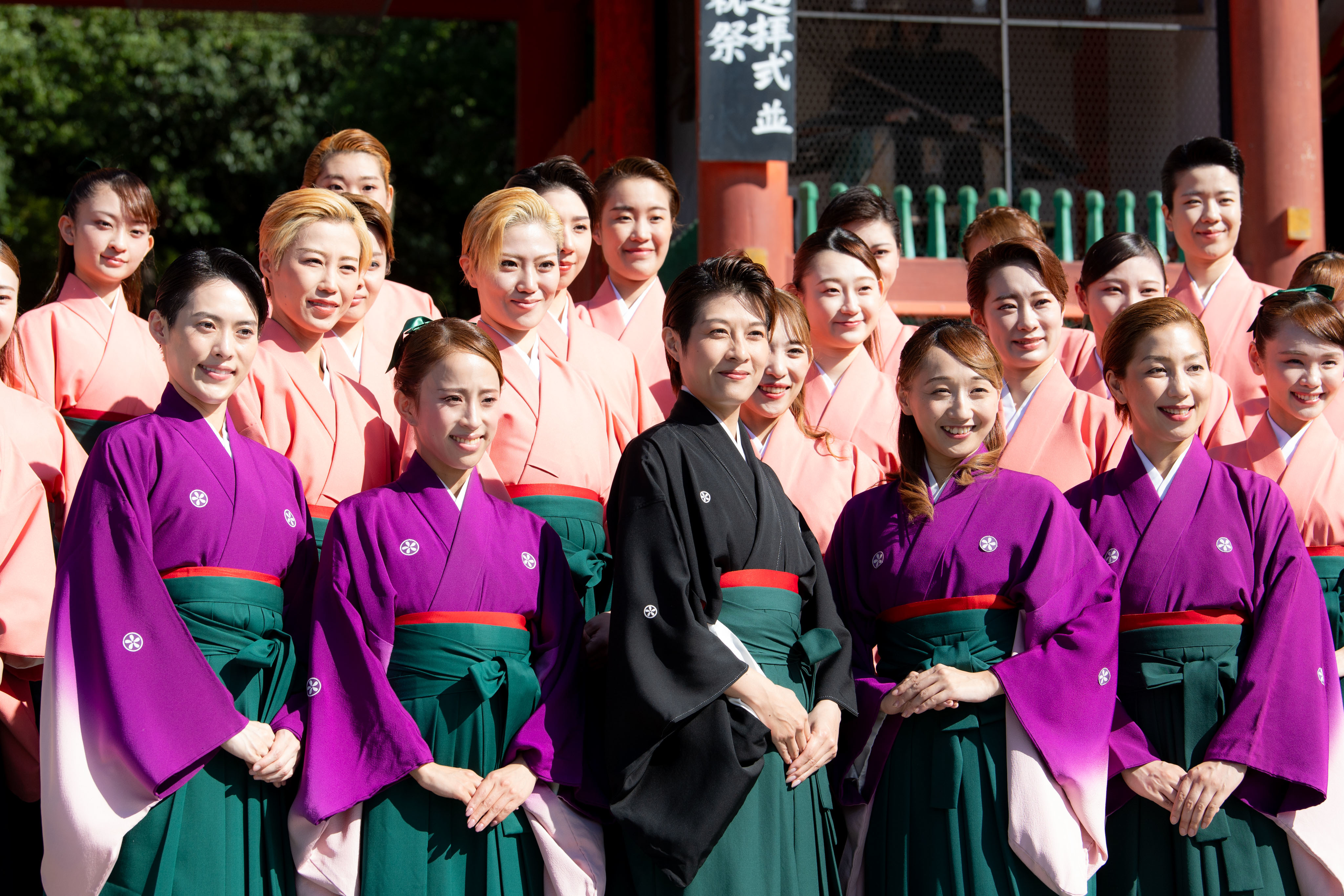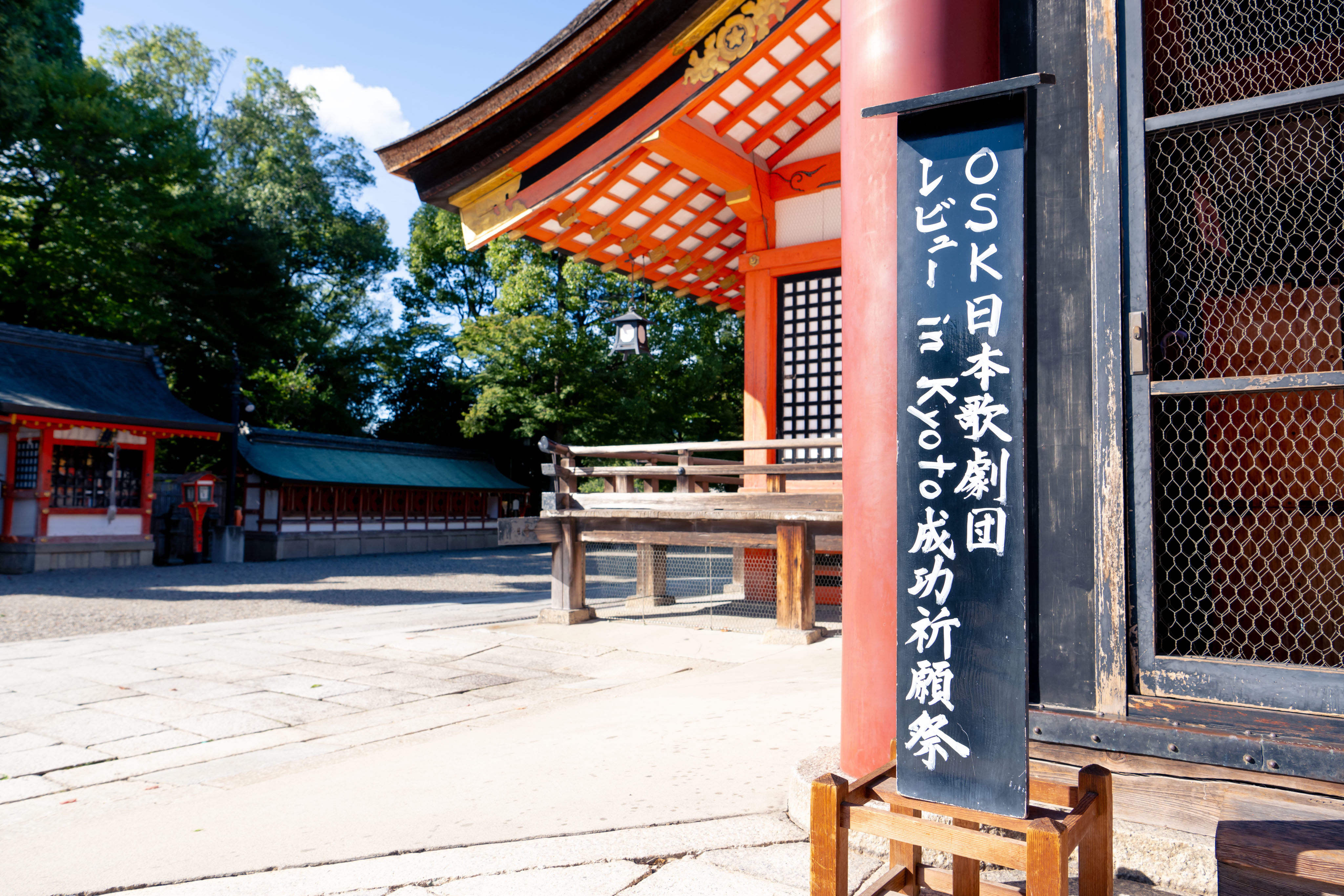 この会見の直後、八坂神社でほかの団員たちも合流し、公演の成功祈願が行われた。全員が桜色の着物&グリーンの袴でそろえたOSKメンバーの一団は、すでに雅な和の空気感をまとっていて、秋の京都を訪れた観光客だけでなく、通りすがりの京都市民たちも「きれい!」と言いながら、スマフォを向ける人も少なくなかった。公演の宣伝のチラシを手にする人も多く、成功に向けて順調な一歩を踏み出した一日となったはずだ。