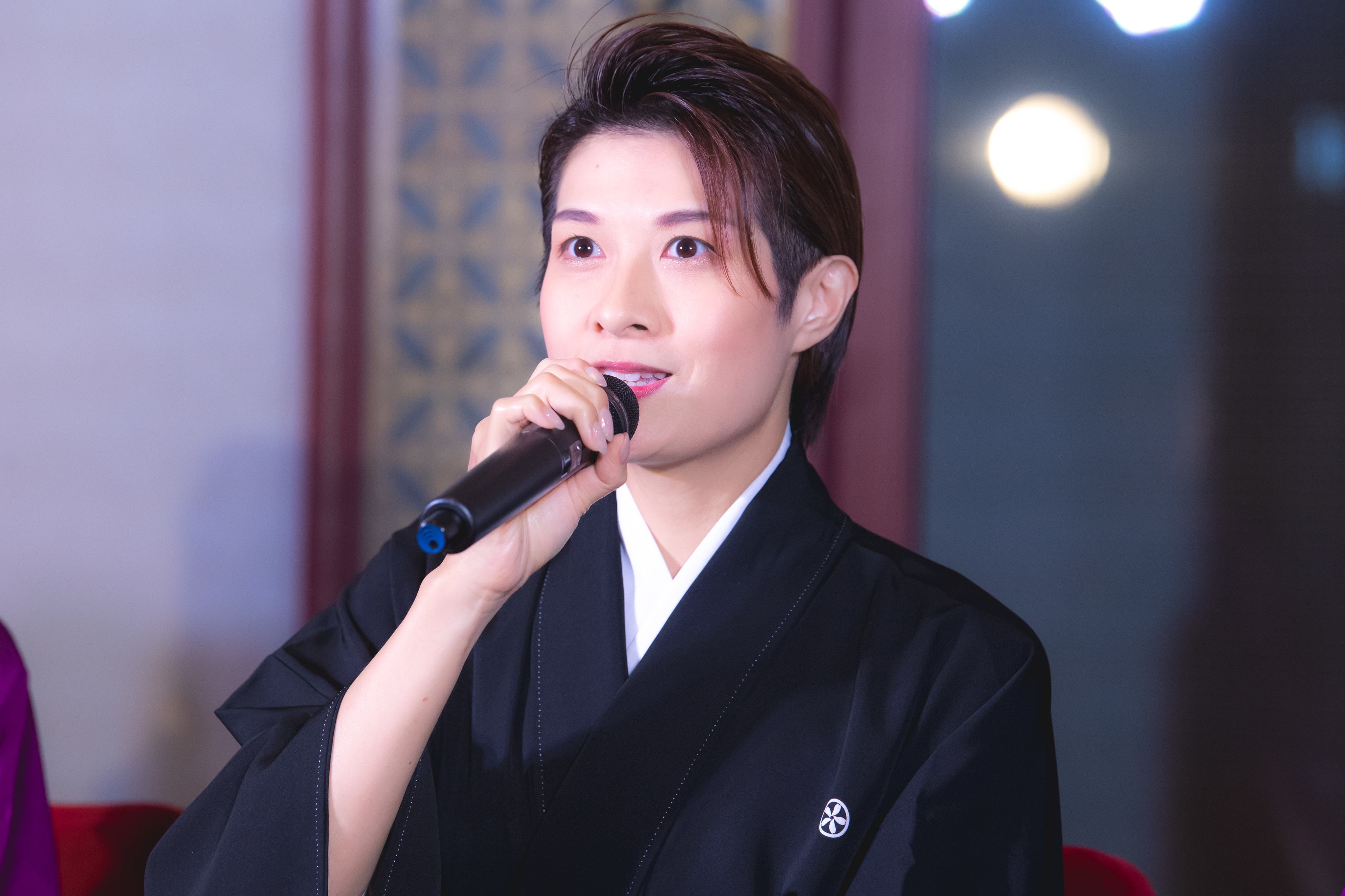 楊:先ほど華月君が歌ってくれた歌で、初めにお客様をそういう(京都らしい)世界観に導いて、いろんな物語を展開していくことになると思います。その新しい場面と「Go to the future」の間に違和感がないようにするのが、課題になってくるのでは。春の時とは、結構メンバーがチェンジしているので、また新たな「Go to the future」がお届けできると思います。そして私は、昭和5年からOSKで歌い継がれている、フィナーレのテーマソング「桜咲く国」が本当に大好きで。公演は秋ですが、桜が満開、皆様の笑顔も満開で幕が閉まっていく。その時のみんなの笑顔に、特に注目してほしいと思います。