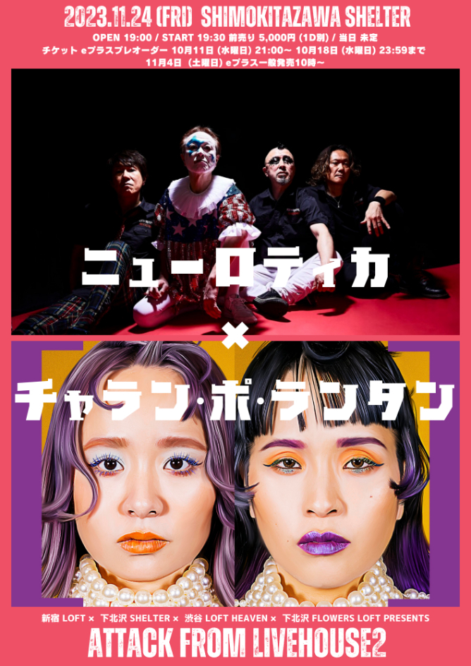 『ATTACK FROM LIVEHOUSE』は、ロフトグループ運営の音楽ライブハウス4店舗(新宿LOFT、下北沢SHELTER、渋谷LOFT HEAVEN、下北沢FLOWERS LOFT)で開催されてきたライブシリーズ。今回は下北沢SHELTERを舞台に、ニューロティカとチャラン・ポ・ランタンがツーマンライブを行う。