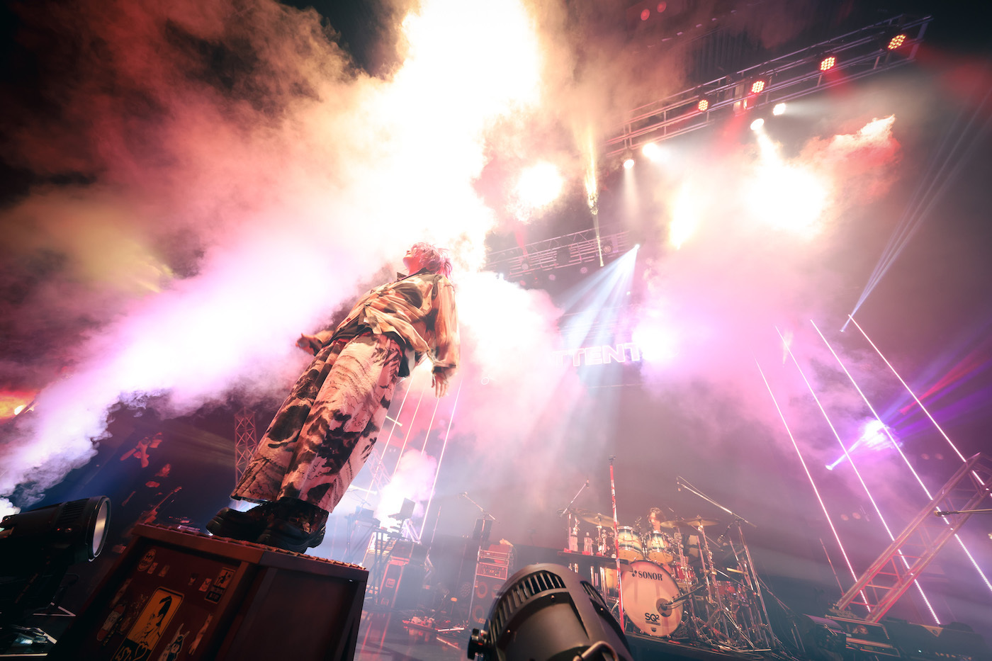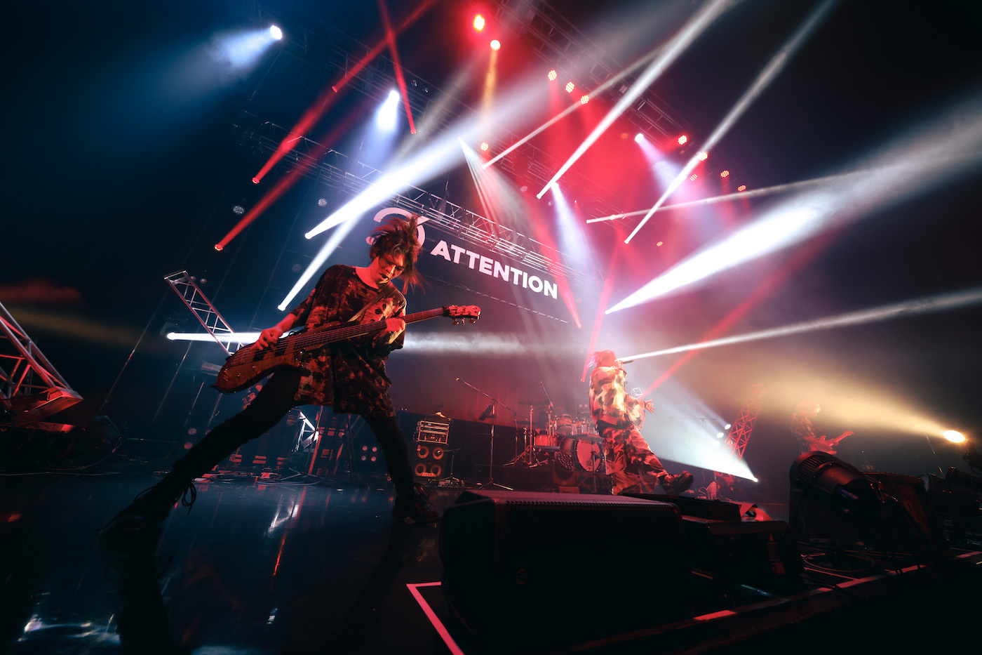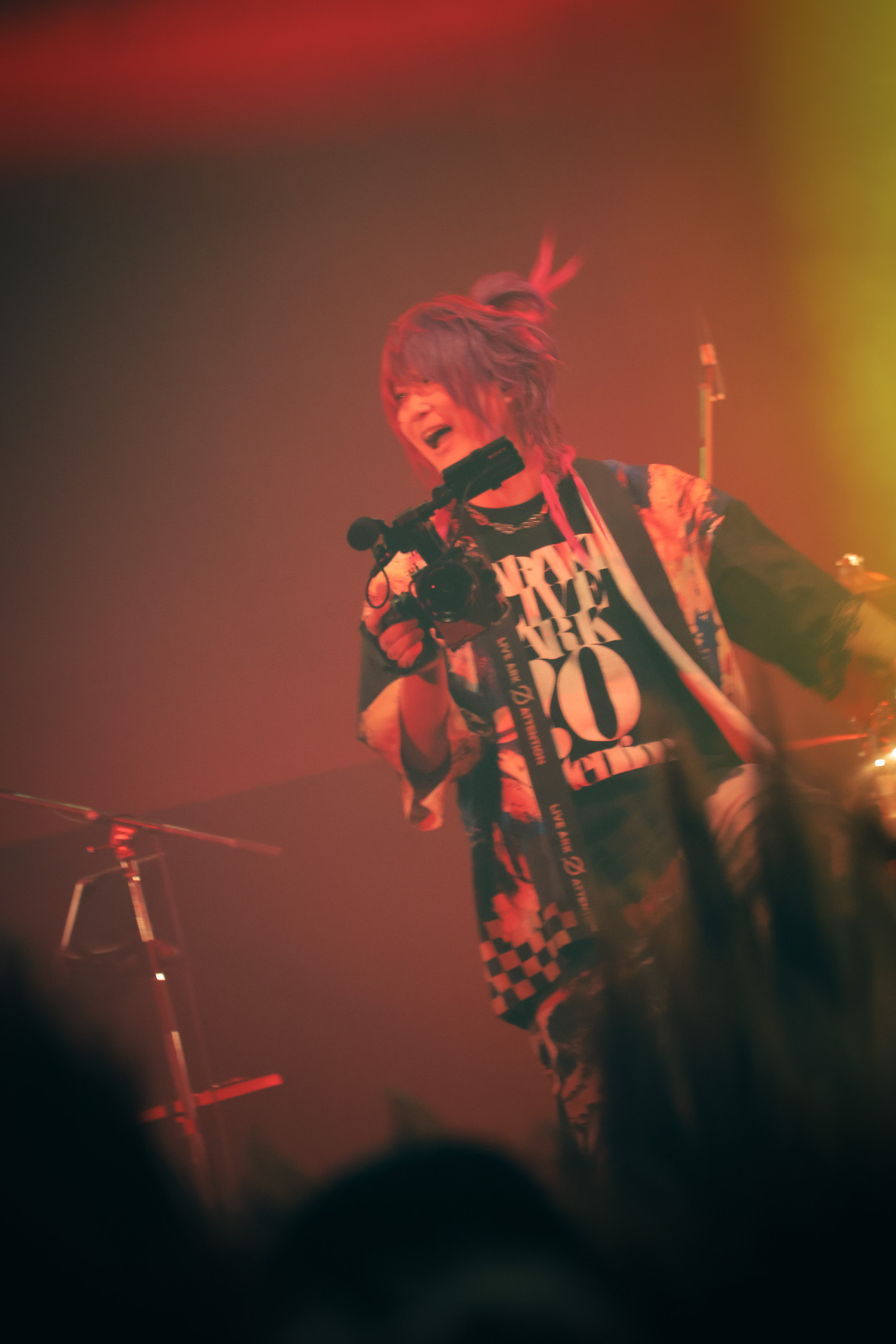 先にそれぞれの持ち場に就いていたバンドメンバーが音を鳴らす中、悠然とステージに現れたあらき。「泣いても笑ってもファイナル。最初から声出していこうぜ!」と雄叫びを上げて「テオ」へ。<僕ら>でフロアを指さしながら歌うあらき。あらきのイメージカラーである赤のペンライトを振りながら<クラクラ>を全力コールするオーディエンス。壮観だ。続けざま、白煙が勢いよく噴き上がり、リズムに合わせてオーディエンスが激しく身体を折りたたんだ「スーサイドパレヱド」。あらき、バンドメンバー、オーディエンスがみんなで飛び跳ねて会場が揺れた「Midnight Effect」。出だしから、とんでもない一体感が生まれている。