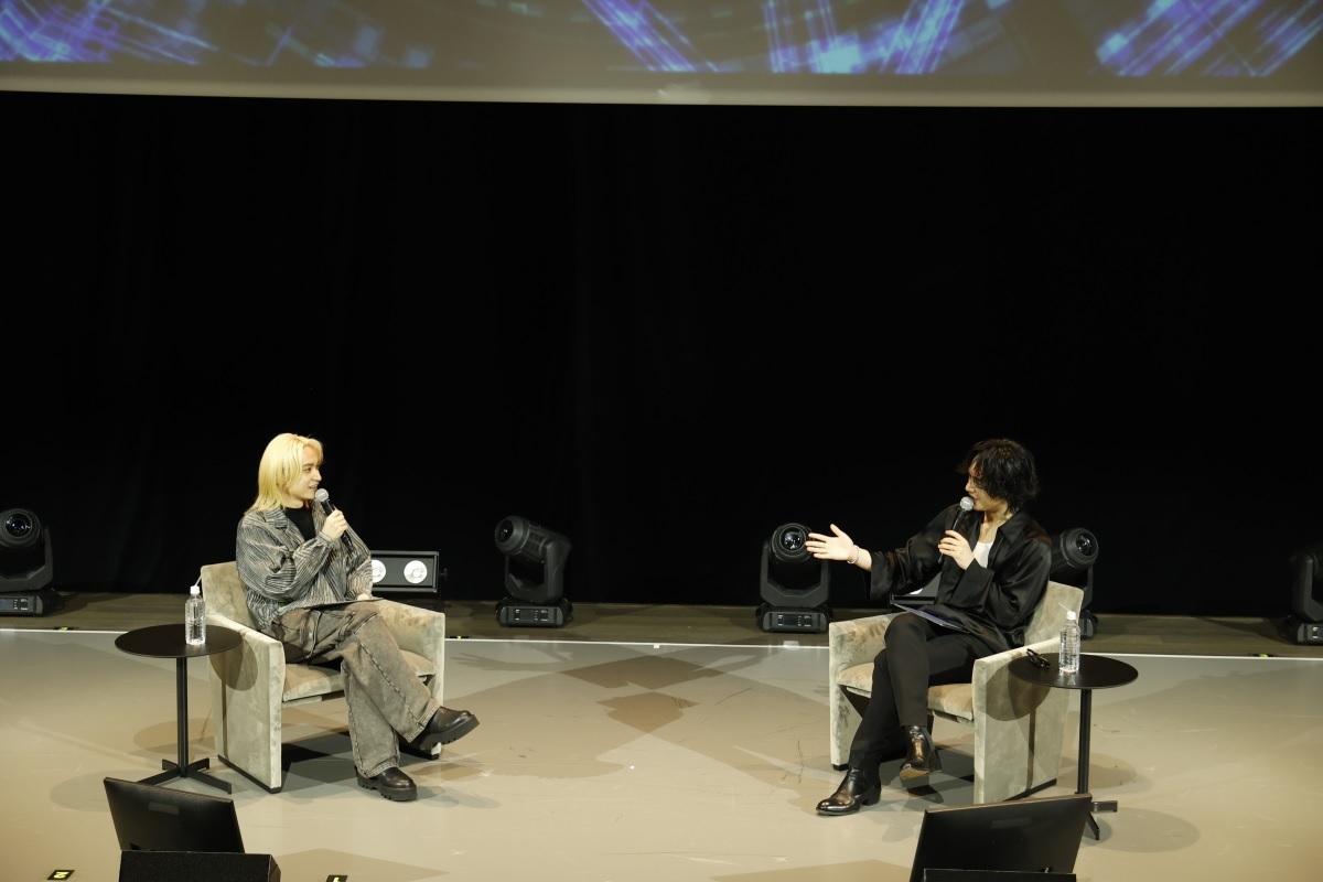 続いて行われたのは、SKY-HIとØMIによるトークセッション。同い年の二人は、共にアーティストとして活動しながら、プロデュースも行う。そんな二人が「二人が語るプロデュース論」をテーマにトークを繰り広げた。プロデュースを始めたきっかけについては、SKY-HIが2017年の30歳になったあたりから起業を考え始め、同時に相談されることも増えたことが起点だと振り返り、ØMIも同時期だったと同意。さらにSKY-HIから「なぜガールズグループなのか?」と聞かれたØMIは「日本全体のエンタテインメントを見ていて、日本はガールズグループが育ちにくい環境下だと思った。グローバルスタンダートでやっていけるグループが日本からもっと出てくるべきだと思っていた」と明かす。するとSKY-HIは、それはエンタメ業界に限らず企業に起こりやすい“大企業病”のひとつだと説明。彼の言う大企業病とは、一つの成功や正解としてAが生まれると、A'は生まれやすいが、Bという選択肢が薄くなるというもの。続けて「エンタテインメントでそれが起こってしまうのは非常に不健康に思っていたので、ØMIくんのような、自分と同世代の人がガールズグループを手がけて、違う角度からの提案を入れていくのはすごく素敵なことだと思いました」とコメントする。するとすかさずØMIから「あなたもだいぶ新しい風を吹かせているけど!」と、同じ志を持つ同士で共感をし合った。2人のトークの最後には、SKY-HIがØMIに「そろそろ(一緒に)曲やりません?」と提案。本当にその場の思いつきだと言うが、ØMIも「突発的に言っても実現できる2人だから」と、アーティストとしての2人の今後にも期待を寄せてトークセッションは幕引きとなった。