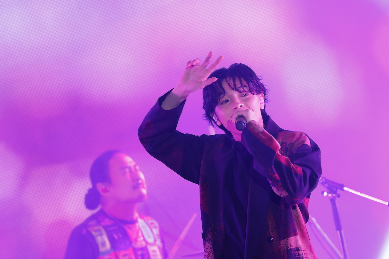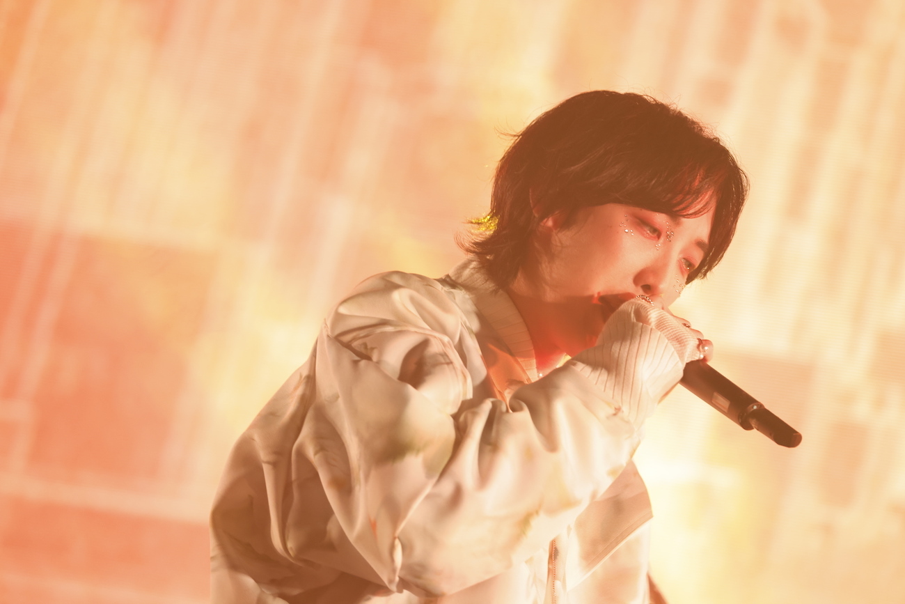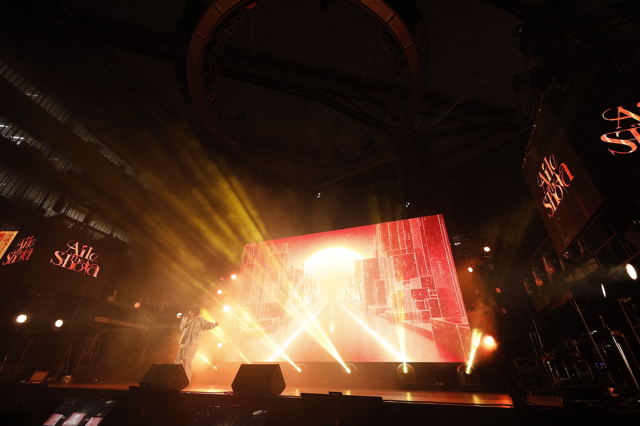 続いて登場したのは、いま飛ぶ鳥を落とす勢いであるBMSGレーベルのAile The Shota。本ステージは、AR三兄弟とのコラボステージということもあり、ここでしか観ることができない特別なものとなった。落ち着いた様子で静かにステージへと登場すると「調子はどうですか?」とオーディエンスに声をかけ、ライブは「No Frontier」からスタートした。冒頭から透き通ったハイトーンボイスを披露すると、会場は自然と歓声と拍手が湧き上がる。洗練されたビートに彼の求心力のある歌声、そしてAR三兄弟が手掛けるテクノロジーを駆使した映像。ステージを思いのままに動きながら歌唱するAile The Shotaはどこか飄々としていて、非常にクールだ。「去年に引き続き、テクノロジーと僕の音楽を融合させて、パフォーマンスしようと思います」と宣言すると、1曲目とは異なるビートが会場に鳴り響く。「IMA」をスキルフルに歌い上げると、オーディエンスは彼の歌声に呼応するかのように手を高く上げ、さらに歓声を上げる。Aile The Shotaは、自ら生み出す空気と世界観で場の空気を掌握する。「一緒に歌える人は歌いましょう」と誘いながら「AURORA TOKIO」が始まる。オレンジの光に包まれながら優しく歌い上げオーディエンスの反応を見ると「めっちゃいいですね、さすがイノフェス」とひと言。「やっと温まってきましたか? でも、もう終わっちゃうよ(笑)」と悪戯な笑みを浮かべて、「素敵な景色をありがとうございます」と、ラストナンバー「LOVE」へ。では、ピースフルな映像も相まって、優しい時間がそこには流れていた。