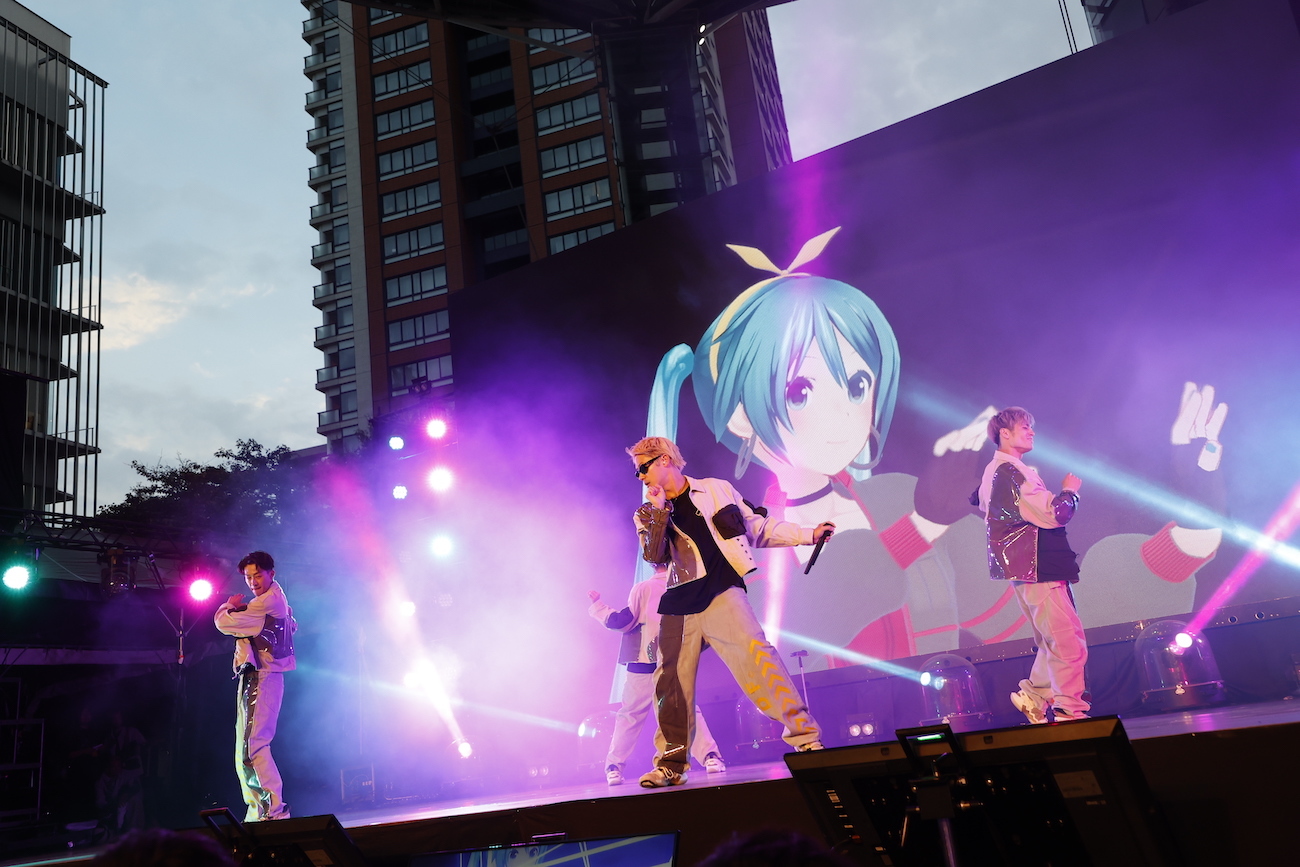 秋の心地よい風が流れる、夕方の六本木ヒルズアリーナ。14日(土)のライブパフォーマンスはMIKU BREAKの圧巻のライブアクトからスタートした。冒頭からARを駆使した「Overture」でキックオフした本ステージ。リアルとバーチャルの境界線をブレイクし、初音ミクと共にダンスやラップ、HIPHOPに昇華された彼らの音楽は唯一無二の存在感を放っている。「最後まで楽しんでいきましょう」とSHUNが口火を切ると幕を開けたスキルフルなダンスパフォーマンス、その中心にはしっかりと初音ミクの姿があり、観ていると「ここは2次元なのか3次元なのか」と不思議な感情へと誘われるのだ。冒頭から畳み掛けるようにパフォーマンスしていく彼ら。それに呼応するかのように手を高く上げ彼らを支えるオーディエンス。「Do It Like This Remix」ではToyotakaの洗練されたビートボックスが会場を湧かし、次曲の「ヒャクセツフトウ」では、初音ミクとのダンスと洗練されたラップに会場は更なる盛り上がりを見せる。「Shower Remix by RYO」ではMPCを純粋に楽しむRYOの姿とZiNEZの圧巻のフリースタイルバスケットボールが披露され、ボールを回すパフォーマンスでは会場から大きな歓声が。「YOU」をしっとりと歌い上げると、間髪を入れずラストの曲である「BREAK OUT」へ。力強くも波に乗るようなSHUNのフロウに合わせるように踊りまくるメンバーたち。「御手を拝借」とクラップをオーディエンスに求めると、会場はこの日いちばんのクラップで包まれた。イノフェス・スペシャルバージョンの特別なパフォーマンスは、スキルフルで唯一無二の存在感を放っていた。