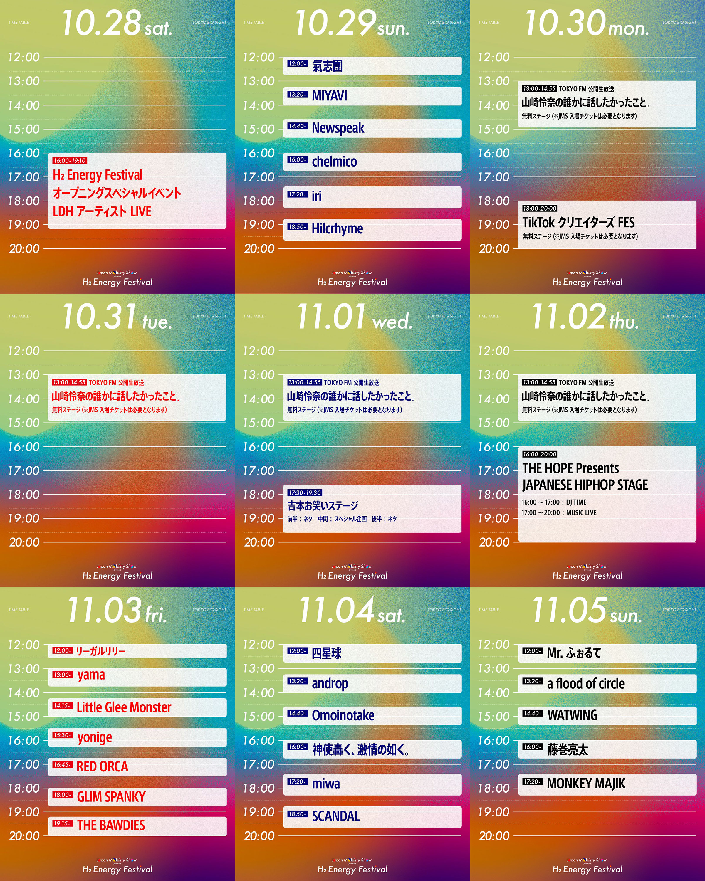 同フェスは水素エネルギーを使った特設エンターテイメントステージ。9日間におよぶ開催期間中には、多彩なアーティストが集結したフェス形式のライブのほか、お笑いステージやラジオの公開生放送なども実施される。自動車の祭典を熱く盛り上げる。各日程のチケットは現在発売中だ。