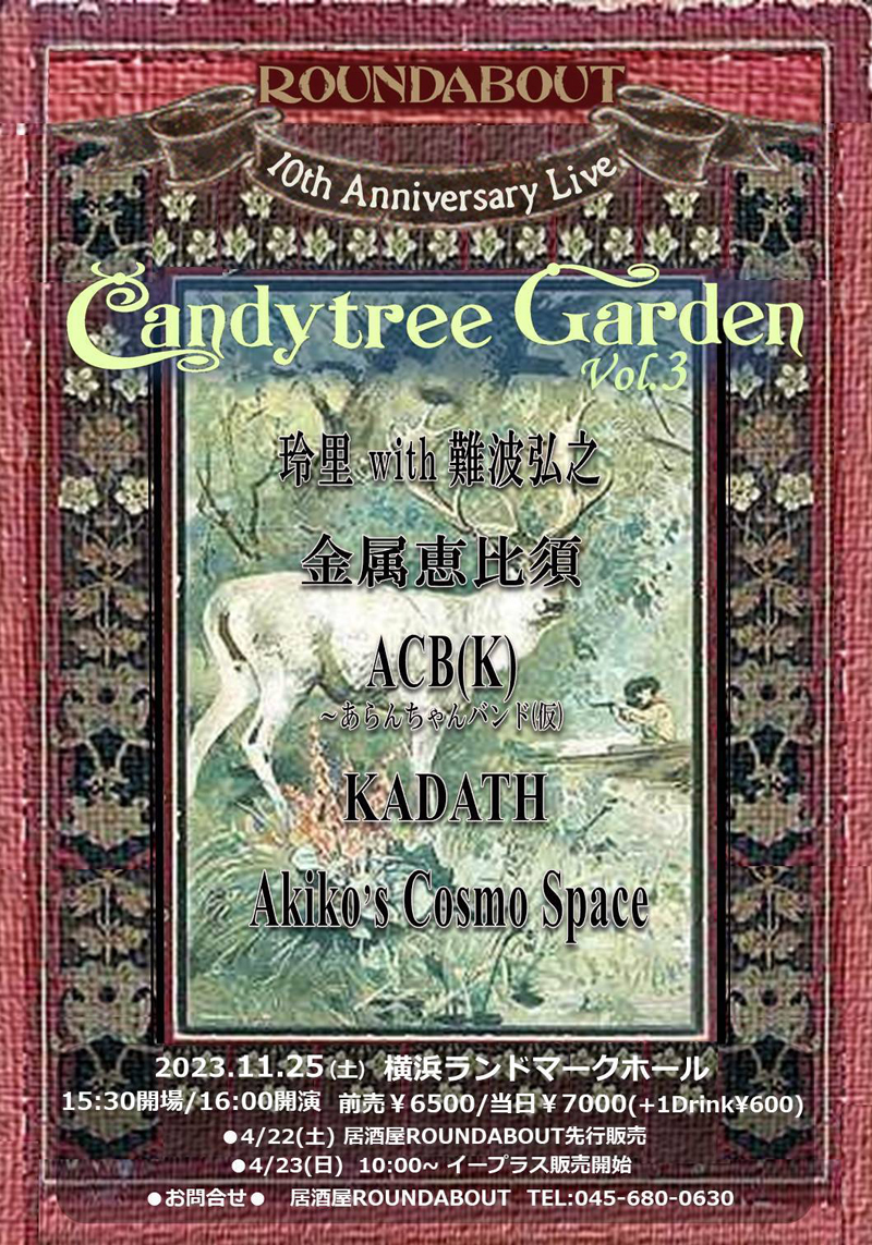 横浜は関内馬車道の「居酒屋ROUNDABOUT」が10周年記念LIVE『Candytree Garden Vol.3』を、2023年11月25日(土)16:00~、横浜ランドマークホールにて開催する。出演は、玲里with難波弘之/金属恵比須/ACB(K)~あらんちゃんバンド(仮)/KADATH/Akiko’s Cosmo Space、といった日本プログレッシヴ・ロック界の猛者たちが揃い踏み。いずれも、「居酒屋ROUNDABOUT」に縁のある連中という。