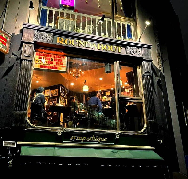 「居酒屋ROUNDABOUT」とは、2013年10月に横浜関内馬車道にオープンした小さなオールド・ロック居酒屋。20年以上飲食業界にてマネージメント〜現場経験した店主・関田真一が、過去に蓄積した飲食スキルと好きなオールド・ロックを詰め込んだ通称「まごころ居酒屋」である。人気の変な厚焼き玉子シリーズを始め、毎日替わる“本日のおすすめ料理”を筆頭に40品以上の進歩的(プログレッシヴ?)な“まごころ料理”を提供する一方、焼酎も見た事ないようなマニアックな焼酎が次々と入荷することでも有名。「まずは居酒屋として一流であってロックはあくまでも付加価値」を念頭に凡事徹底〜クレンリネス、ホスピタリティを心がけているとのこと。