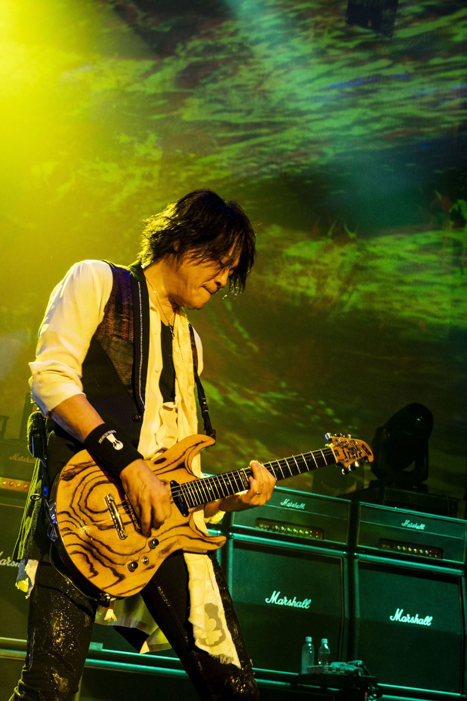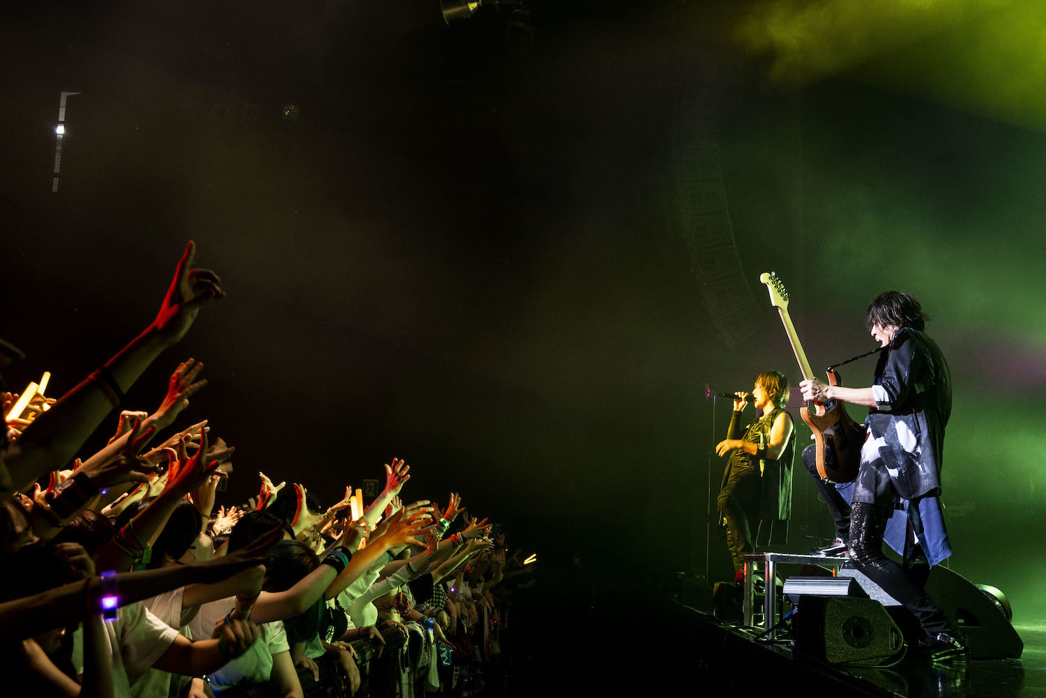 今回のツアーを意識して、ファンとの掛け合いや合いの手をリッチに盛りこんだこの粋な新曲に始まり、オープニングブロックにはコール&レスポンスがたっぷり楽しめる賑やかなナンバーが居並ぶ。KISHOWが客席にマイクを向け、手を振り上げて叫び、e-ZUKAがギターのネックを客席に突き出して煽るたびに、オーディエンスが突き上げる拳とジャンプもどんどん激しく、高くなる。今日は、そしてこのツアーは、俺たちに負けずにお前らも声出して、全身全霊思い切り騒ぐんだぜ!というメッセージが、彼らが選んだ楽曲によって、雄弁に語られていた。