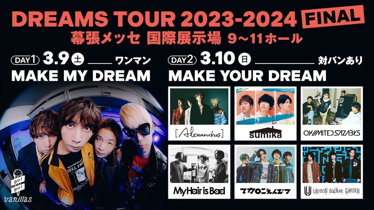 今回、「MAKE YOUR DREAM」の出演者が発表となり、[Alexandros]、sumika、04 Limited Sazabys、My Hair is Bad、マカロニえんぴつ、UNISON SQUARE GARDENの6バンドが決定し、フェス形式での開催となる。