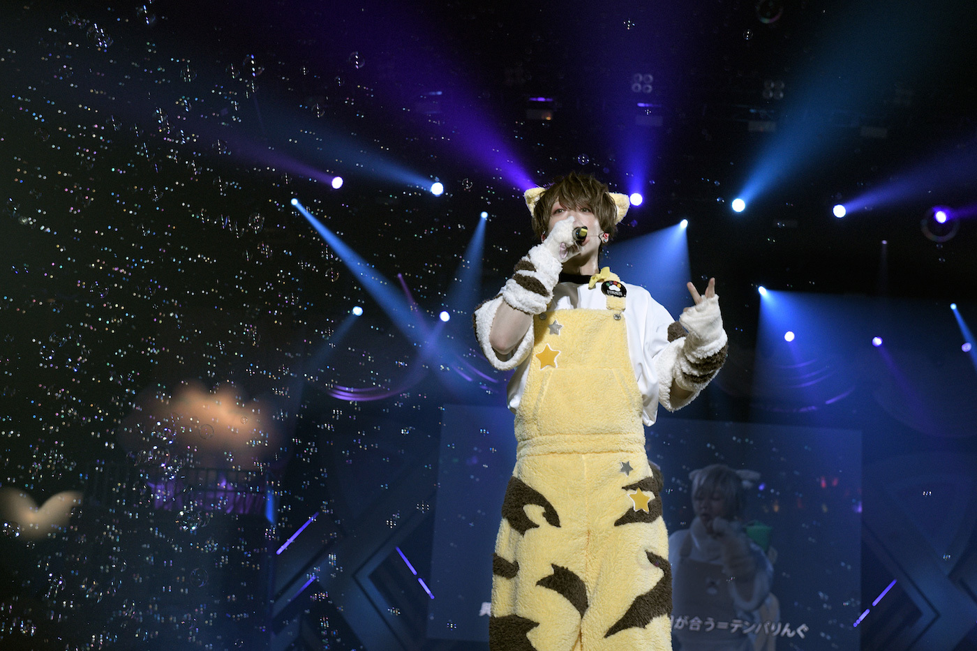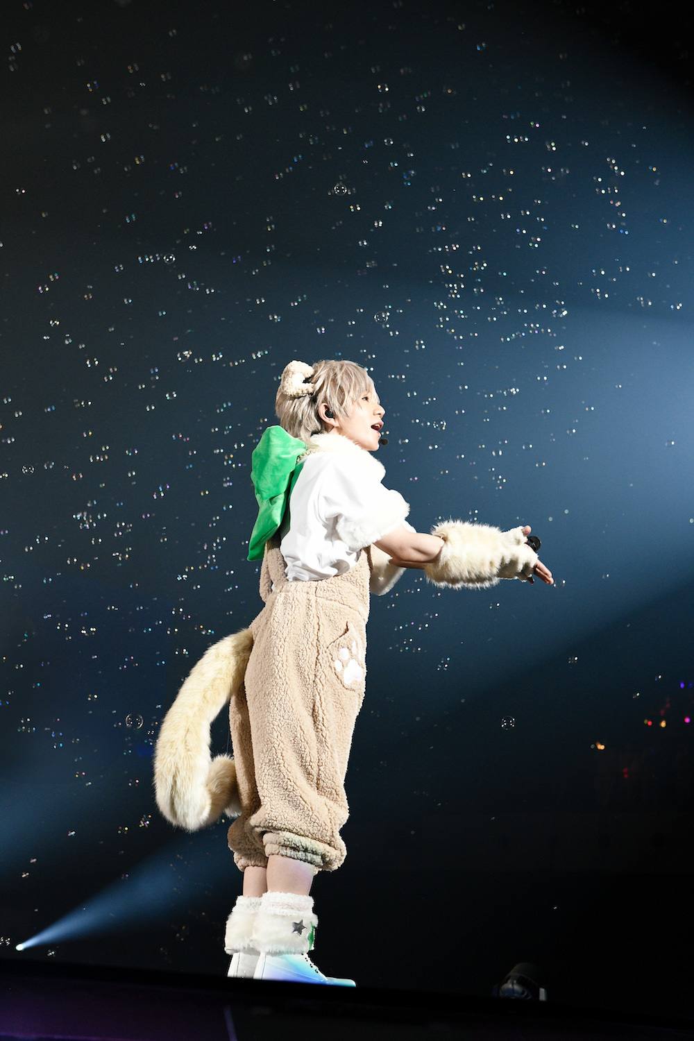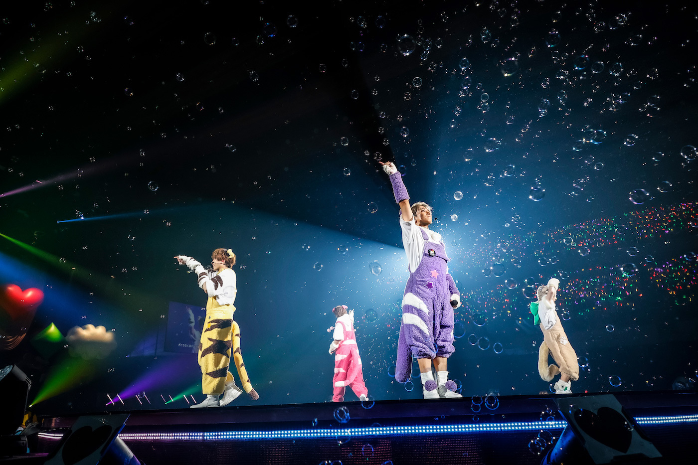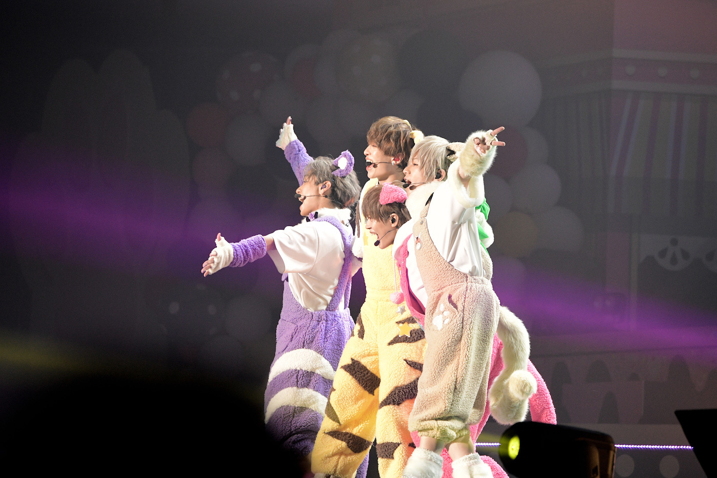 小さい風船がたくさん詰まったビッグバルーンがアリーナ客席にいくつも投入された「すーぱーぬこになりたい」では、うらたぬきとセンラ、志麻ととなりの坂田。が二手に分かれてお尻振り振りダンス。「マジカル・ショコラティエ」では、噴き上がるシャボン玉にはしゃぎながらセンターステージでキュートにダンス。4匹のかわいさが増すとともにセンターステージが上昇していく。