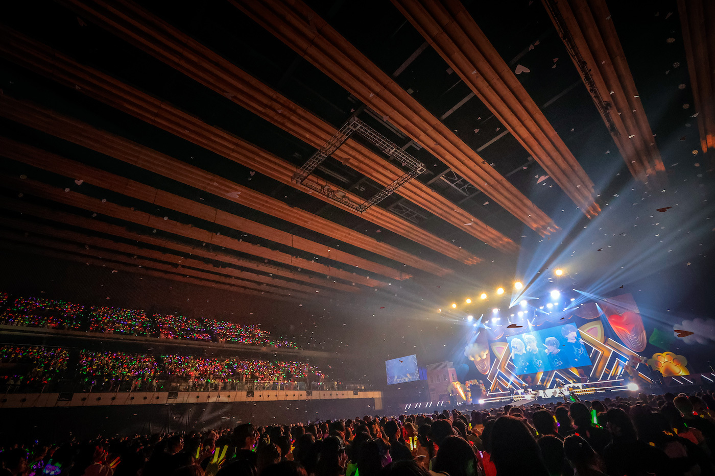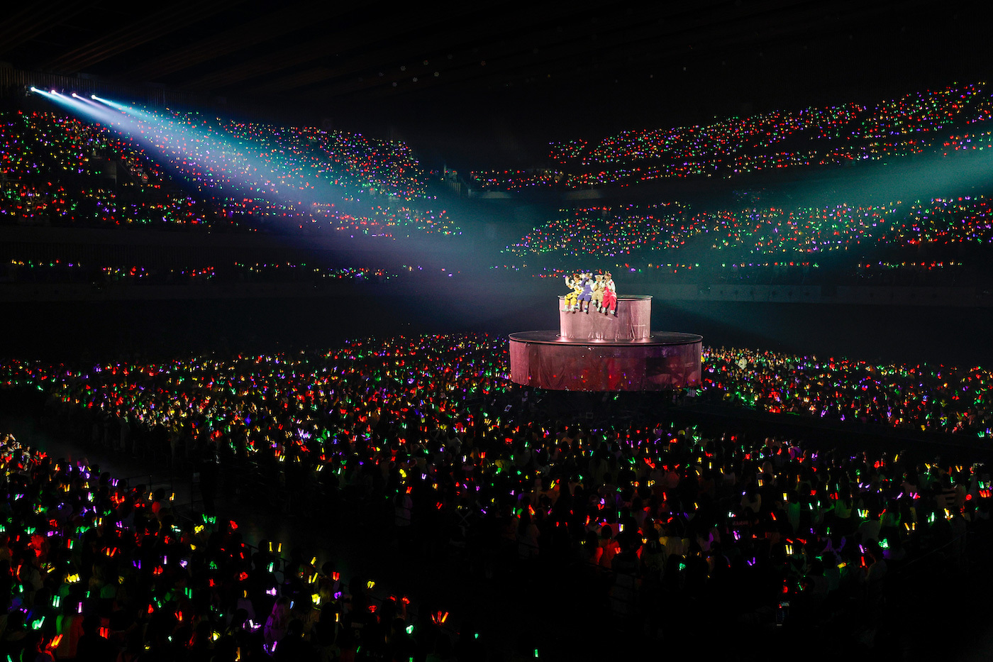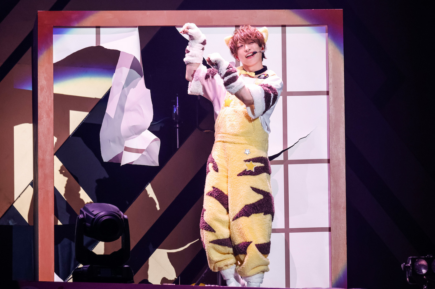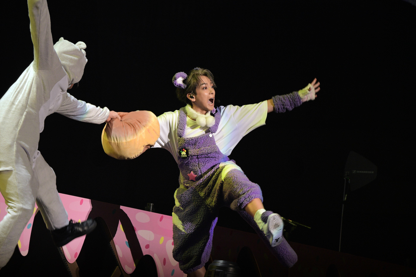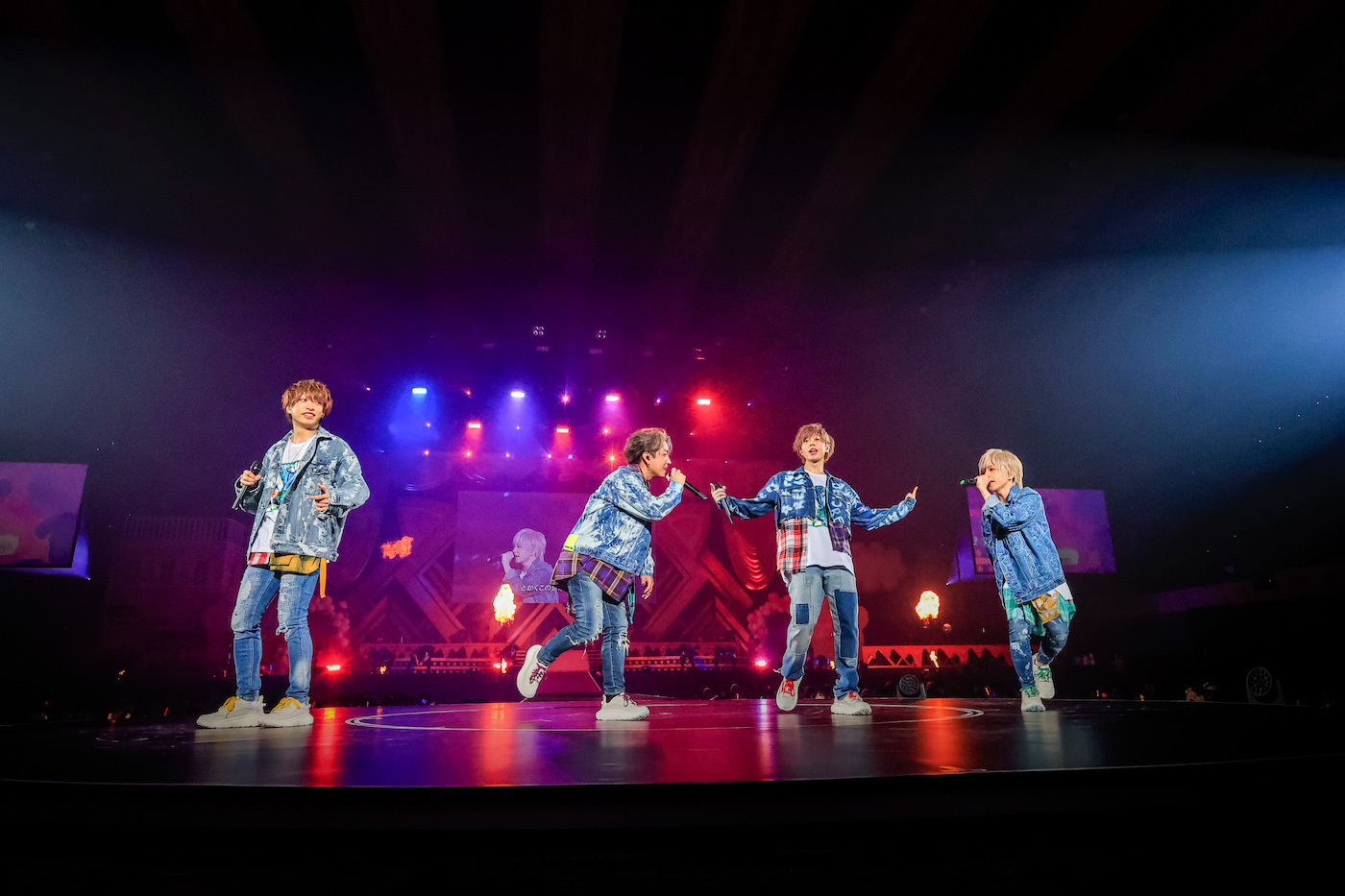 小さい風船がたくさん詰まったビッグバルーンがアリーナ客席にいくつも投入された「すーぱーぬこになりたい」では、うらたぬきとセンラ、志麻ととなりの坂田。が二手に分かれてお尻振り振りダンス。「マジカル・ショコラティエ」では、噴き上がるシャボン玉にはしゃぎながらセンターステージでキュートにダンス。4匹のかわいさが増すとともにセンターステージが上昇していく。