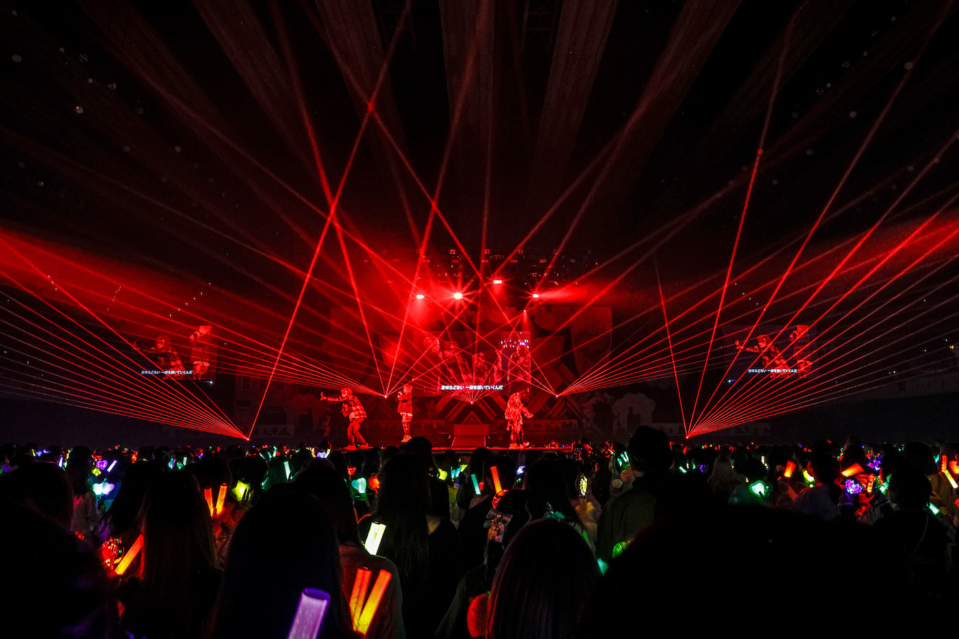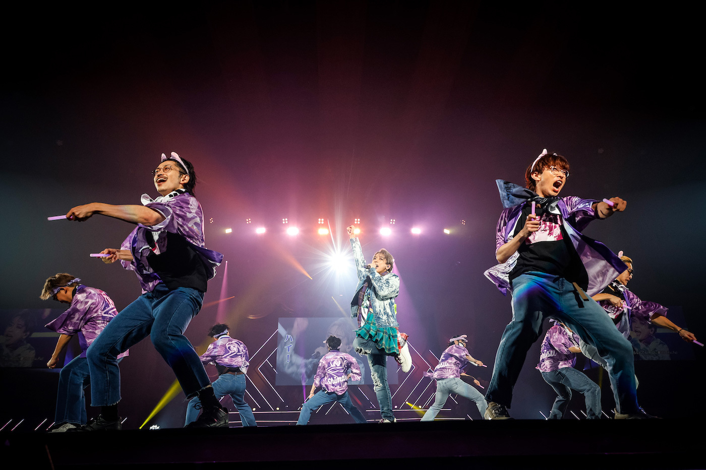 猫ちゃんモードな<ガオガオ>ダンスでも沸かせた「カモフラ」に続いて、「ハングリー・ゴースト」ではダンサーを引き連れメインステージ中央から伸びる花道を通って円形のセンターステージへ。個性さまざまなコスプレ姿も多く見られる客席では、ご主人タマ(うらしまさかニャせんのお客さまの呼称)たちがメンバーカラーを灯したペンライトを振りながら<パクパク>コール。一体感がありすぎる。