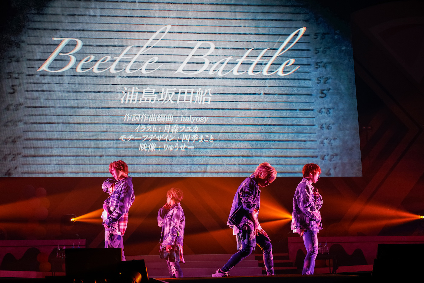 今回のライブに相応しい、うらたぬきの「うらたねこ♀」。包み込むような優しい歌声を響かせた、となりの坂田。の「回る空うさぎ」。大人っぽい歌声でドキドキさせた、センラの「NIGHT SCREAMER」。大ボリュームのコール&レスポンスが巻き起こった、志麻の「イエスタデイはトゥモローを歌わない」。そんな色とりどりなソロからの「Beetle Battle」では、デニムコーデでそろえた4人の色気大爆発&いつにも増して過激なセリフにcrew(浦島坂田船ファンの呼称)が大歓声、さらには悲鳴を上げる。