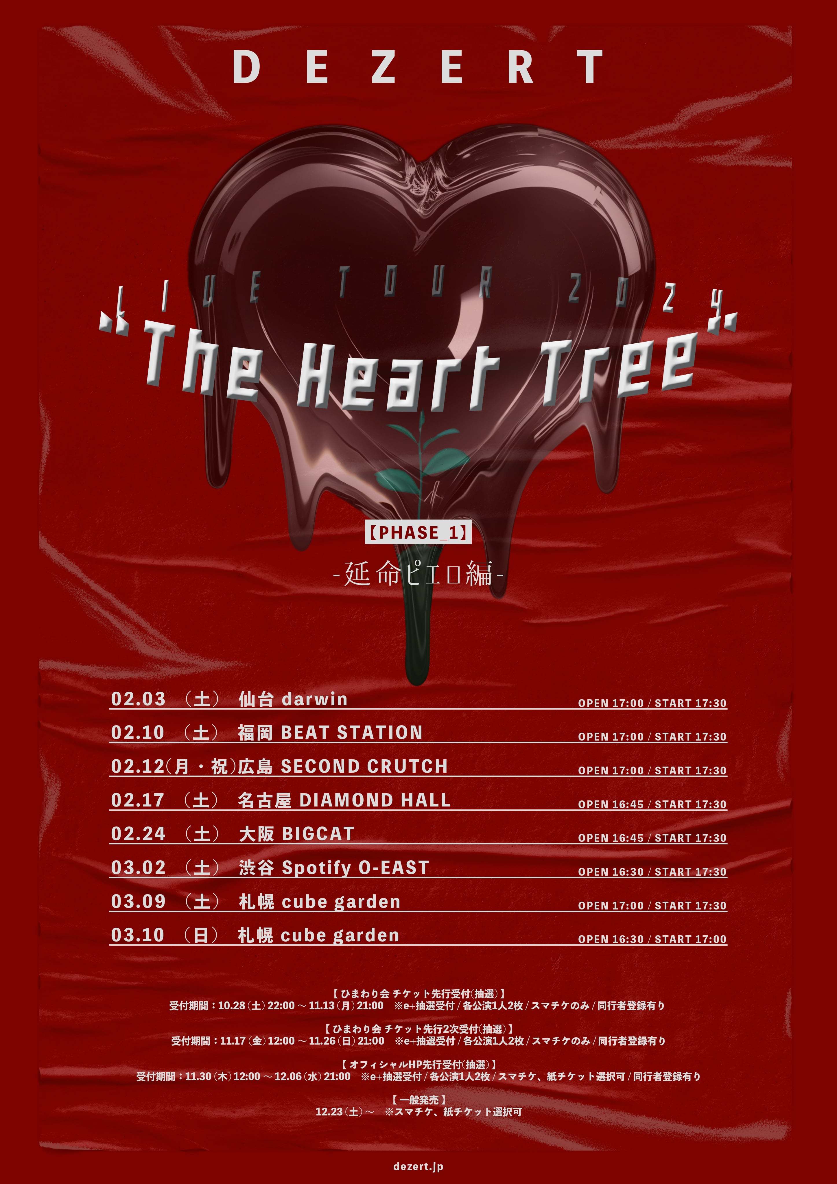 DEZERTは、同ツアーで2月3日(土)仙台darwinを皮切りに、福岡、広島、名古屋、大阪、東京、札幌の全国7都市・全8公演をまわる予定。ツアータイトルには、9月23日の東京・LINE CUBE SHIBUYA(渋谷公会堂)ワンマンライブで初披露した新曲「The Heart Tree」を冠している。