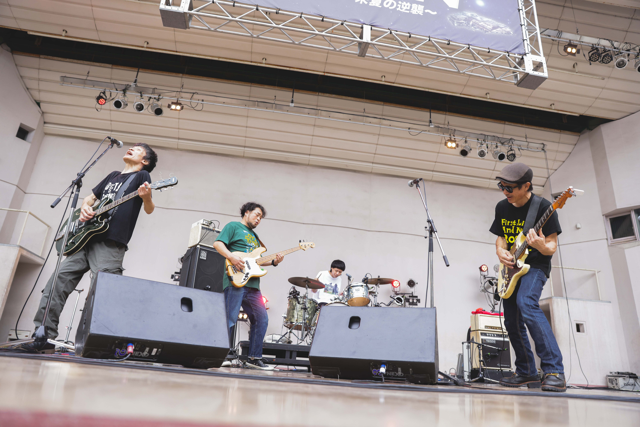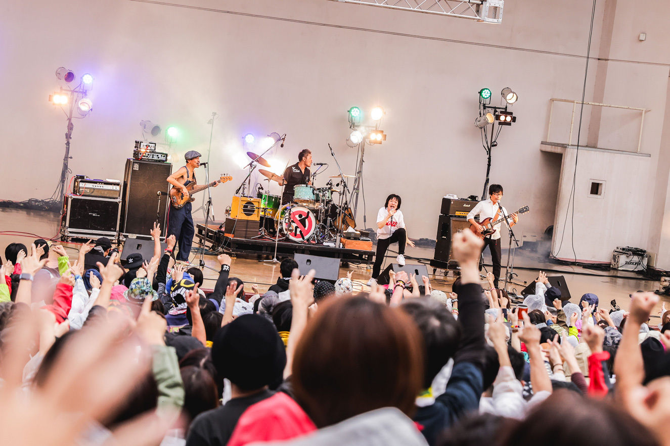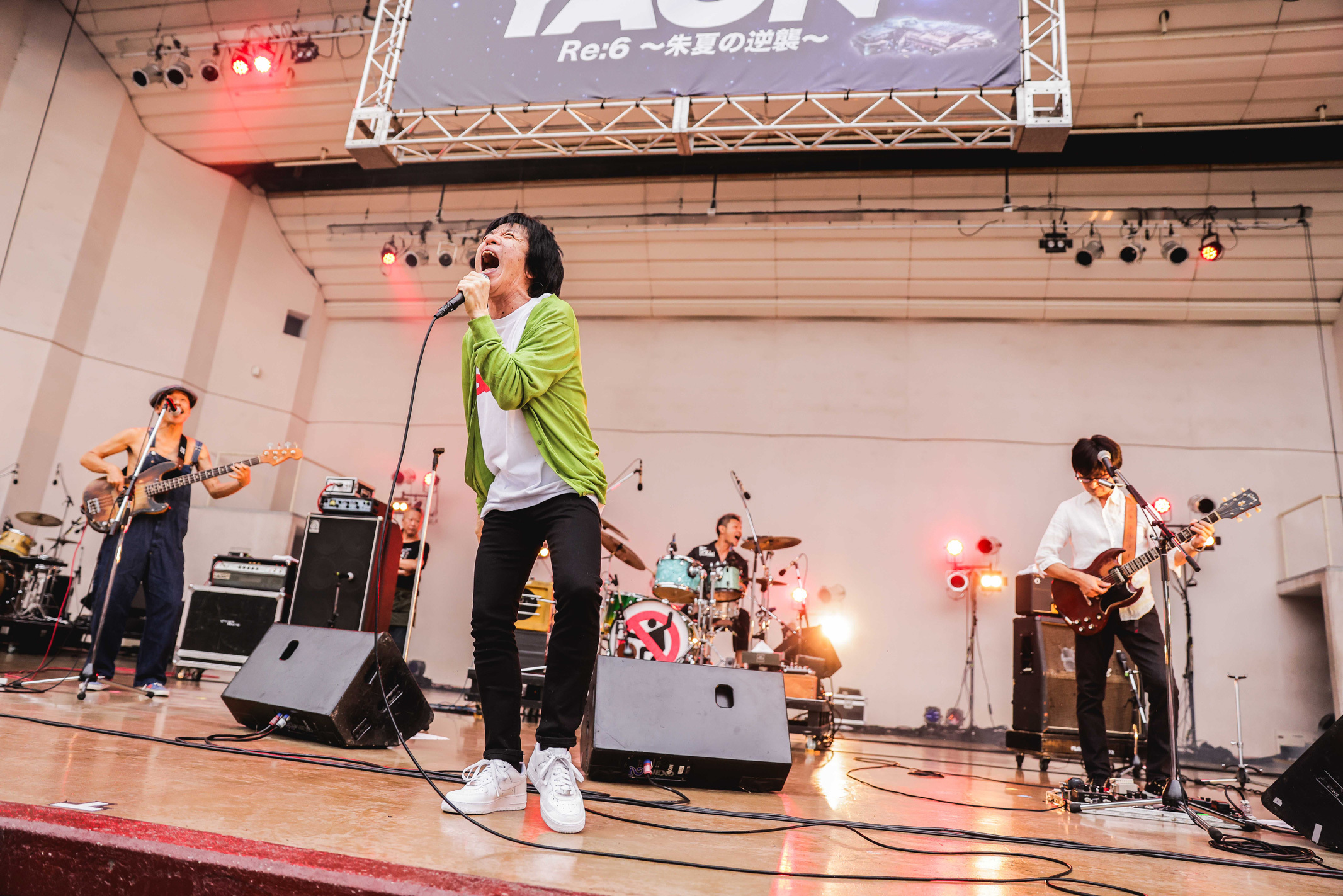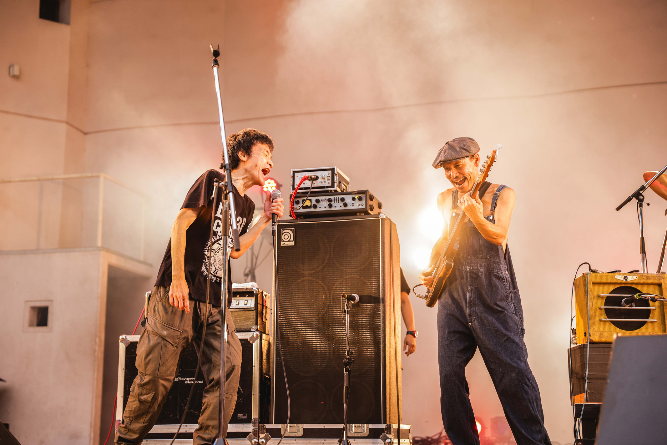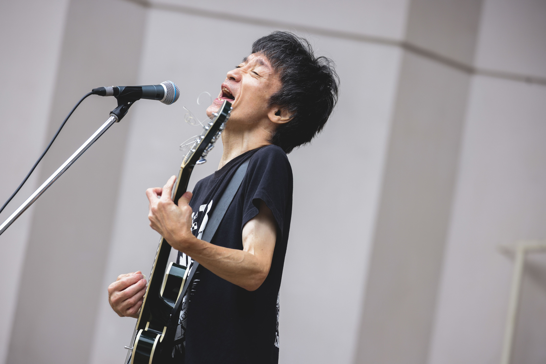 はること大木温之のこのひとことで鳴らされた最高のロックンロールで幕開け。<精々生きのびてくれ>という歌詞がたまらなく沁みる。このイベントでは弱冠でしか無い45歳の私も、ようやく本当の意味で、この歌詞の意味がわかってきたのかもしれない。終わるやいなや、はるが「俺たちが最年長なんでしょ!? 錦鯉のふたりって、俺たちより下なんでしょ?」とぼやくと、アビさんことギターの安孫子義一が「早くやれって!」とぼやく。