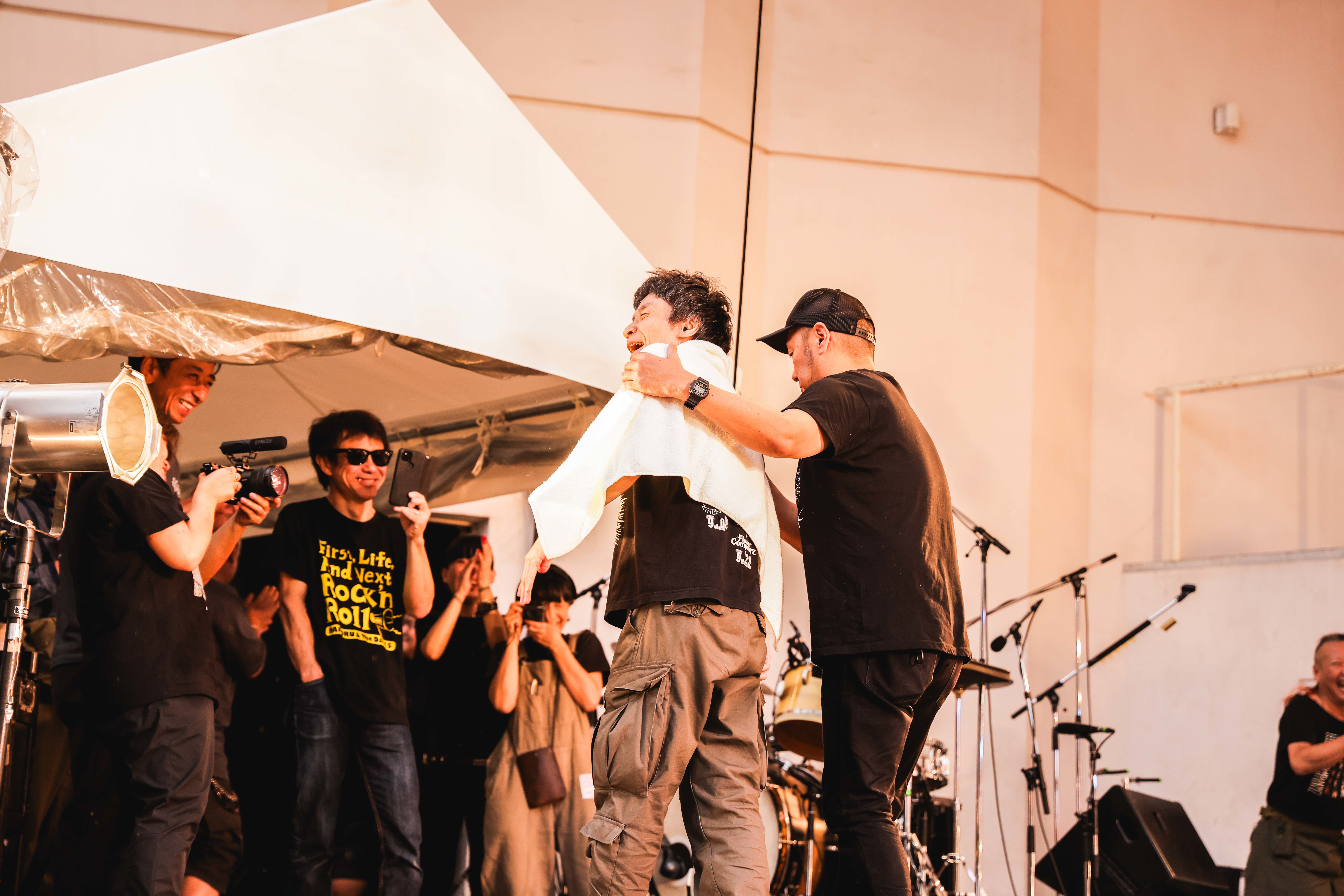 “3なし”で34周年を迎えたフラカンは、永遠に続く気概しか感じない。<醒めない 醒めない 夢から醒めない 醒めない 醒めない 意地でも醒めない>と歌詞が強烈な「三十三年寝太郎BOP」から「NUDE CORE ROCK’N’ROLL」とラストスパートを攻めまくる。「最後にもう1曲踊れますか?」からラストナンバー「真冬の盆踊り」へ。「鳴子(9月に日比谷野音で行われたピーズとのライブで販売したグッズ、この日も売っていた)を持っている人は鳴らしてもいい!」というマエカワから、「人に迷惑をかけなきゃ何してもいい!」という圭介の言葉は、かっこいい大人の姿勢すら感じさせてくれた。だからこそ、雨で滑りまくる舞台で何度もヘッドスライディングを繰り返す圭介の姿は凄みしかなかった。最初は無茶やってるなと悪気なく笑って観ていたが……。