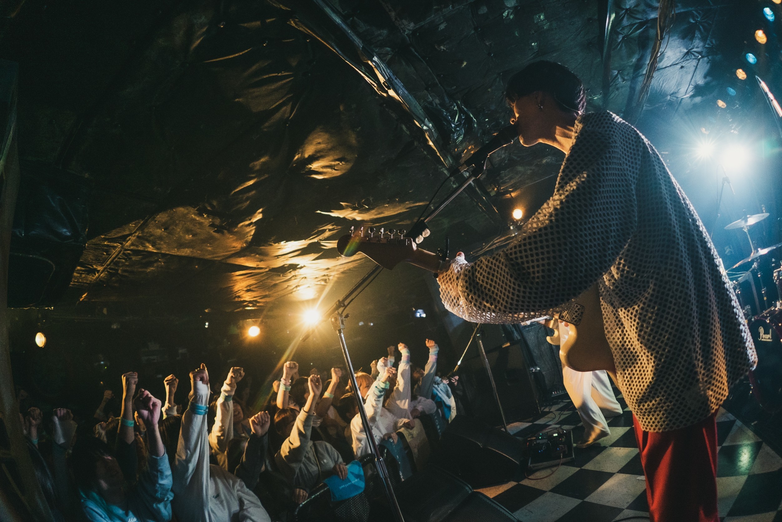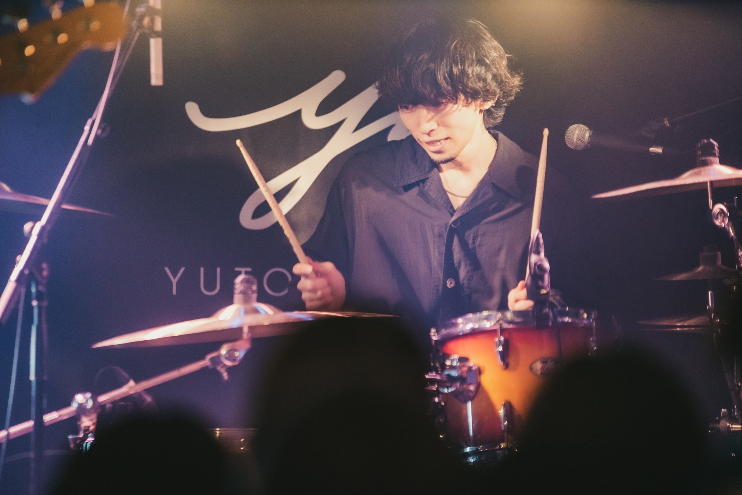 ステージに登場した3人は、ドラム台の周りに集まって小さく気合いを入れてからスタンバイ。1曲目は「23×3」。金原がワンフレーズ歌ったあと、キレのいいドラムフィルを合図にジャーンと音を合わせ、「よろしく! やろうぜ、下北!」(金原)と投げかけた。「はじめてのワンマン、最後の最後まで、あなたに歌います。西東京発の3ピースバンド、YUTORI-SEDAIです」と挨拶した金原は、観客一人ひとりのことを両目でしっかり捉えながら歌っていて、嬉しさと緊張が入り混じったような表情。一方、上原は全開の笑顔で、前に出てきて楽しそうにベースを弾いている。ステージ最後方から届けられる櫻井のビートはみずみずしい。今日この日を迎えられた喜び、感慨を乗せたバンドサウンドに、観客が拳を上げて応えた。