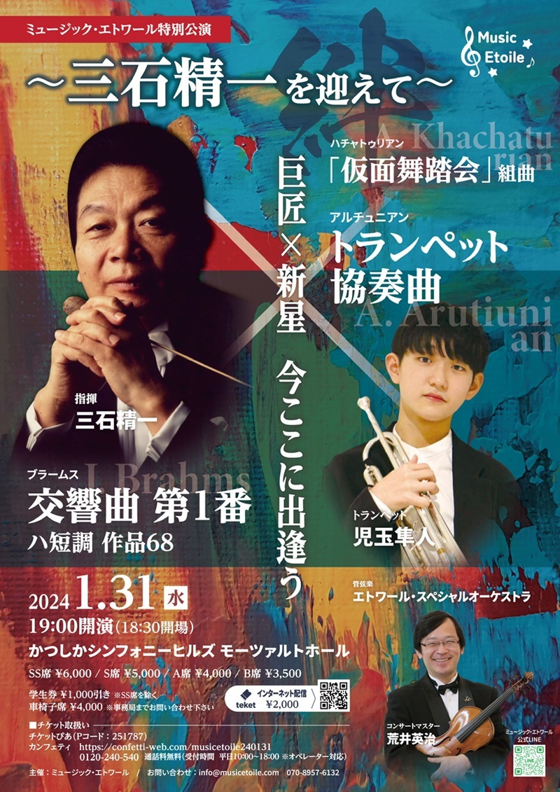 コンサートマスターには名古屋フィル、日本センチュリー交響楽団、東京シティ・フィルの客演コンサートマスターを務める荒井英治を迎え、オーケストラは三石精一に所縁のあるプロ奏者が集結。三石精一(指揮)は、読売交響楽団専任指揮者を経て東京音楽大学名誉教授。昨年卒寿を迎え、なお現役で活躍する巨匠だ。児玉隼人(トランペット)は、北海道釧路市出身の14歳。コロナ禍で始めたSNSが世界から注目され、Instagramフォロワーは2万人に上る。児玉隼人によるアルチュニアンのトランペット協奏曲、三石精一円熟のブラームスに注目だ。