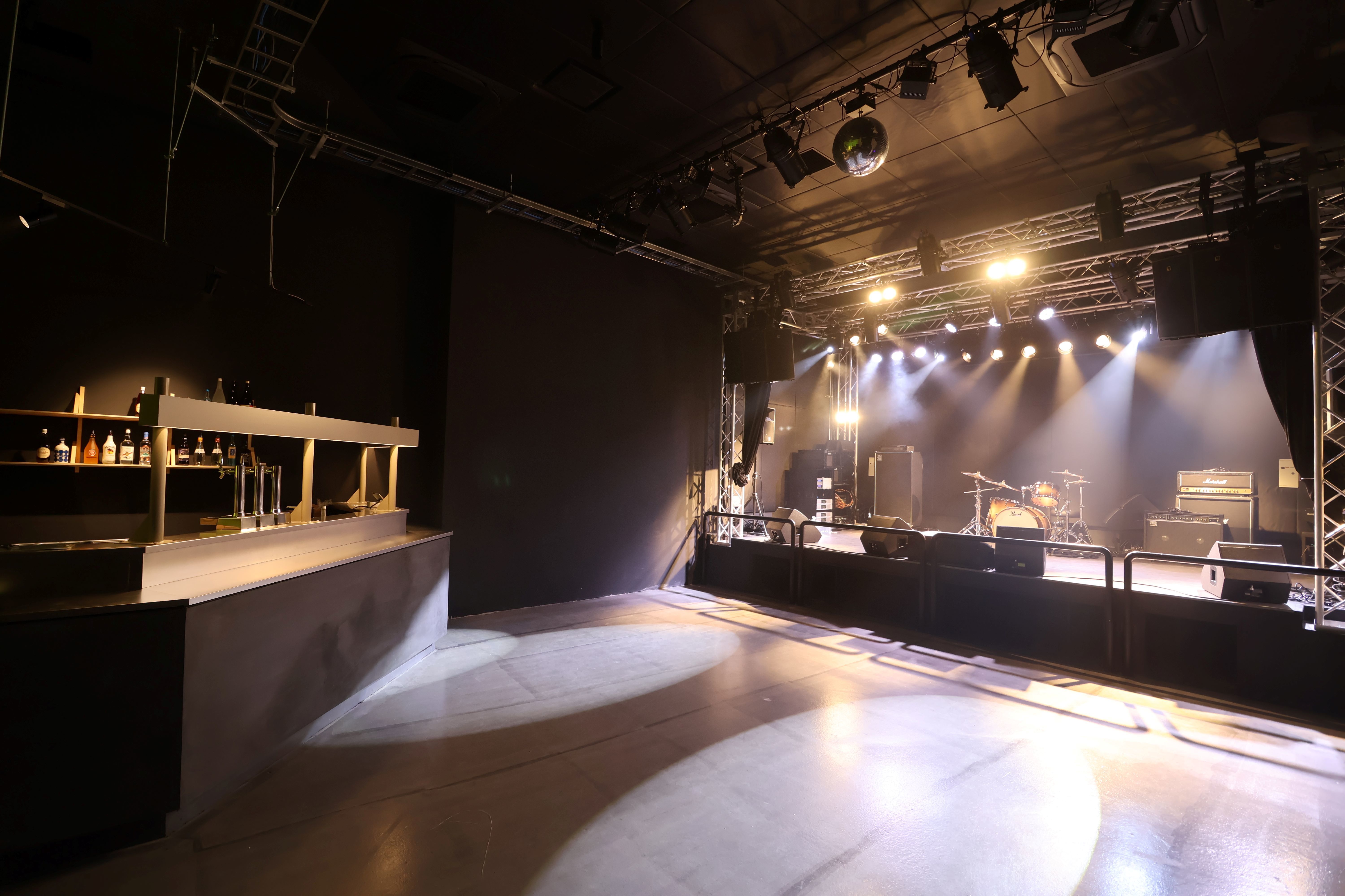 高架下にあるライブハウスということもあり、フロアには大きな柱が2本立っている。ステージはしっかりとした高さがあるので見え辛いなんてこともなく、フロア全体が横長の造りになっているのと、ステージ向かって左手側は階段状のフロアになっているのでどこからでもステージを眺めることができる。もちろん、音の響きはどこで観ていてもバランスの良い音を感じとることができるので安心を。