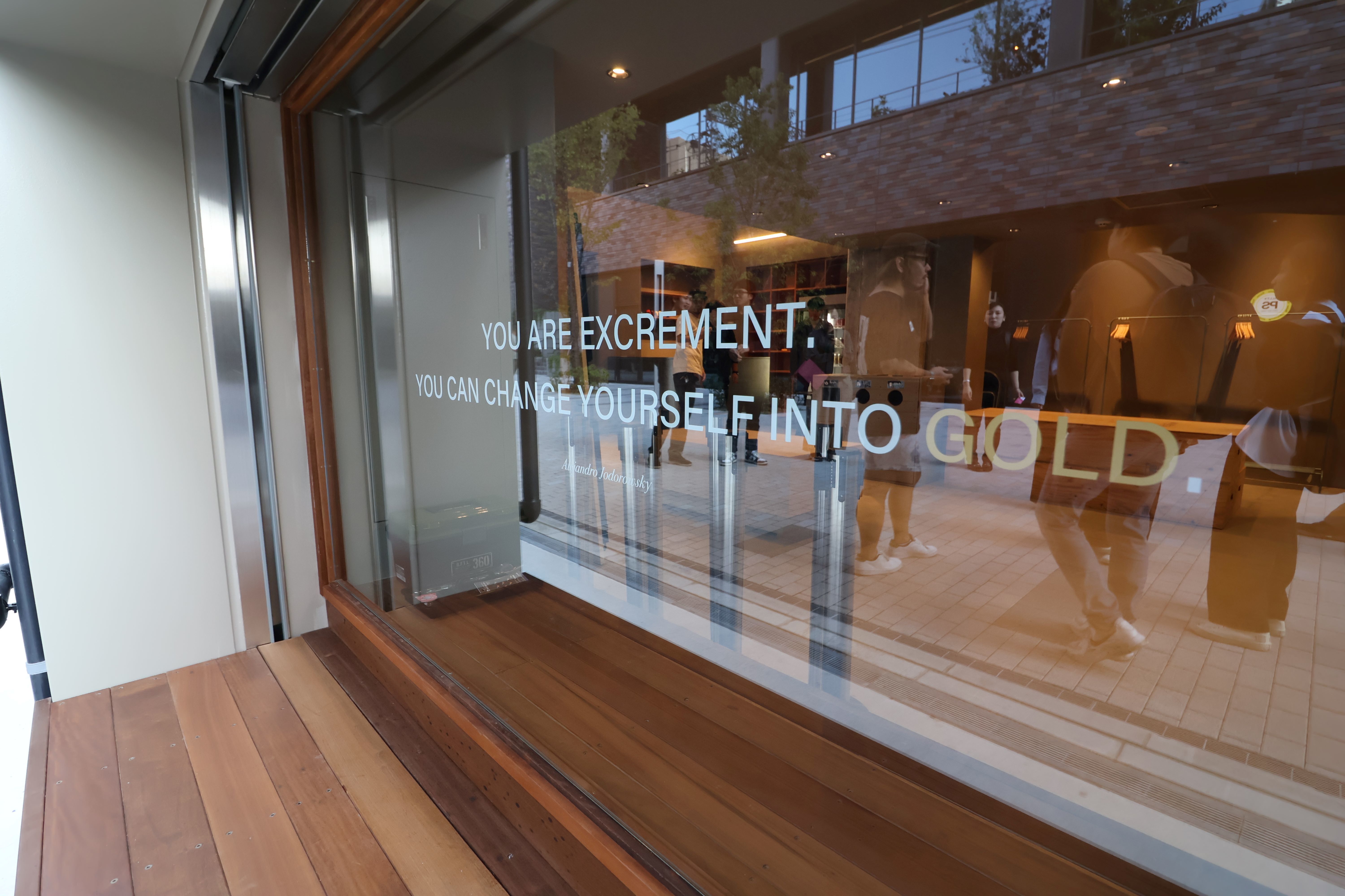 「META VALLEY」と「HOLY MOUNTAIN」は隣接しているので、両会場を使用したサーキットや配信イベントなどの開催も可能。各会場の楽屋エリアは基本的には扉で隔たれているが、サーキットなど用途に応じて扉を開放することで其々の会場の裏動線を繋ぐことも可能。「HOLY MOUNTAIN」のエントランスにある窓には英語でとあるメッセージが記されている。訳詞はパンチがありすぎるので割愛するが、これから両施設で生みだされる大きく光り輝くムーヴに期待が高まる。