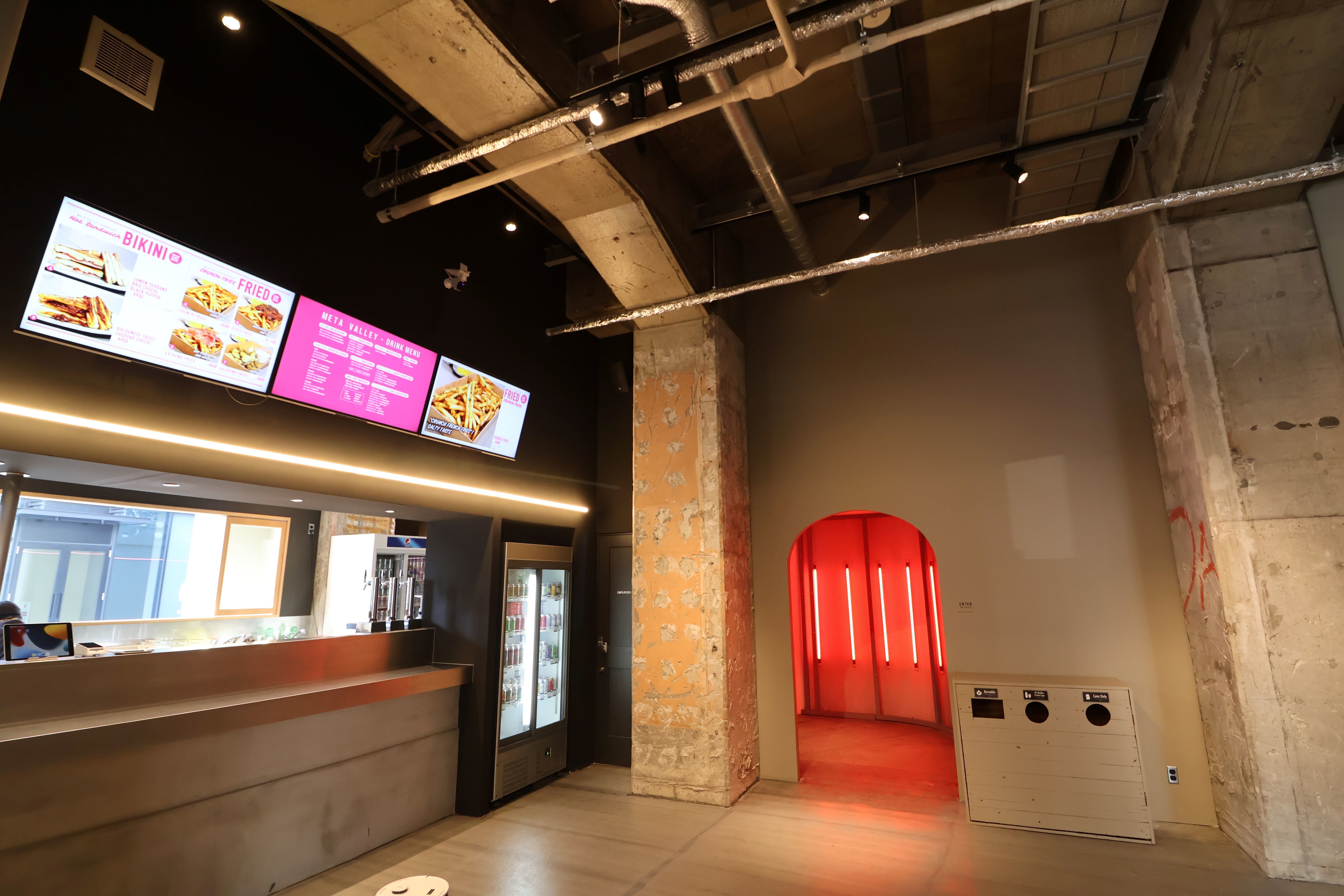 まずは「META VALLEY」から紹介していこう。店内はコンクリを基調としたシンプルなデザイン。開放感あるエントランスに入ると、ライブハウスでおなじみのドリンクのほか、こだわりのクラフトビールなどを提供している。フードにはスペイン・バルセロナのソウルフードとして人気のホットサンド「ビキニサンド」やフライドポテトなどを販売。こちらのパティオエリアは、常時フリーエントランスとして開放しているので、日中はカフェやパブとしても使える。バーカウンターのヒップバーに腰掛けてのちょい飲みなんかも楽しそうだ。