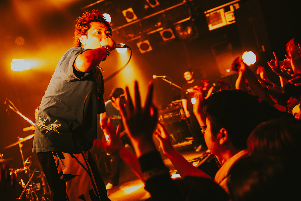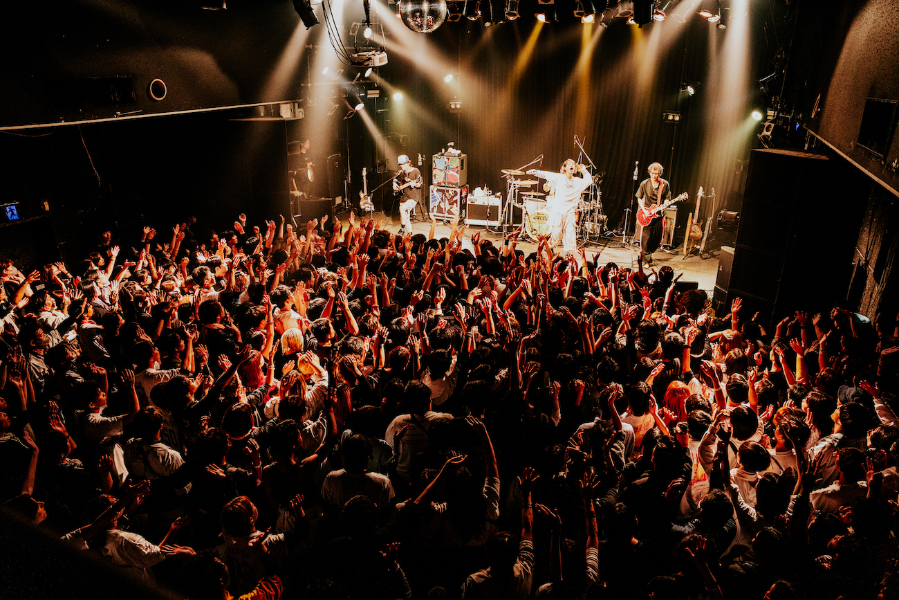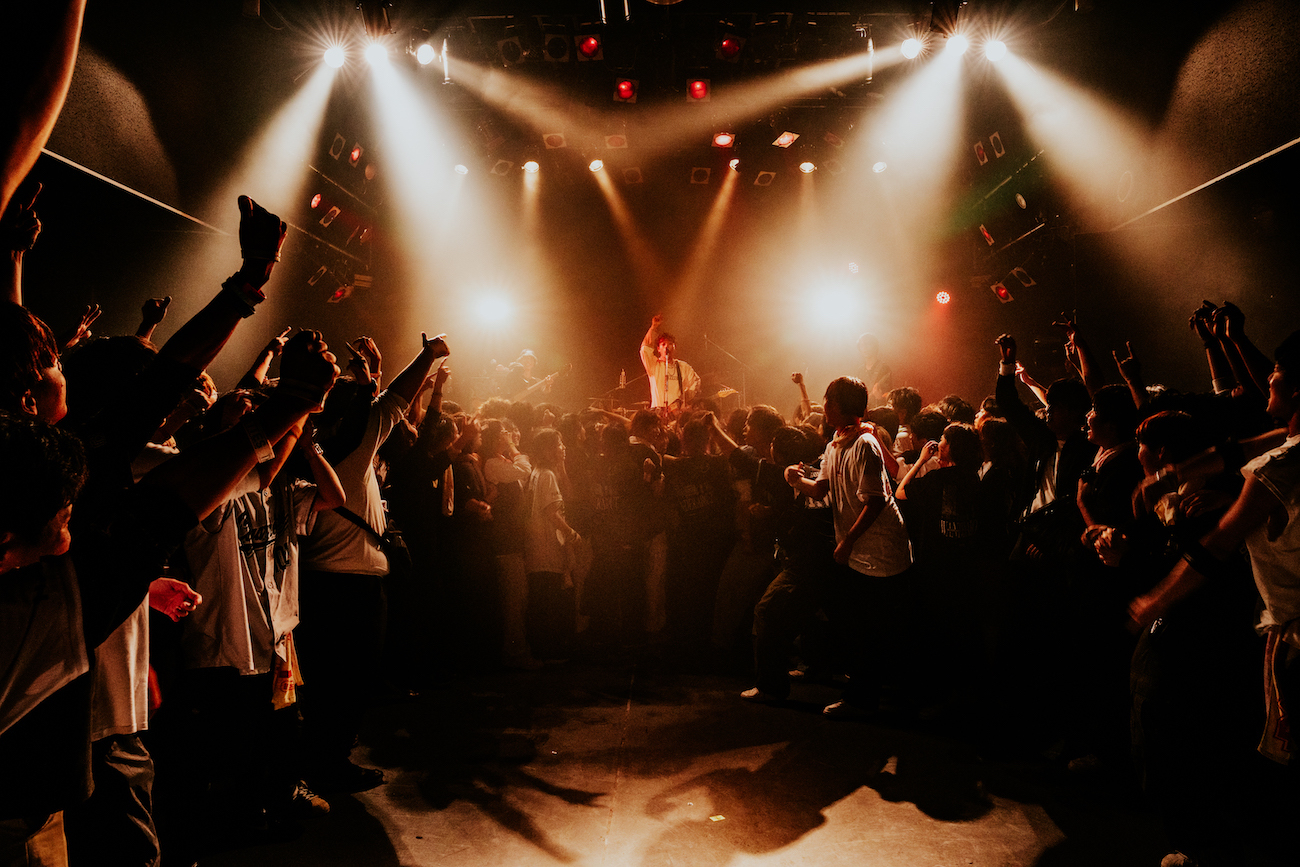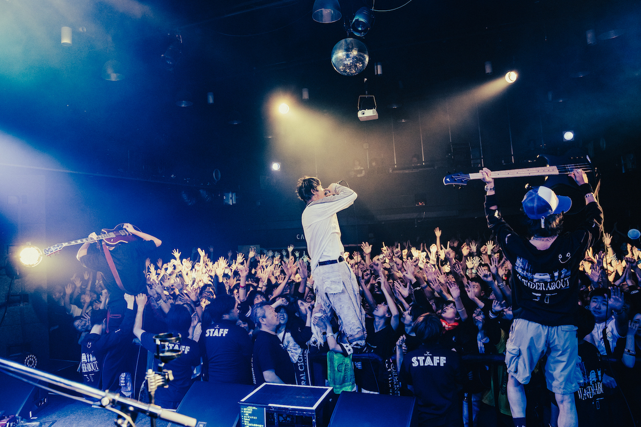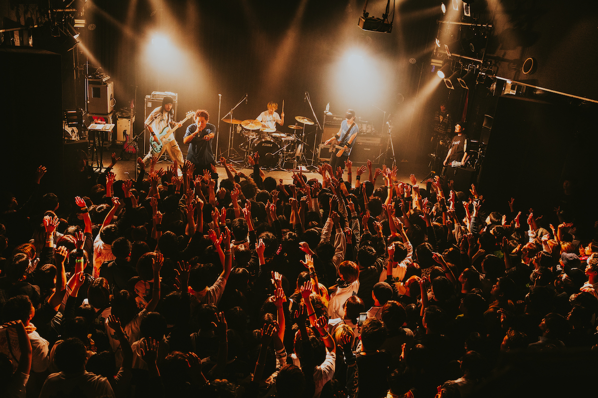 「九州ツアー回ってきました! AFJBの時のフロア、めちゃめちゃ楽しそうやった。一緒に来てよかった。AFJBに大きな拍手を」。後輩バンドへの敬意に会場から拍手が湧く。「あたたかく迎えてくれてありがとう。ラストまでもっともっと盛り上げてもらって、ずっと離れないところまで持っていってもらえたらうれしいです! 今日一番の声、最高の歌声聞かせてくれますか!」