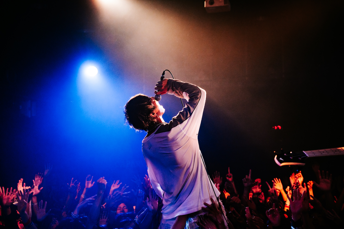 1曲目、バンドサウンドが弾けるロックナンバー「GET BACK」。1曲目とはいえバンドはすでに完成形ともいうべき一体感で、今ツアーで得られたものの大きさがうかがえる。オーディエンスの手拍子と掛け声に「鹿児島ー!」と再び雄叫びを上げた山中。「ここまで来いよ!」とダイブを呼び込むと、客はオーディエンスの波に乗り次々とステージへ向かう。「さあ!回れ!」。間髪を入れず続けた「STARGET」では、サビの<廻る 廻る>の歌詞に合わせてサークルモッシュが発生。ライブハウスごと揺れるオーディエンスを前に、体をくねらせて歌う山中のパフォーマンスも絶好調だ。