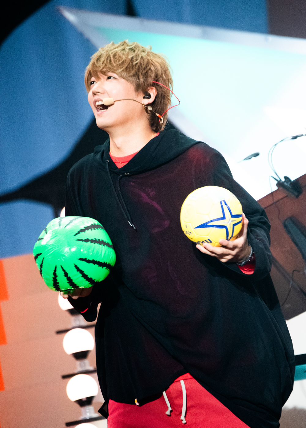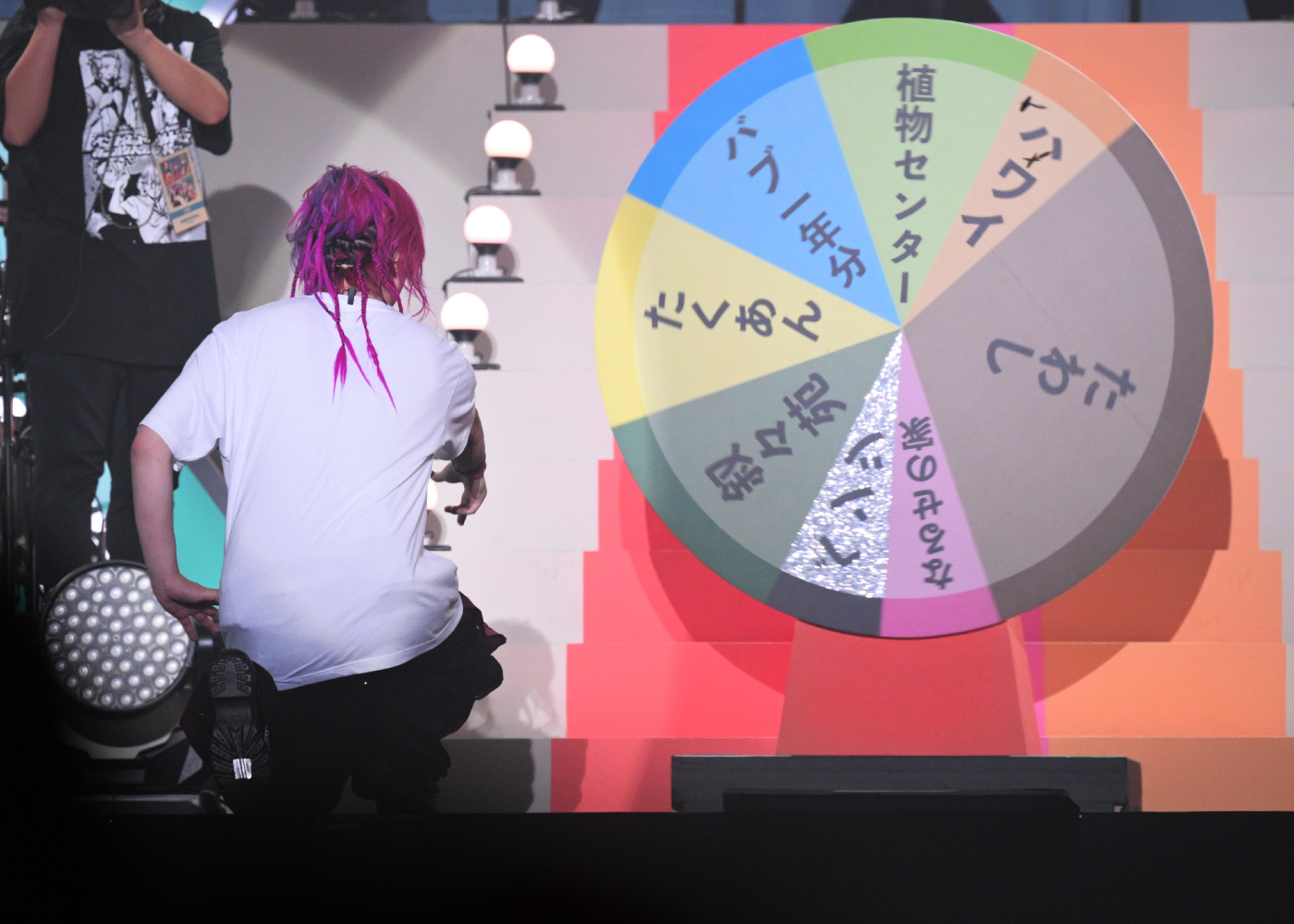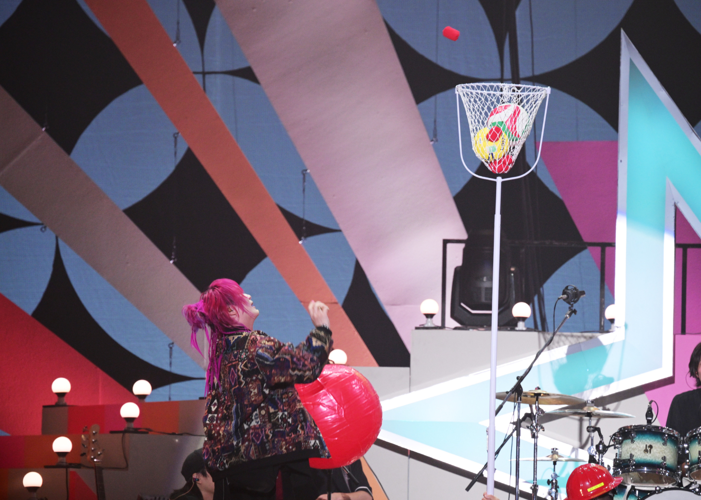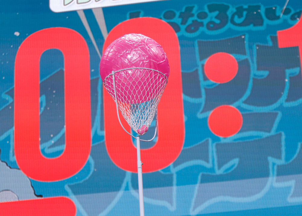企画についてはnqrseが「(企画)を4つ用意しました。ポイント制で、ポイントが高い人が勝利です。勝った人には賞品があります」と説明。しかも賞品の中にはベンツ(!?)があるそうで……それが本当かどうかはともかく、ステージ上ではスタッフがもくもくと企画その1となる玉入れゲームの準備を進めている。使用する玉はハンドボールからバランスボール、玉ねぎの模型、バレーボールなど様々。なぜかバランスボールに1万ポイントという破格のポイントがつけられ、3人は開始の合図とともにガチで玉を投げ入れる。めいちゃんは一発で1万ポイントのバランスボールを玉入れカゴに乗せることができたのだが、これが後に明暗を分けることに……。他のふたりはまず入れやすいボールを入れたあとで、バランスボール乗せにも成功! そう、お気づきだろうか……最初にバランスボールでカゴの入口をふさいでしまっためいちゃんは追加のボールを入れられなかったのである(苦笑)。結果、小さいボールを何個も入れ、最後に大物のバランスボールを乗せたあらきが玉入れゲームを制した。