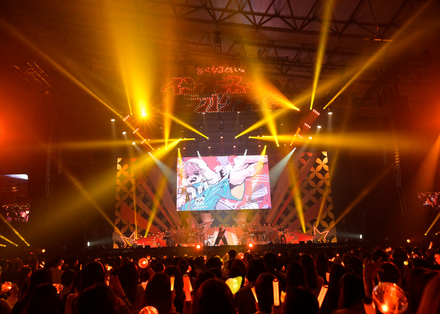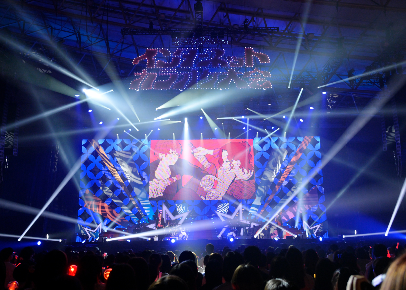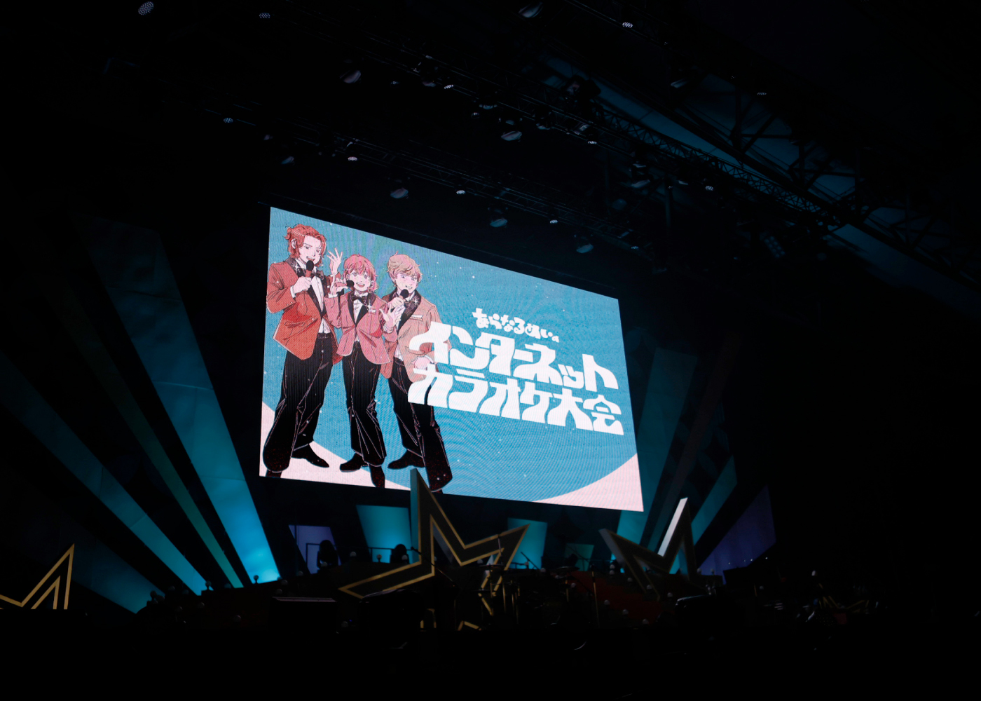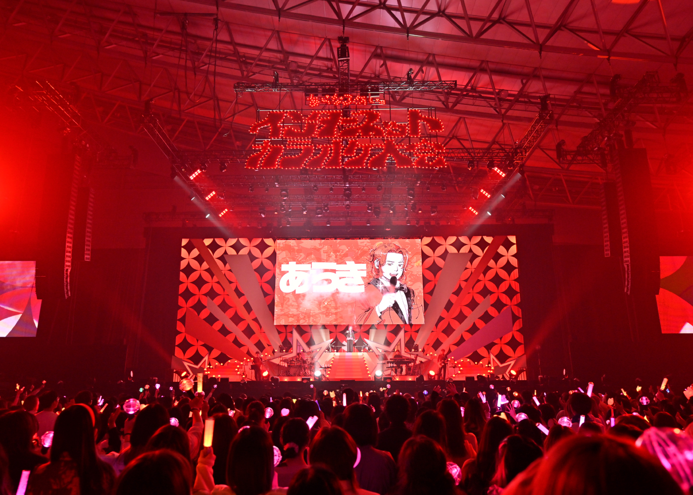 まず初日の“インターネットカラオケ大会”は、人気の名曲を3人が歌唱するという、まさに“あらなるめい”の能力全開放とも言うべきセットリスト。開演時間を少々押したところで場内が暗転してライブがスタート。ステージ後方に作られた壇上に現れた3人はたちまち大声援に包まれる。客席は赤(あらき)、ピンク(nqrse)、オレンジ(めいちゃん)のイメージカラーがきらめくペンライトで埋め尽くされた。1曲目は「ヴァンパイア」。錚々たる歌い手達に愛されるダークでアッパーな人気曲。あらき、めいちゃんがハイパーな高音ボーカルで圧倒し、nqrseはクールなラップを披露。冒頭からアツいパフォーマンスで2万人のオーディエンスを引き込んでいく。カラオケ大会とは言いつつも、楽曲はバンド演奏なので、ブチ上がり度は満点。ネットでおなじみのアニメーション動画が同時にスクリーンに映されるのも“歌い手”のライブならではだ。続く「QUEEN」も目まぐるしく変わるボーカルパートにテンションは上がりっぱなし。やはりライブで聴く歌のパワーは別格だ。ネットでは聴きなれた歌も、目の前で放たれる歌声にはかなわない。3曲目の「アニマル」を歌い終えると、この日初のMCタイムに突入。