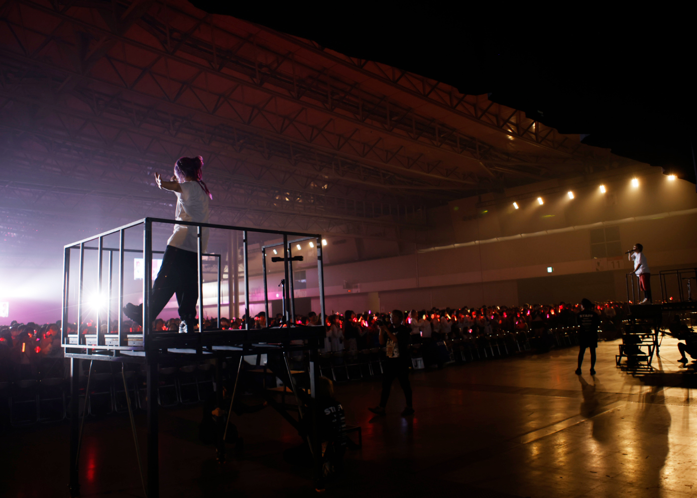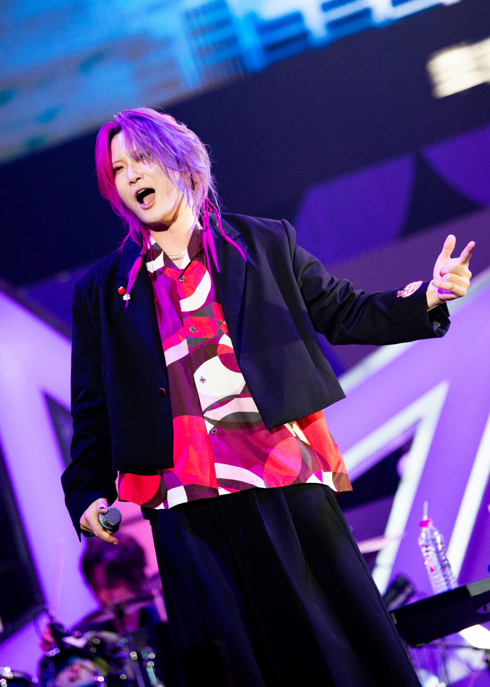 22日、またしても幕張メッセ周辺は開演前から大混雑。どうやら2日間通しで観覧するファンも多いようだ。キャリーケースを転がす遠征組のファンも目立つ。開演時間となり、照明が暗転。昨日同様、ステージ後方の壇上に現れたあらなるめいのお三方。オープニングは「ヴァンパイア」で、2曲目が「アニマル」という前日に近い進行。とはいえ、アガる楽曲に場内はたちまちペンライトが揺れる熱いライブ空間に変貌していった……が、このあとからガラリと空気が変わる。生放送の企画で多くの人を楽しませている彼らが、何とステージ上で生のバトルを繰り広げる展開に挑戦! 2万人の大観衆をどこまで引き込むか、その実力が試されるところだ。