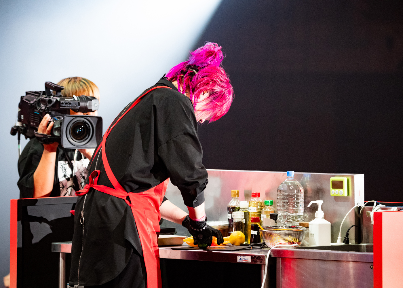 続く企画その3は、なんとクッキング対決。ステージにはキッチン台がふたつ運び込まれ、かなり本格的。nqrseは料理に参加せず、あらき、めいちゃんの料理を実食して勝敗を決める係に。ふたりに突きつけられた料理はインド料理の“パニール・ティッカ”。会場に問いかけても、この料理を食べたことがあるのはごく少数。大多数が実態のわからない“パニール・ティッカ”を、あらきとめいちゃんは料理名の響きやイメージで用意された食材を使い、10分で完成させなければならない。ここでワザありだったのはあらき。正解かどうかはともかく、マイ包丁まで持参し、慣れた手つきで調理を進めていく。めいちゃんはフライパンでお湯をわかしているだけのように見えたが……。タイムアップ後に判明した本物の“パニール・ティッカ”とは、カッテージチーズを使い、野菜と串焼きにしたような料理だそうだ(かなりザックリな説明だが……)。あらきが作ったのは、インド風(?)の炒め物。ただ、nqrseは「いちばんウマい!」と絶賛。一方のめいちゃんは、ペヤングを作っただけ(?)という変化球を投げてきた。それもnqrseは「ウマい!」と評価したが、ここはあらきに軍配が上がる。