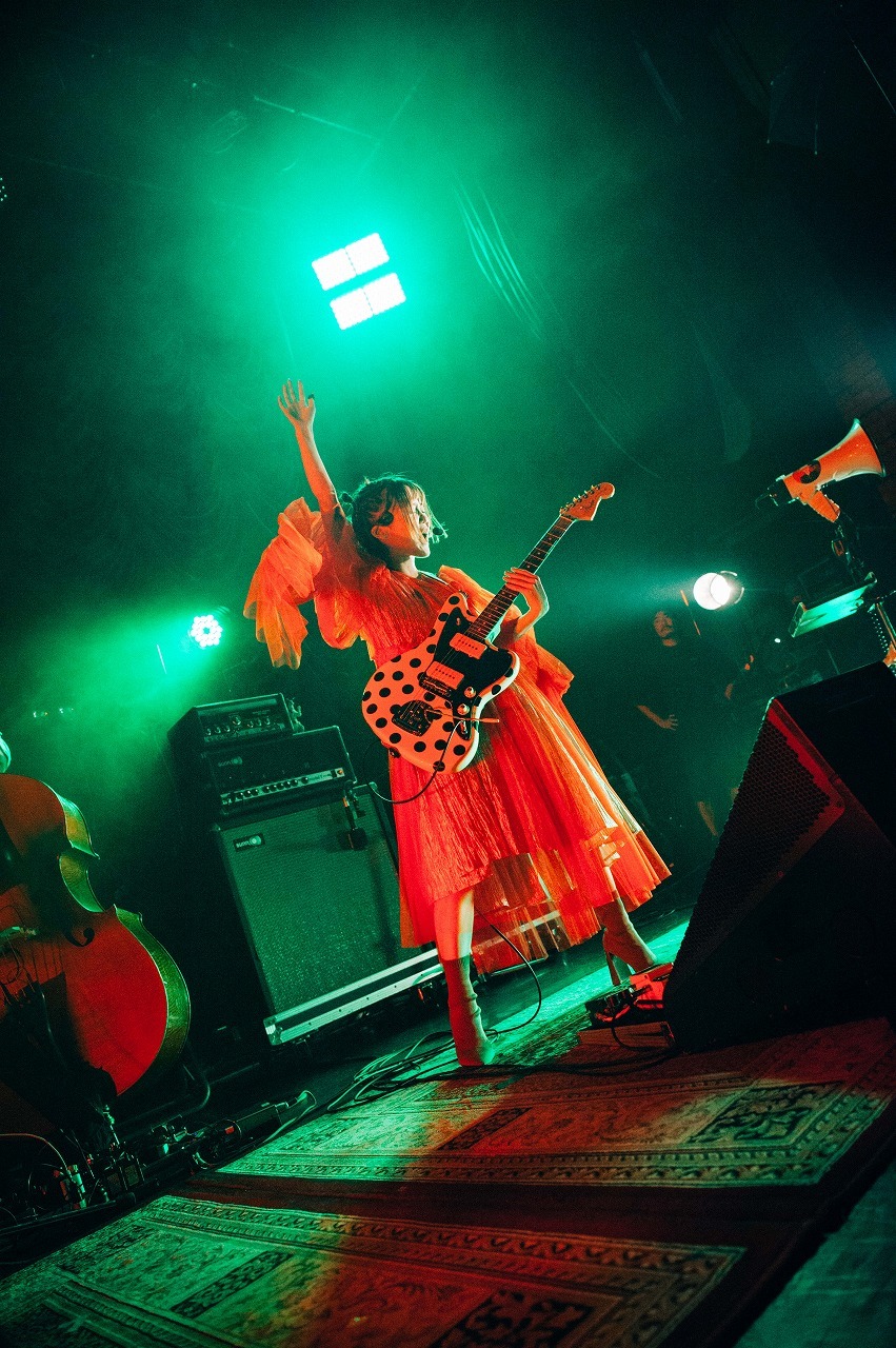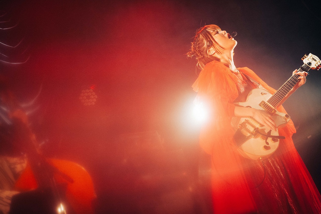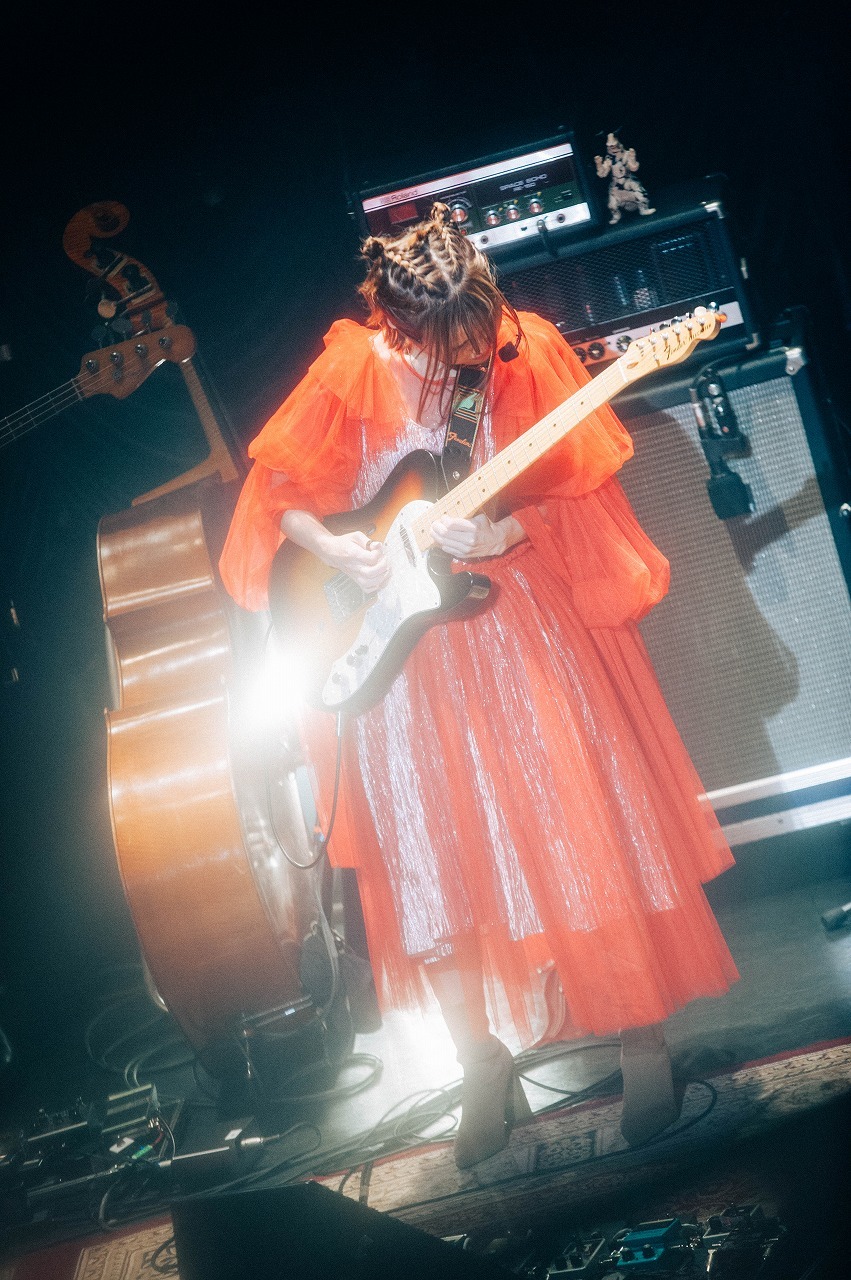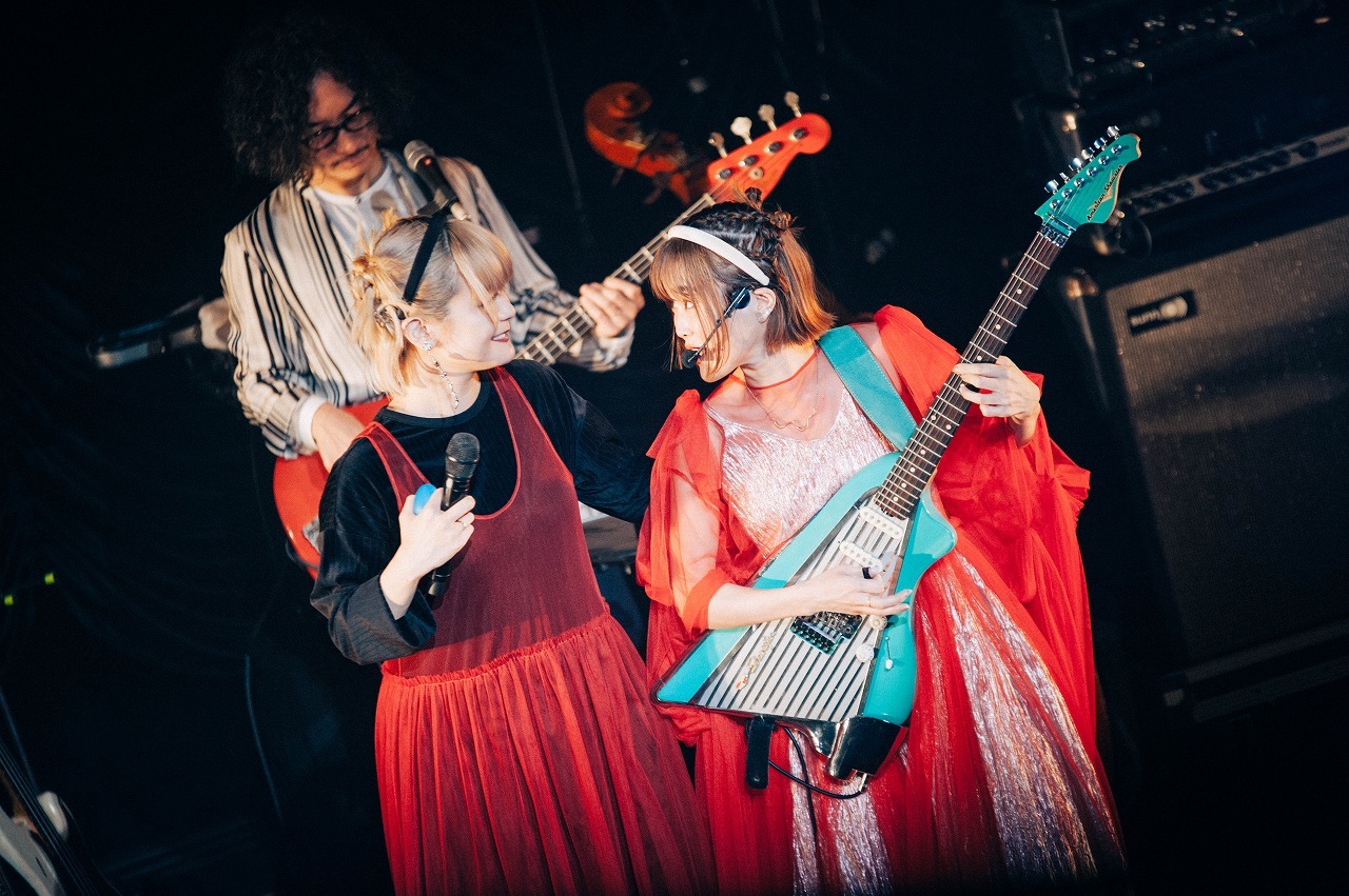 この日のリズム隊は、ベースが真船勝博、ドラムスが伊藤大地。EGO-WRAPPIN’やハナレグミなどいろんなところで組んできた黄金のバッテリーで、Reiもこれまでそれぞれと何度も演奏してきたが、トリオでやるのはそういえばこれが初めてだと言っていた。が、そこは信頼と実績の賜物。長くこのトリオでやってきたかのように息のあったグルーブがあり、Reiのギターの暴れっぷりもいつにも増して凄まじい。ストーンズみたいなギターリフもかっこいい「MOSHI MOSHI」、「キネマ倶楽部、アー・ユー・レディ?!」の煽り声に始まりRei流のラップも炸裂した「QUILT」、ビートルズの「Birthday」(「You say it’s your birthday」の《birthday》を《friday》に変えて歌っていたこと、みんな気づいたかな?)とノリのいいロックが続き、その曲の途中で吉澤嘉代子を呼び込んだ。因みにこの夜のReiはよく映える真っ赤な衣装も鮮やかだったが、手を小さく振ってにこやかにサブステージからの階段を降りてきた吉澤嘉代子も赤系統の衣装。ふたりの共演は吉澤にしてはロック成分ありの「未成年の主張」でスタートした。吉澤が前に出て跳ねたりもしながら歌い、その横でReiが弾く。ときおりReiも前に出て並ぶと、曲調のガールポップ感も手伝い、Reiの動きや表情もいつもよりガーリーに。そのあとのふたりの言葉のやりとりがまたさらにガール感出まくりで。例えばこんなふう。