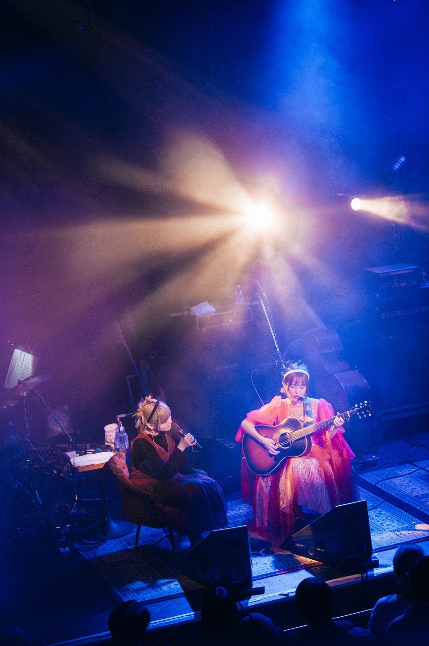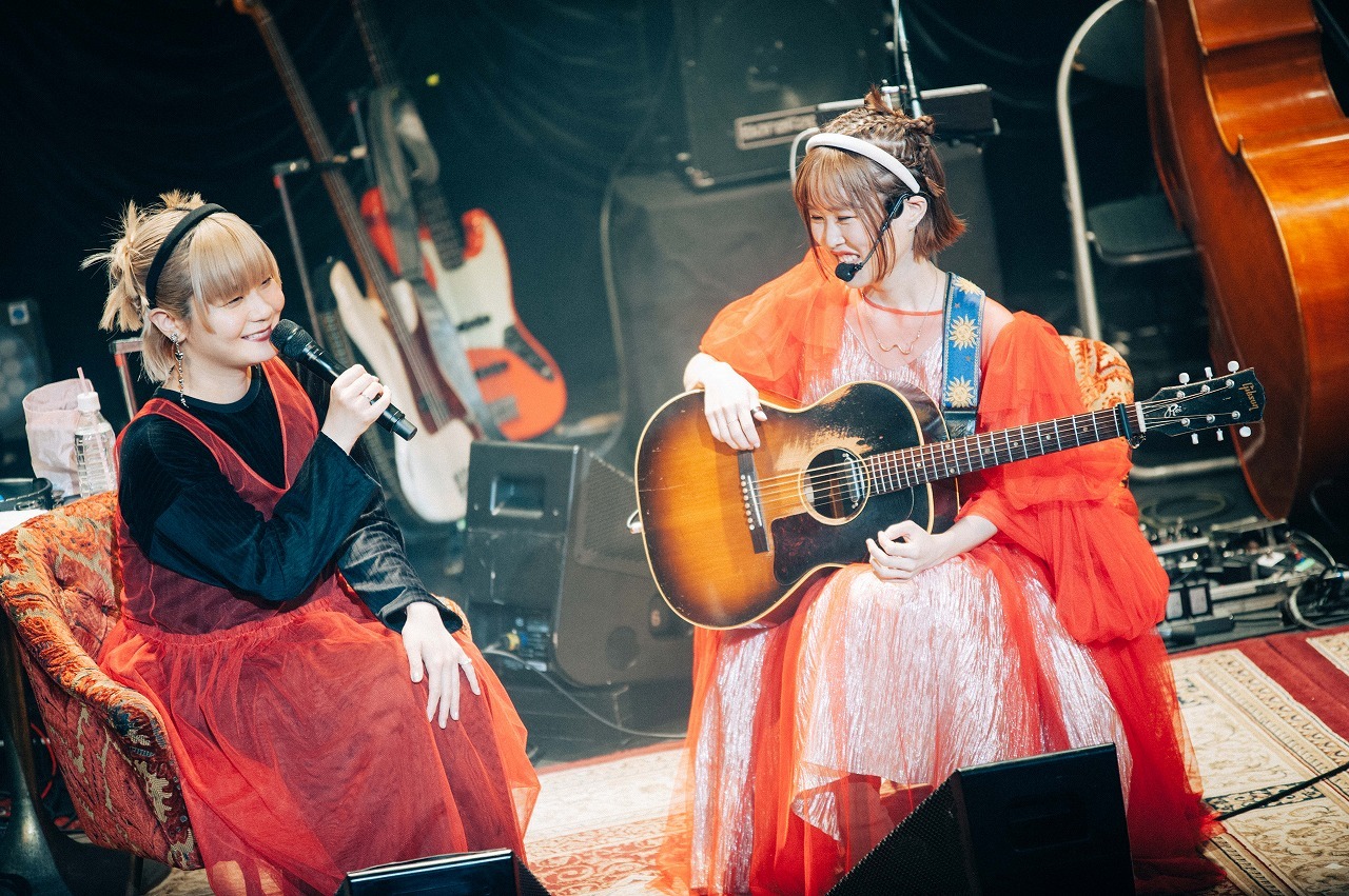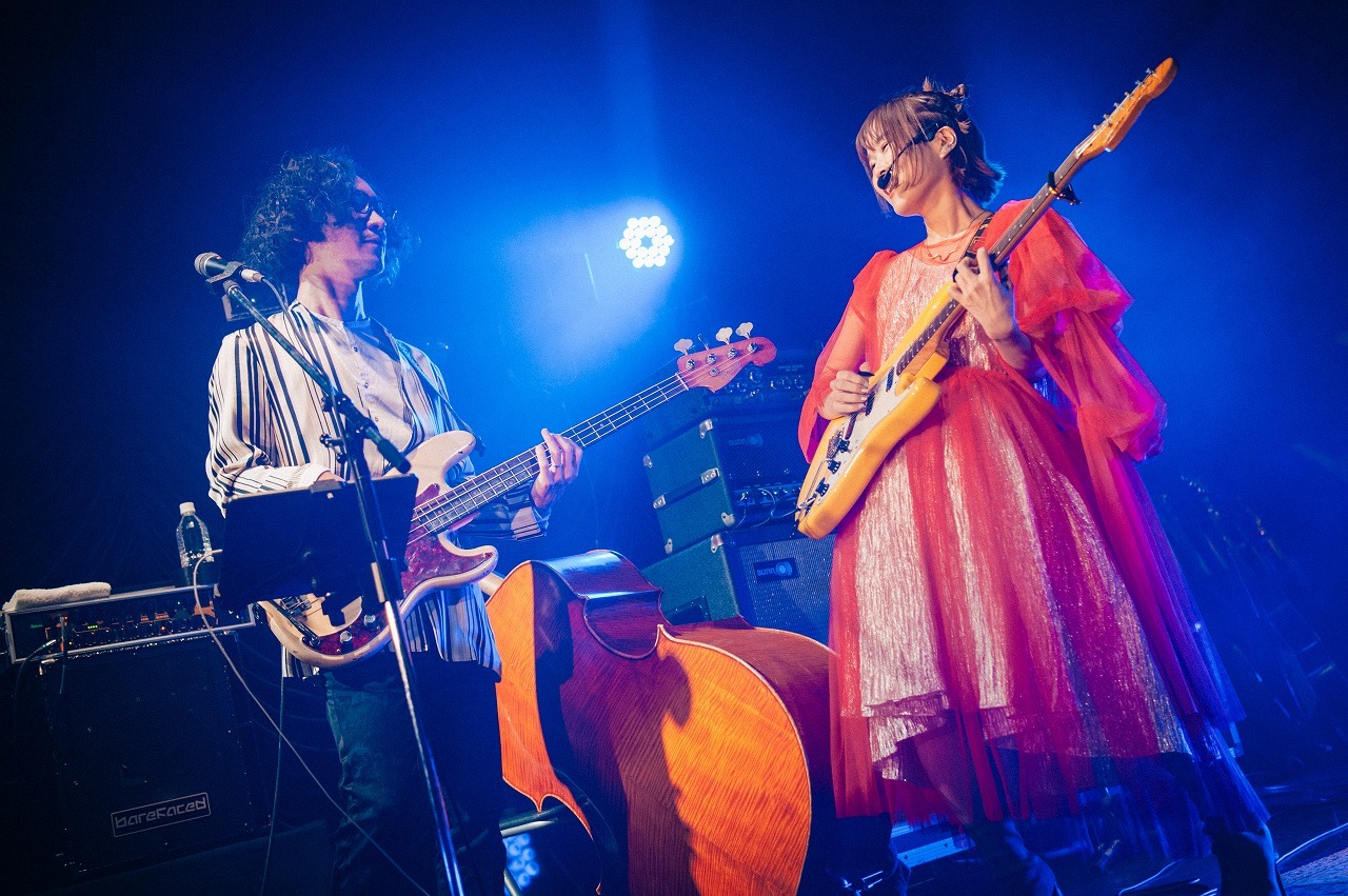 そんなほんわかユルMCも挿みながら、そこからしばらくは楽しくもあたたかな共演時間。まず「アン、ドゥ、アンドゥトロワ」とフランス語カウントで始まった荒井由実のカバー「ルージュの伝言」は原曲よりテンポを落として演奏。歌い終えて「楽しい。友達とライブできるなんて」と吉澤がつぶやけば、Reiは「嘉代子ちゃんは歌で女の子の気持ちを代弁してくれて、なんでこんなにパーソナルな気持ちがわかるんだー?!って」。吉澤がReiについて「本当にこんな誠実な人はいないなっていつも思う。今回も犬のシールをたくさん貼ったたたき台を用意してくれて」と話すと、Reiはふにゃっと照れながらも「作家としての嘉代子ちゃんに影響を受けた曲があって。一緒にやりましょうか」と言い、「うん。私の大好きな曲を一緒に」と吉澤が応えて「Categorizing Me」を。そこではふたりがメインとコーラスを交替でとり、《わたしのことをちゃんと見つめてよbaby》のところでは“ちゃんと”見つめ合うふたりだった。“女の子”の“ホンネのカケラ”。吉澤がその表現に長けたシンガーソングライターであることはよく知られているが、「Categorizing Me」のリリックからもわかる通りReiにもそういう側面があって、その“女の子”成分が吉澤と歌ったり話したりすることでこぼれ出る。次の吉澤の妄想爆発昭和歌謡風味曲「地獄タクシー」が始まる前には、Reiがタクシーの運転手、吉澤が乗客に扮しての寸劇もあり、普段のReiのライブでは見られないコミカルな側面がそうして出ていたことにも得した気分になった人が少なくなかっただろう。