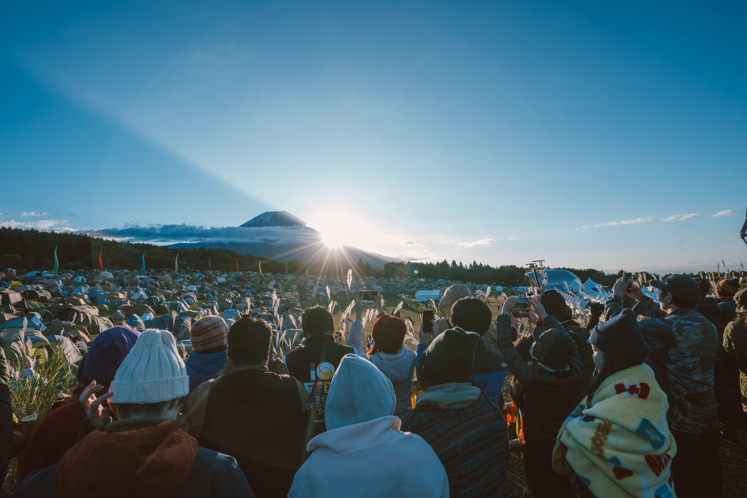 星空観察後の夜、予想以上に冷え込んだせいで何度も起きるはめに。前年の『朝霧JAM』では何の問題もなく使用できたマイナス3度対応の寝袋ではまったく歯が立たない厳しい寒さで、最後はヒートテックの上からベンチコートを着て寝袋に入り、どうにか就寝できました。例年よりも2週間遅れでの開催となった今回はその気温差を痛感しましたし、寝不足で翌朝の日の出も見逃しました。月曜の朝には富士山越しに輝く日の出を観ることができたのはラッキーでしたが、次回も同様の日程での開催となるならば持参するギアの見直しが必要です。