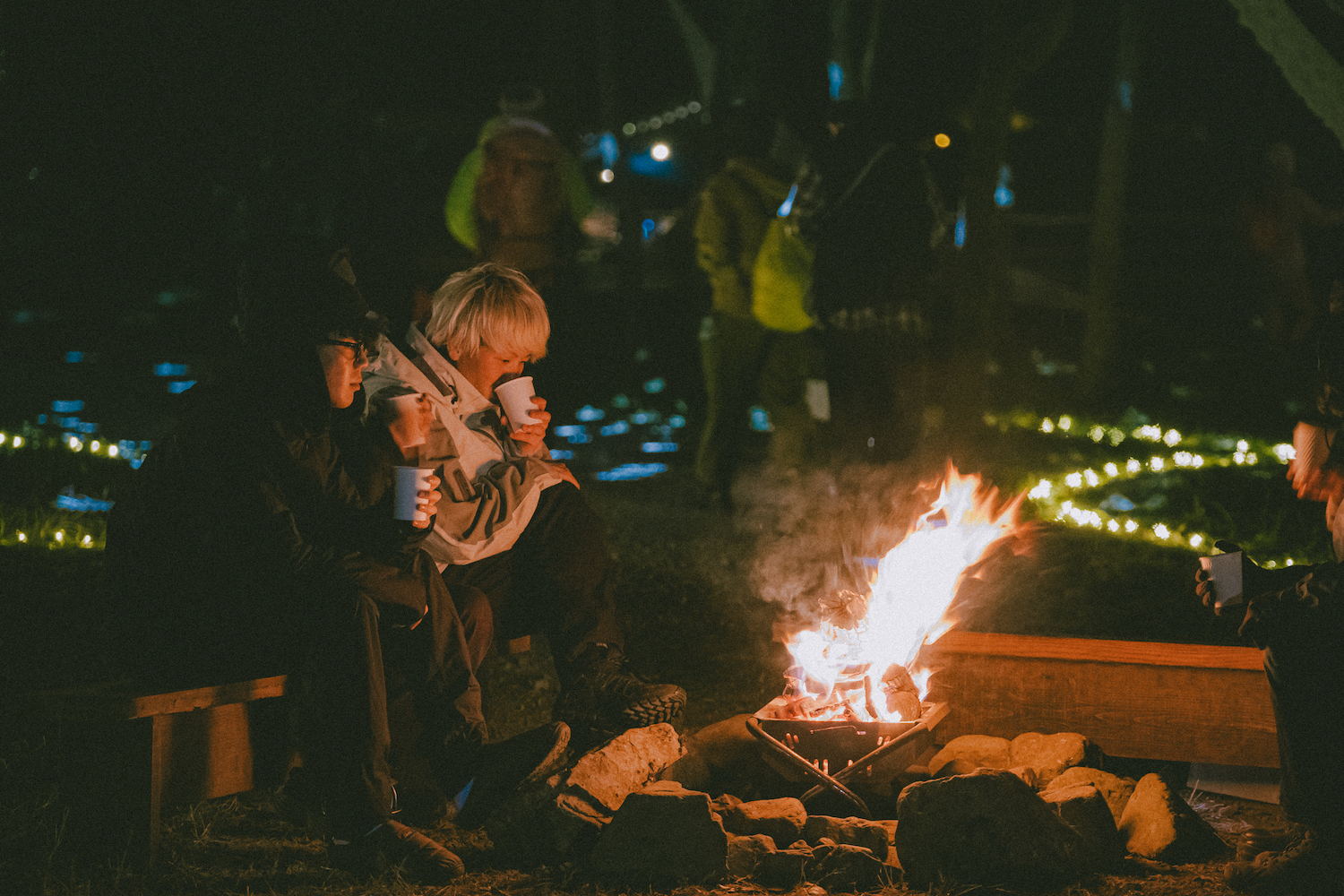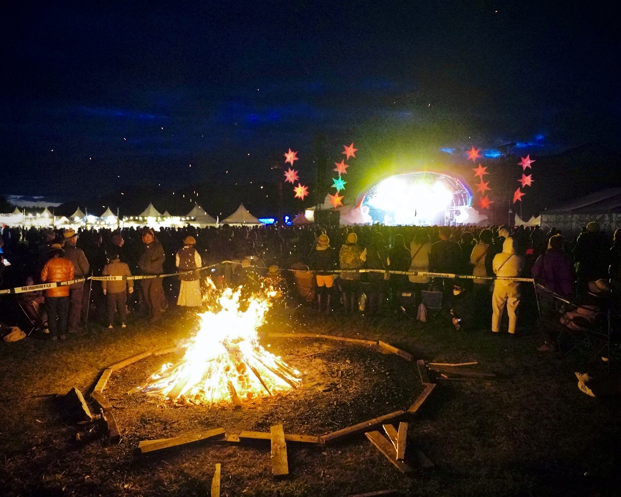 標高900mの朝霧高原では、秋の深まりがひとあし早く感じられることに加えて、今回はこれまでよりも開催時期が2週間遅くなったことで夜の冷え込みは予想以上に厳しいものでした。1日目は夕陽が落ちると一気に寒くなり、RAINBOW STAGE後方にある大きな焚き火には暖を取ろうとする人だかりができていたほど。2日目は前夜の教訓を活かしてフル装備で臨んだからか、最後まで寒さをほとんど感じずに過ごせましたが、初日は風もあったのでかなりこたえました。