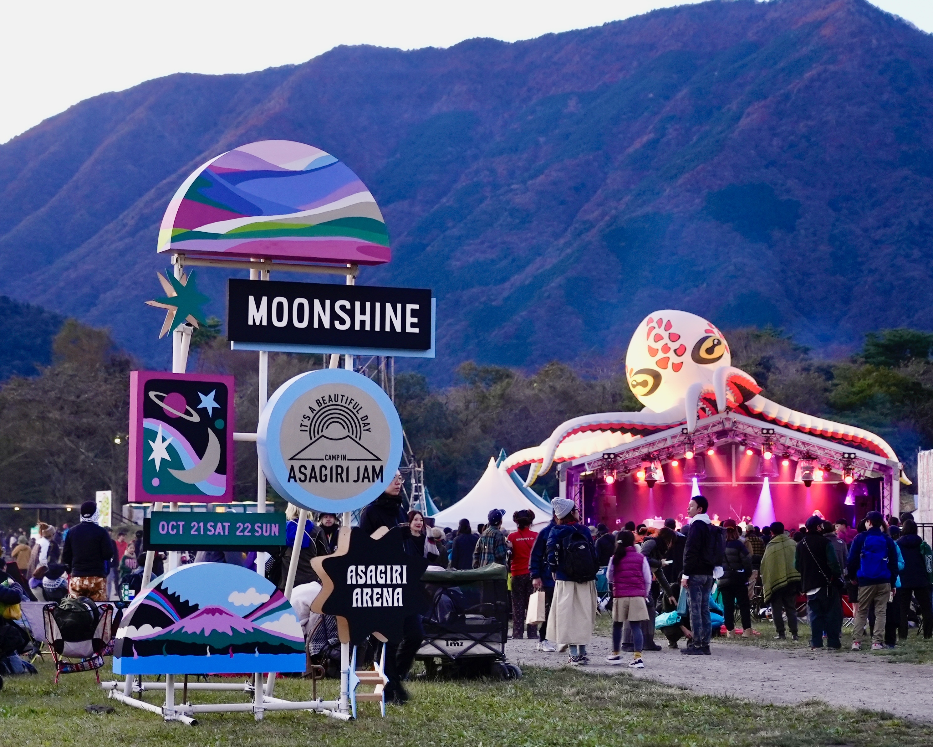 2019年は台風の影響で中止、2020年、2021年はコロナ禍により開催されず、2022年に復活。20回目を迎えた今回の朝霧アリーナ場内には、RAINBOW STAGE、MOONSHINE STAGE、CARNIVAL STAR、朝霧ランド&KIDS LAND、インフォメーションエリア、そしてCAMP SITE A、CAMP SITE Bが配備され、地域密着の温かみは残しながらも規模的には大きく、独自路線を走る野外フェス。そんな『朝霧JAM』をぐるりと歩いてきました。
