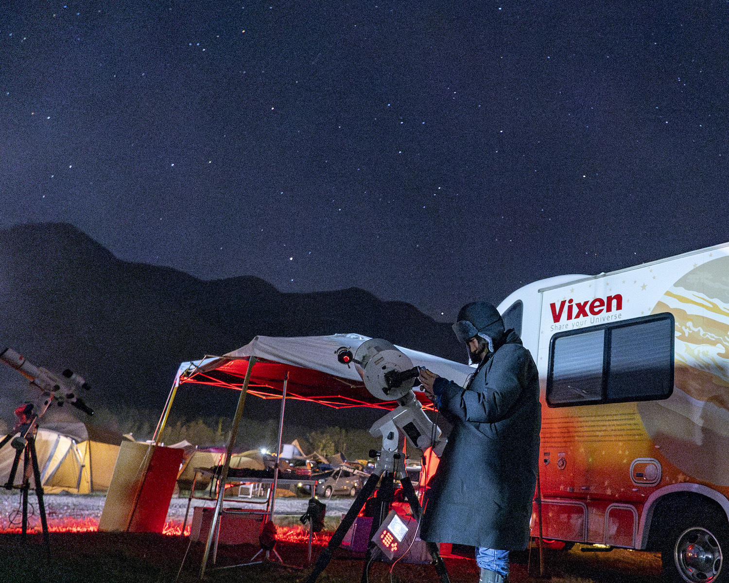 Vixenの望遠鏡を使い、説明を受けながら土星やオリオン星団を観察。土星の輪っかもしっかり観ることができて大はしゃぎの子どもたち。頑張って遅くまで起きていた甲斐がありました。この日はオリオン座流星群のピークを迎えるという好機にも恵まれ、満点の星が輝く美しい夜空に流れる星を肉眼で観ることができました。これには大人も大興奮! 筆者は3つの流星を、子は8つの流星を観測しました。