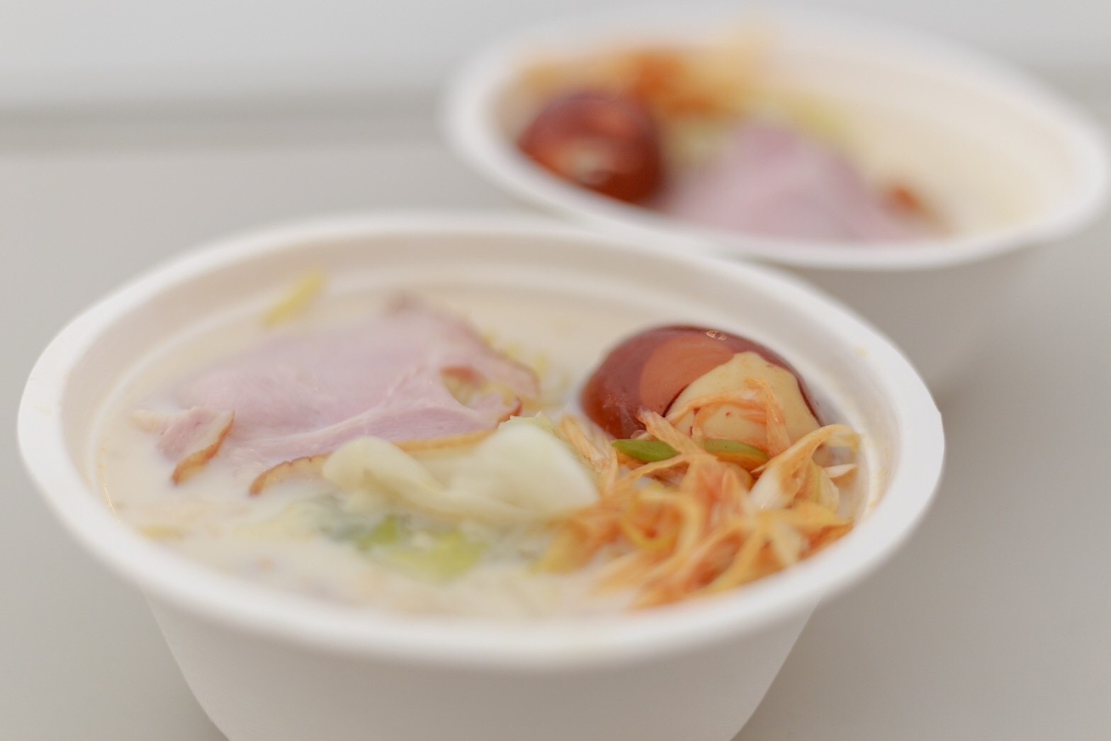 ミルク味噌ラーメンは“地元の牛乳を推したい”というテーマの下で開発が進められた一品で、最初はラーメンではなく“ミルクうどん”として試行錯誤が繰り返されたそう。ミルクに味噌を足すことでコクと味変を楽しめるようにし、トッピングも多数用意してカスタマイズできるようにしたほか、“折角だから富士宮名物のやきそば麺を使ってみよう”ということになり、うどんからラーメンに変更されて完成したそうです。肌寒くなった夕暮れ時に食べたのも相まってか、優しい味わいが胃袋に染みて、体もじんわり温まりました。同じような考えの人が多かったのかトッピング全部のせは早々に売り切れるほどの人気ぶりでした。