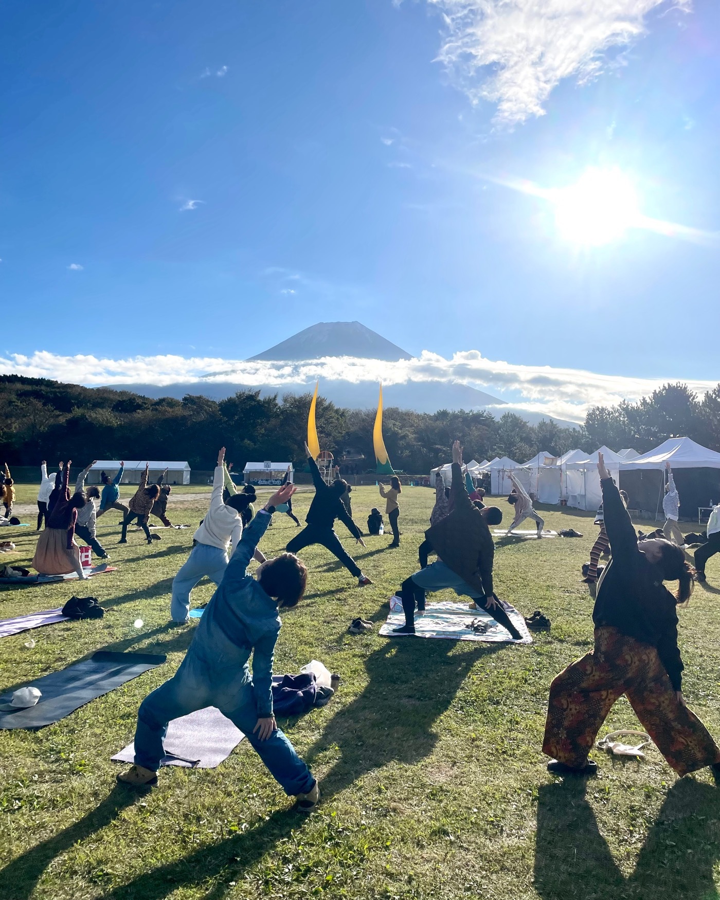 天気がよければフェスサイトの大部分で富士山を臨むことができますが、中でも正面にそびえ立つ富士山とRAINBOW STAGEエリアを一望できる宇宙大使マザーシップは紛うことなき『朝霧JAM』のベストポジションです。入場したら真っ先にここに来て、『朝霧JAM』を象徴するフォトジェニックな景色を眺め、RAINBOW STAGEから大自然に流れ出る音の波を感じながら澄んだ空気を思いっきり吸い込んで、『朝霧JAM』に来たことを全身で実感する。これが大きな楽しみであり、いつしか自分の流儀になりました。さらに今回は、それまで雲がかかっていた富士山が少し顔を覗かせてもくれたので、思わず“ただいま!”と叫びたくなりました。