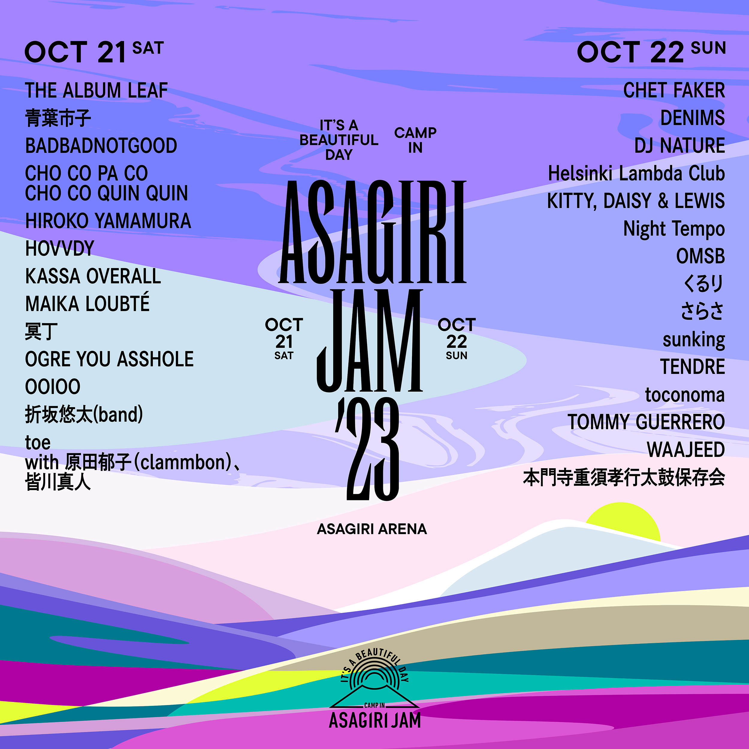 『朝霧JAM'23』の2日間では、国内外あわせて28組のアーティストが出演。台風で中止となった2019年に出演予定だったバッドバッドノットグッド(BADBADNOTGOOD)、OGRE YOU ASSHOLE、折坂悠太、くるりの4組も含まれ、4年越しに約束が果たされました。