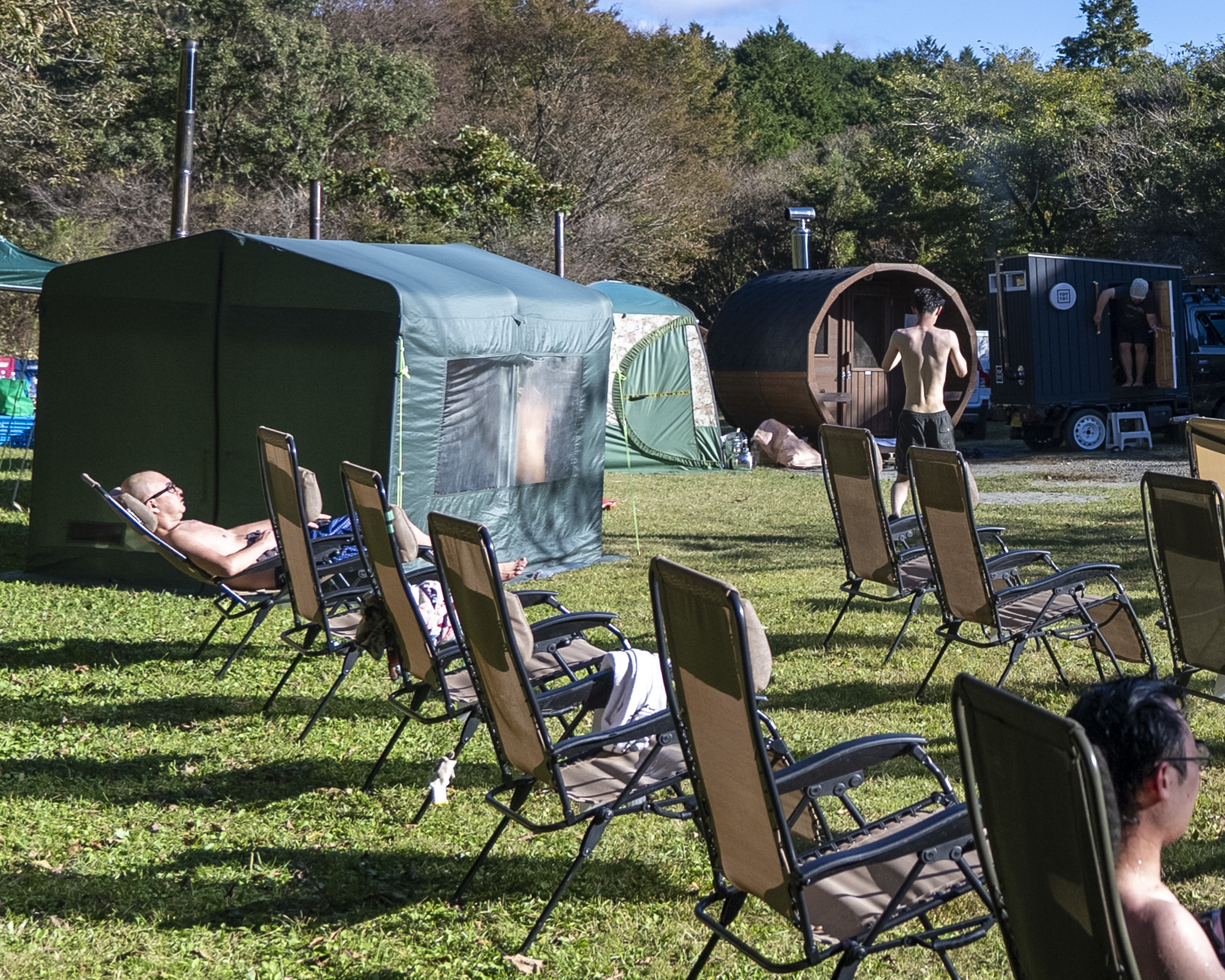 キャンプサイト奥地の「Qサイト」に今回新登場したサウナエリア「サウナ・サンセット」では、富士山を眺めながらバレルサウナ、サウナカー、テントサウナの3種類を楽しめるとあって、予約がすぐ埋まる盛況ぶりだったとか。