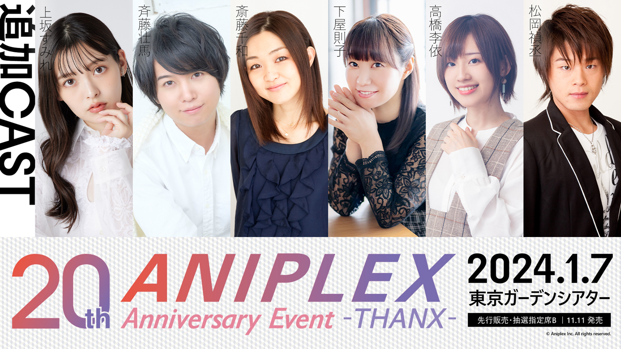 2024年1月7日(日)に東京ガーデンシアターにて開催予定の『ANIPLEX20th Anniversary Event -THANX-』の声優陣の追加出演が発表された。発表されたのは、上坂すみれ、斉藤壮馬、斎藤千和、下屋則子、高橋李依、松岡禎丞の6名。