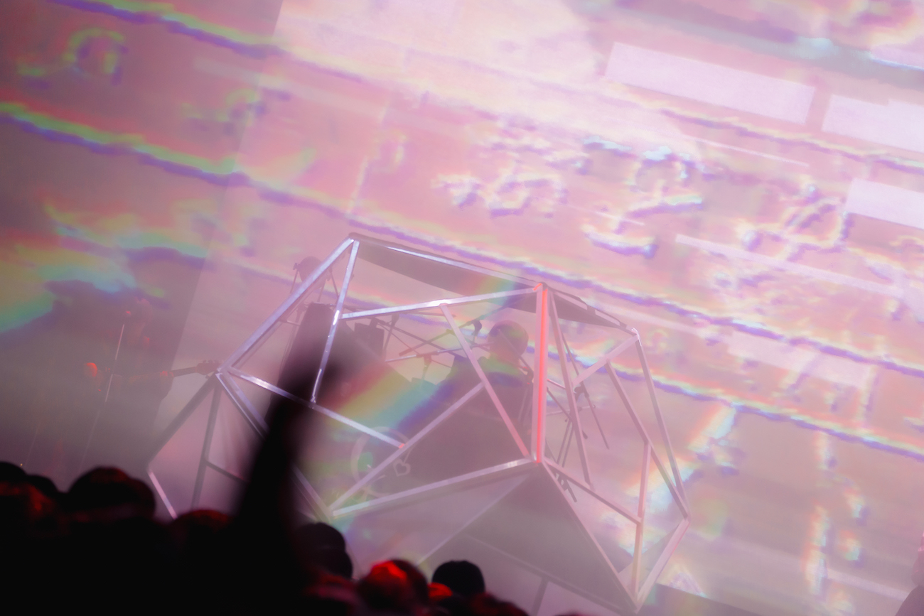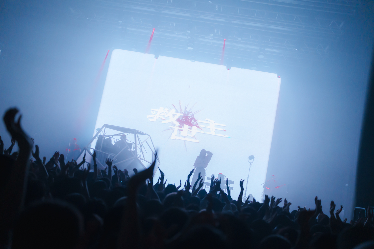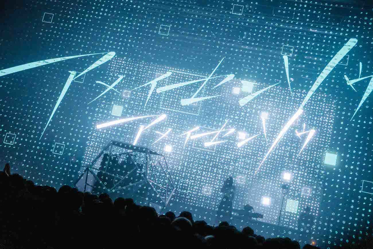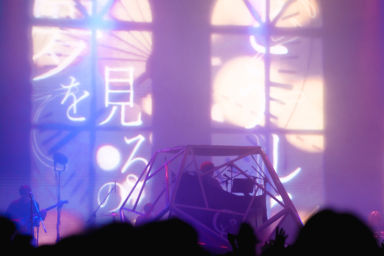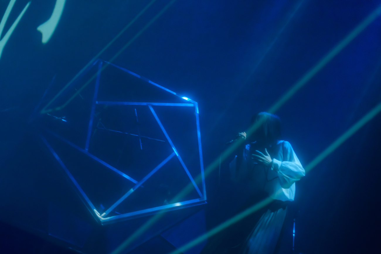 なお、ステージ上にはセンターよりやや下手側に月面基地を思わせるようなフォルムの多角形ドーム型ブースが設置されており、その中にはシンセサイザー類を操るユリイ・カノンの姿が。紗幕越しなうえ、ブースにはほぼライティングが当てられないような演出になっているため、彼が一体どのような表情をみせながらパフォーマンスしているのかまではうかがいきれなかったものの、月詠みの主宰者としてユリイ・カノンがこの空間を絶対的に司っていることは間違いなく、彼はある種の強い存在感を放っていたようにも思う。