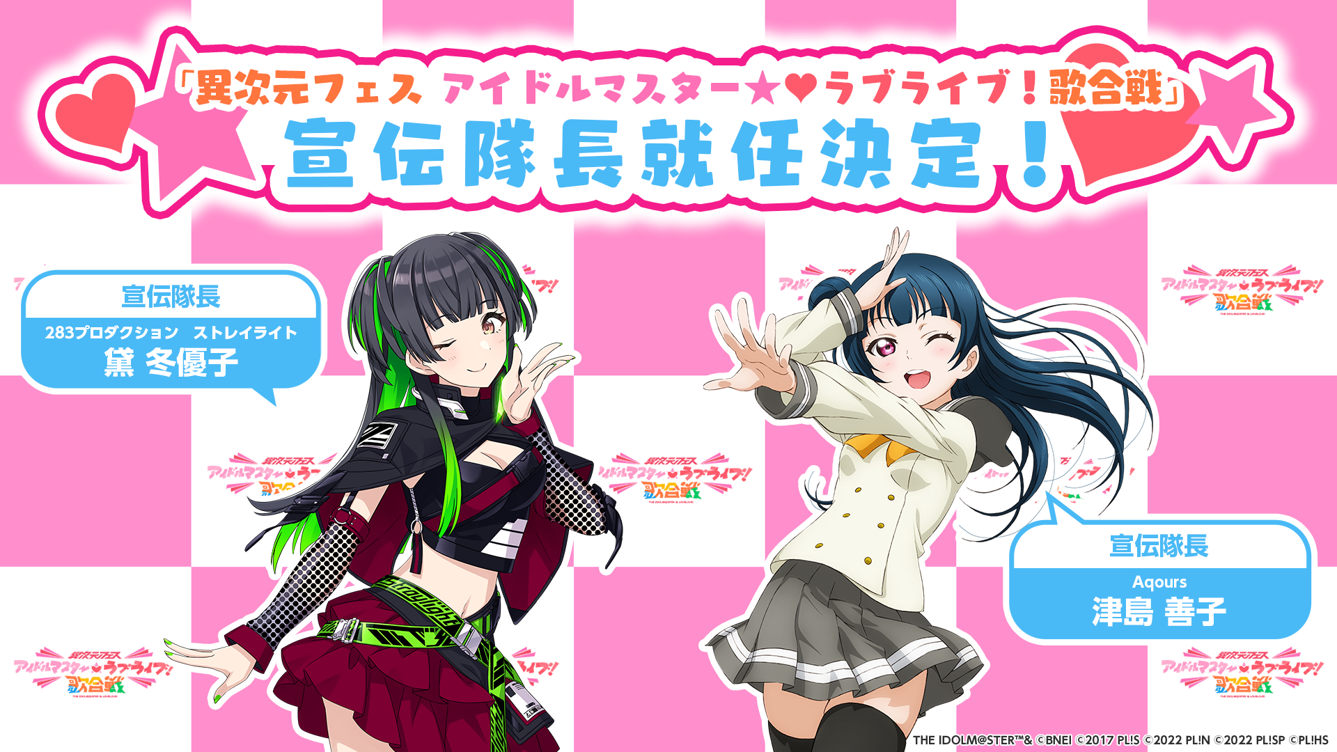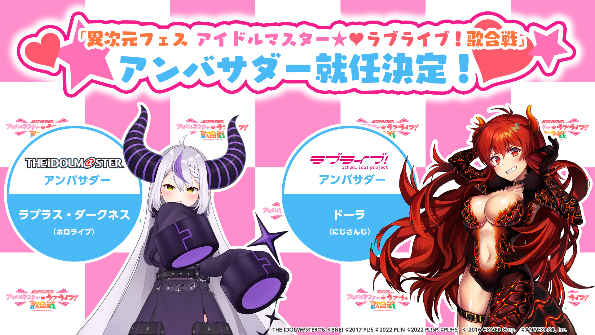 12月9日(土)・10(日)に東京ドームにて開催する「異次元フェスアイドルマスター★♥ラブライブ!歌合戦」の各シリーズからイベントを盛り上げる宣伝隊長として黛冬優子(『アイドルマスター』シリーズ)と津島善子 (『ラブライブ!』シリーズ)が就任、さらにホロライブ所属 ラプラス・ダークネス、にじさんじ所属 ドーラがアンバサダーとして就任することが発表された。ラプラス・ダークネスとドーラからのコメントも届いている。