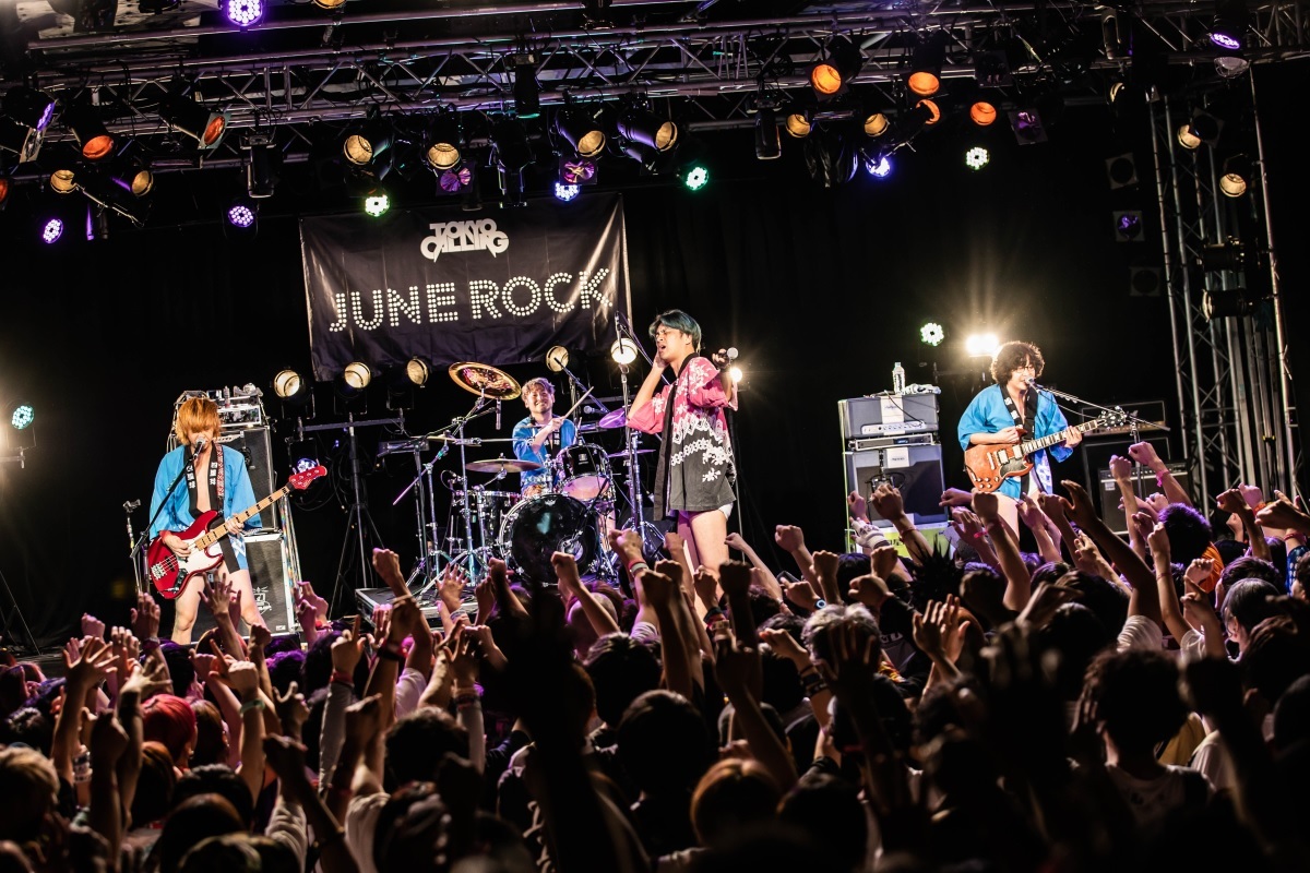 「for young」の演奏が終わると、鈴鹿秋斗(Dr)がマイクを握り、MCに参加。「『TOKYO CALLING』にお越しのみなさん、元気にしてましたか!? 元気ですかー!?」とオーディエンスを煽るが、ここで新宿を渋谷と間違うまさかのミステイク。会場は一転して和やかムードとなった。