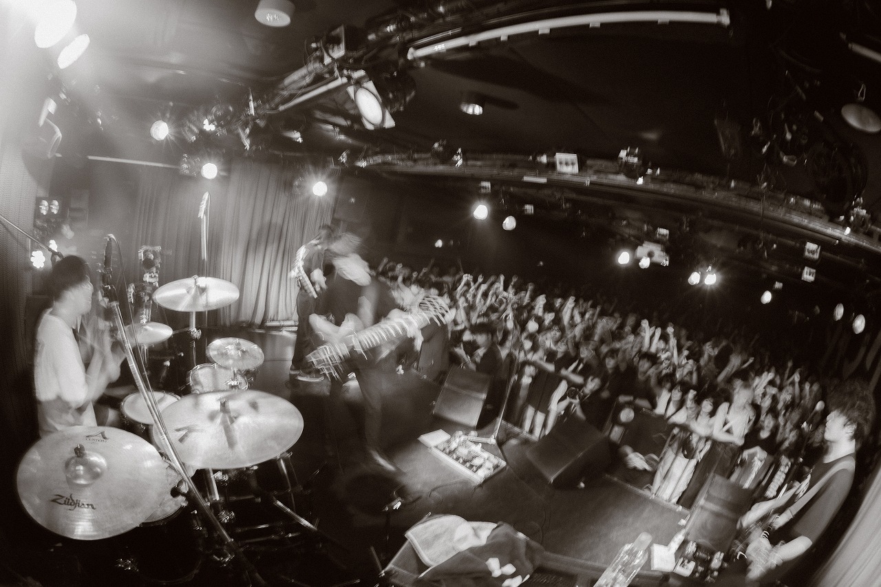 ど頭からテンション全開。爆音と演奏と北(Gt&Vo)の絶叫でシャングリラを埋める観客を圧倒すると、「いやいやいやいや!」の雄叫びから1曲目「いやいやいやいや」でライブが始まる。ダイナミックなビートや爆音の中に繊細さを併せ持つ聴き応えある演奏、心に刺さるフレーズと胸に迫る悲痛なボーカル。「知りたい」、「tsuki ochi」と畳みかけると、ライブが進むごとにフロアの熱気がぐんぐん上がっていくのが分かる。エモーショナルな「俗生活の行方」に続くインストナンバー「fossil」は、クーラーNAKANO(Gt)の表情豊かなギタープレイが光り、高い演奏力で激しくも丁寧に楽曲世界を描き、激情的な歌と演奏でぶっ放した「荻窪」は、《なんて言うなよ!》のフレーズを観客が合わせて、多くの魅せ場を作った彼ら。